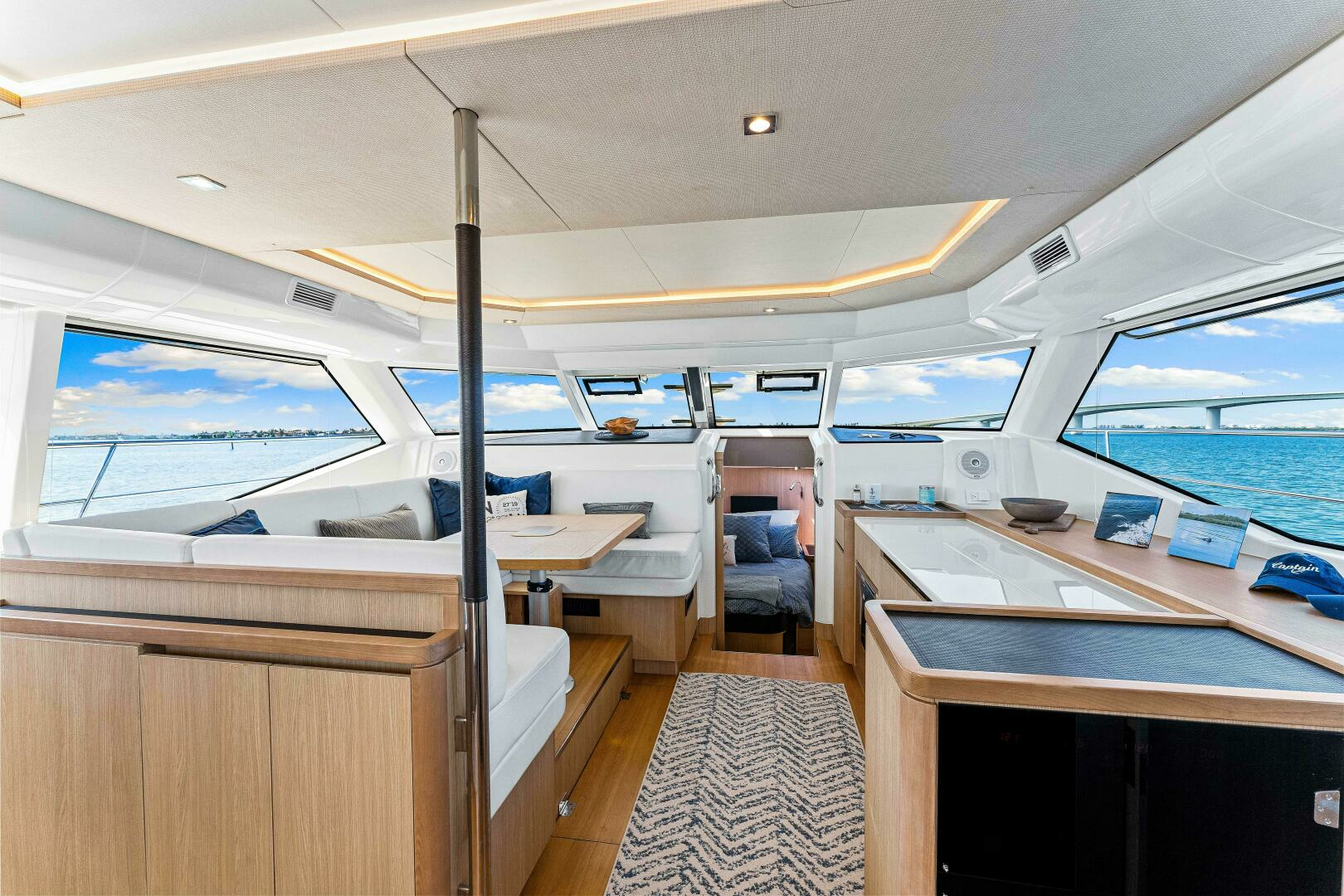- Opening window to aft deck with fold down bar