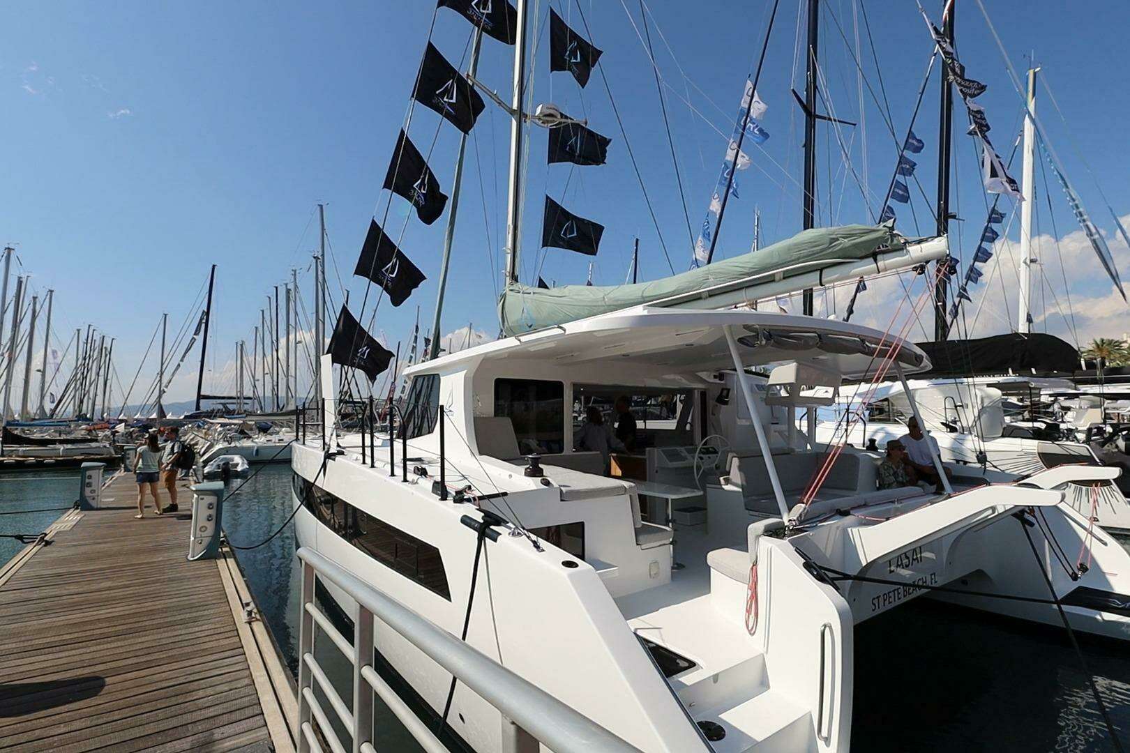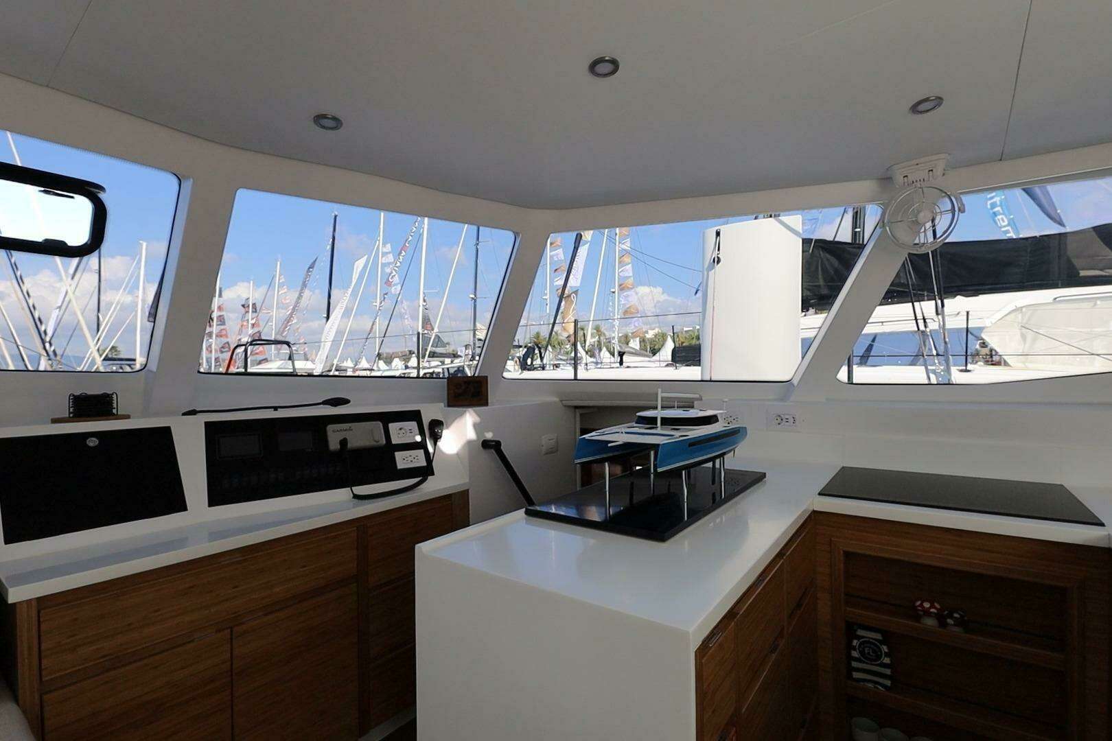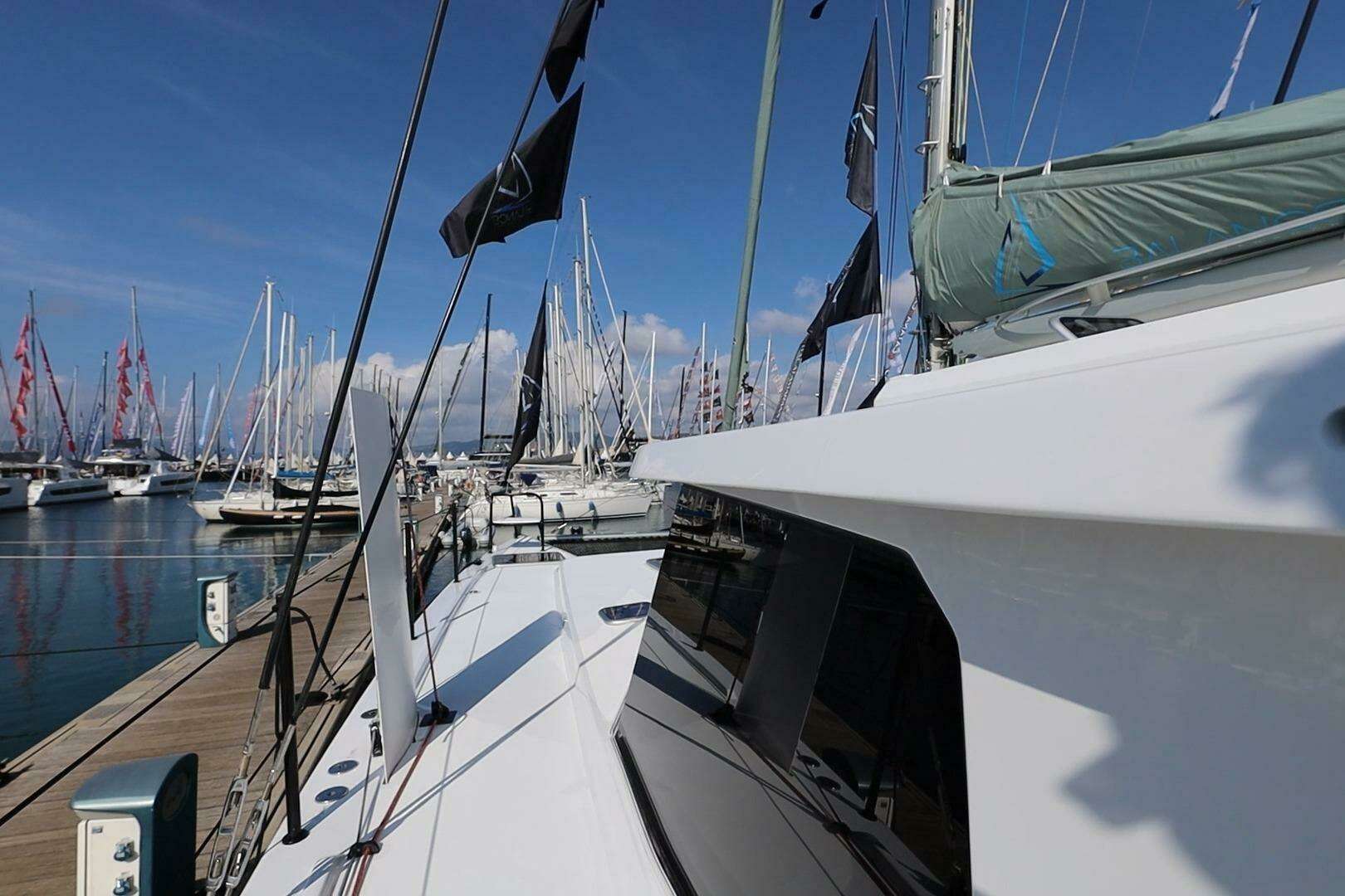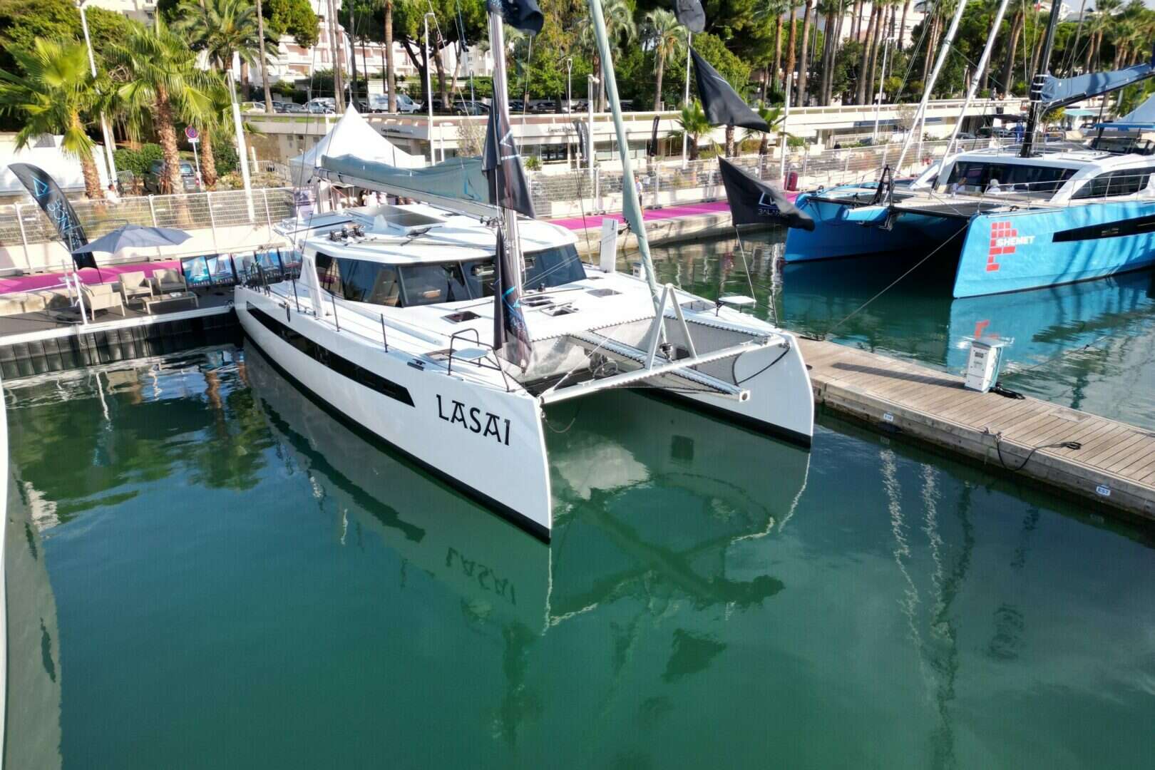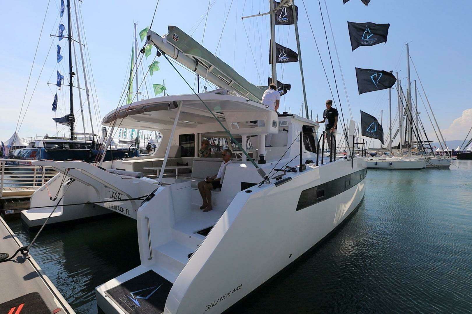 Balance 442 Lasai DEMO BOAT - New ArrivalLasai is a Balance 442 performance-cruising catamaran designed by Phillip Berman and Anton du Toit and built by Balance Catamarans in Cape Town, South Africa. Launched in late 2023 and showcased as DEMO boat at the International Multihull Show in La Grande-Motte 2024, she represents the Balance ethos: a light, carbon-reinforced, daggerboard catamaran that blends true sailing performance with comfort and easily managed sail handling.Specifications Designer: Phillip Berman & Anton du Toit Builder: Balance Catamarans, Cape Town, South Africa Model: Balance 442 Length overall: 13.50 m (444) Beam: 7.60 m (2411) Draft: 1.15 m / 39 (boards up) 2.15 m / 71 (boards down) Light displacement: approx. 10,750 kg Sail area (main + self-tacking jib): ~112 m / 1,205 sq ft Mast height above waterline: ~655 Fuel capacity: 2 400 L (2 106 gal) Fresh water capacity: 2 350 L (2 92 gal) Black water tanks: 2 42 L (2 11 gal) Engines: Twin Yanmar diesel, saildrives, with a bit more than 600 working hoursHighlights Carbon-reinforced composite construction with foam core for strength and weight savings Twin daggerboards for upwind performance and shoal-draft versatility Fractional sloop rig with self-tacking jib for easy single/short-handed handling Bright interior with U-shaped galley, generous storage, and approx. 68 (203 cm) headroom Proven offshore design: light, efficient, and seakindly with excellent bridgedeck clearanceThe agile multi-tasker is SAIL magazines Best Boat winner for 2023.Shes the ideal performance cruiser for island hoppers yet fully capable of trans-oceanic adventure travel. With her carbon reinforced foam core hulls and powerful sail plan the Balance 442 is a fast and able voyager. With her powerful 1, 205-square foot-sail plan the Balance 442 ghosts along in 5 knots of wind while others are burning diesel. But when its blowing, furl in her headsails, reef her down, and fly. She is built to withstand the worst weather.Configuration Owners version (3 cabins) with daggerboards, hull colour: white.Rig & Sails Ullman fully-battened square-top mainsail, ADSL tri-radial grey laminate, with Sunbrella stack pack. Ullman furling jib, ADSL tri-radial grey laminate with Sunbrella UV cover. Ullman screecher (CZ60 silver fabric) with Facnor hardware Spinnaker hardware fitted to mast and deck Asym Spinnaker Canvas sunshade for front tramp Harken winches: 1 40.2 STA manual on port foredeck (spinnaker & Code-0 halyard). 2 40.2 STA manual aft (lifting dinghy, daggerboards, spinnaker/Code-0). Fishbone boom upgrade.Propulsion & Running Gear Engine upgrade: 2 Yanmar 3JH40CR (40 hp) with SD60 saildrives (upgrade from 30 hp). Propellers: 2 Bruntons Varifold 3-blade 18" 15" folding props. Epoxy barrier coat + 2 coats black self-polishing antifouling.Energy, Power & Outlets 48 V / 20 kWh lithium-ion system (upgrade from gel), with 220 V supply to galley / cooker top / microwave / water heaters. Induction cooktop: Smeg 220 V, 60 cm, 4-plate (available only with Li-ion upgrade). Microwave: Whirlpool 40 L convection (available only with Li-ion upgrade). Solar: 2 units of 400 W SunPower panels on cockpit roof with individual Victron MPPT regulators (package). Additional pair on cockpit roof with individual regulator (in total 4 400 W = 1.6 kW). Additional 220 V outlets: 11 (Euro, 2-pin + dual USB-A).Air-con & battery note (selected): 10,000 BTU air-con to owners cabin and upgrade to 3 24 V / 5 kWh lithium-ion batteries (as per order sheet language).Navigation & Electronics (Garmin system) GPSMAP 12" MFD at upper helm + additional 12" MFD at lower helm. Fantom 18 radar. Autopilot: Garmin linear drive with control head (upper) + additional control head and 1 data screen (lower). Instruments: 2 Garmin GHC 20 (wind/depth/speed/multi) at upper helm. AIS: Garmin AIS 800 (send/receive). VHF: Garmin 215i at chart table. Charts: Garmin Europe chart loaded.Deck, Cockpit & Exterior Telescopic table bases for cockpit and saloon + filler cushions for both tables. Cockpit sunshade awnings, grey mesh, incl. built-in awnings (stbd sunbed & aft cockpit middle). Transom shower (aluminium finish, pop-up, hot/cold) on starboard. Salt-water deck-wash at transom & bow with fresh-water cross-over. SUP storage racks under coachroof. Forepeak shelving & hardpoints for organisers/hanging rails. Fishing rod holders: 2 black aluminium with drains. Electric Kenyon IntelliKEN (120 V) grill in cockpit (no lid). Cockpit fridge under lower helm seat Size-41 deck hatches in forward-facing saloon windows (2). Maxwell AA560 windlass switch & chain counter at helm. Carbon dock-line chafe plates 10 Carbonautic 900 mm (36") GFC sports wheelInterior, Galley & Utilities Washer/dryer Watermaker Ventura 200T Marine Starlink Fuel-transfer pump with on-board fuel-polishing function. Extra saloon fan (galley).Layout Changes & Custom Extras Port aft cabin converted to an office with double pull-out bed. Size-10 hatch over port aft cabin. Custom Balance drying rack behind galley sink. Solstice mesh on exterior of saloon windows. Custom integrated helm seat upgrade (no 3rd pole). Close-off under nav table with 2 doors + shelving.Tender: Highfield CL340 w/ 20hp YamahaFull air-con installation to all cabinsSoft Goods / Finishes (selected choices) Interior flooring: Sylvan Cedar. Saloon settee fabric: Romo Veranda Hopsack. Cockpit seating fabric: Romo Yara / Indium. Stack pack cover colour: Sunbrella Spa.Gorgeous Interior DesignWith her owner-version configuration, the Balance 442 easily accommodates six people. And Balances innovative salon table converts into a queen-size bed so you can always host another couple. It is also a place to hang out, read a book, or sleep when your partner is on watch. Her master shower aft is luxurious. The 442 sports 610 of headroom, boasts a large U-shaped galley, and offers more real wood, hand-made cabinetry, than any catamaran of her size and class.Award-Winning VersaHelmThe 442 delivers the mo