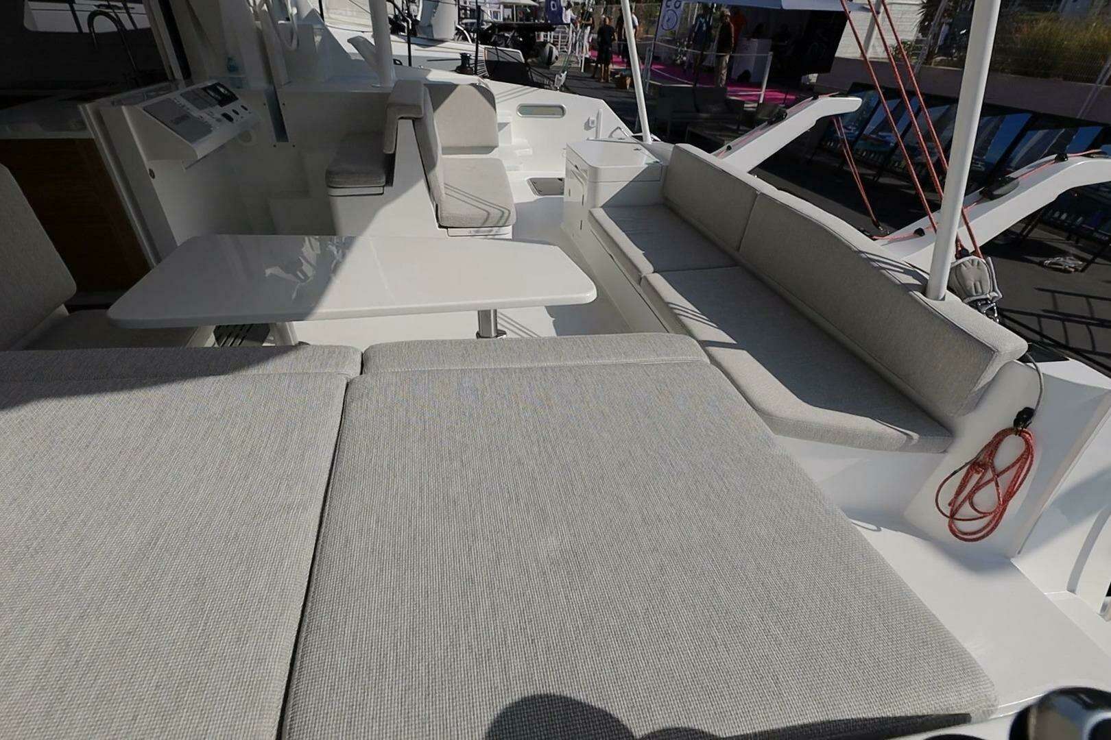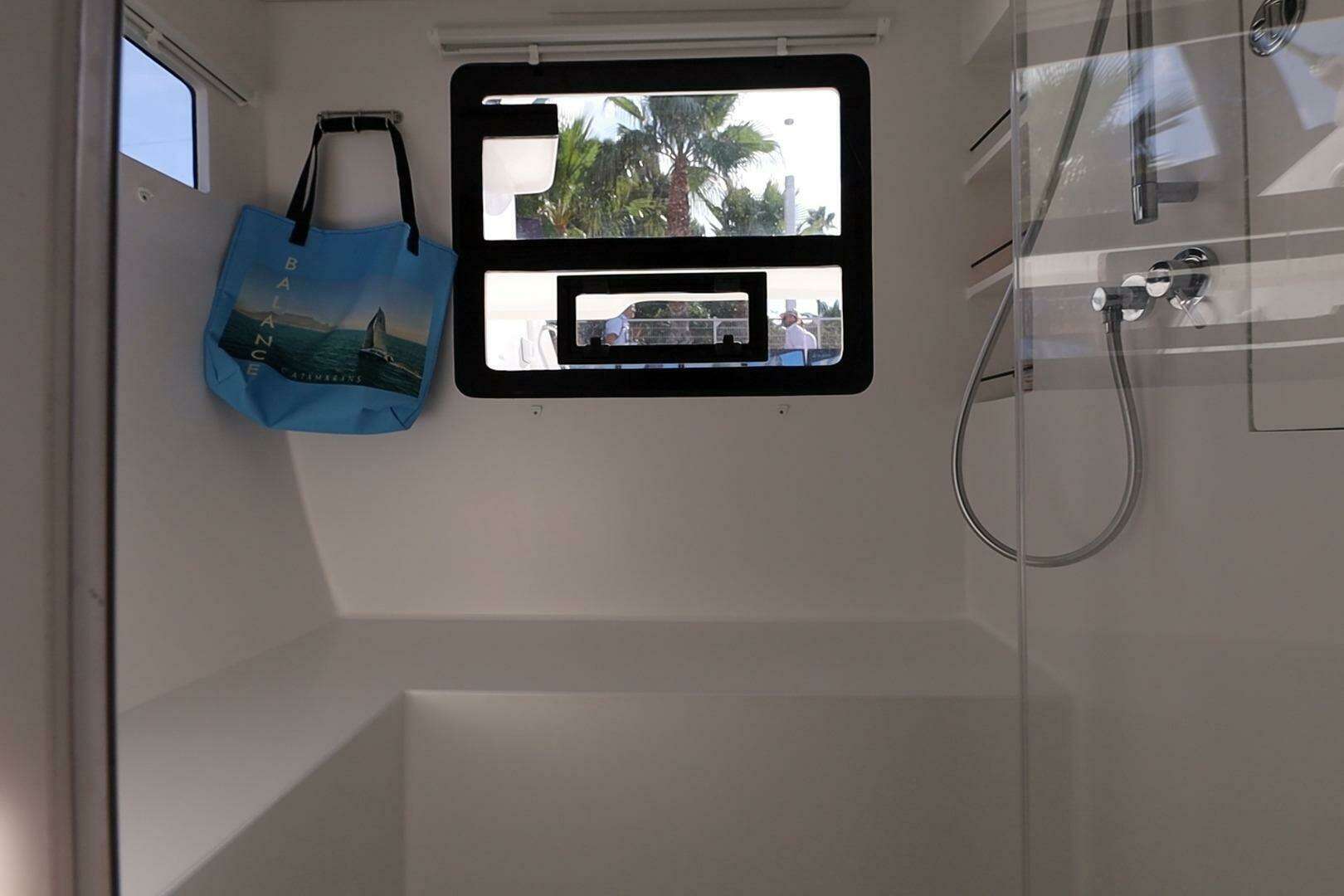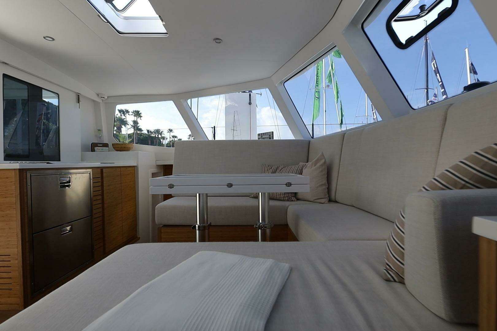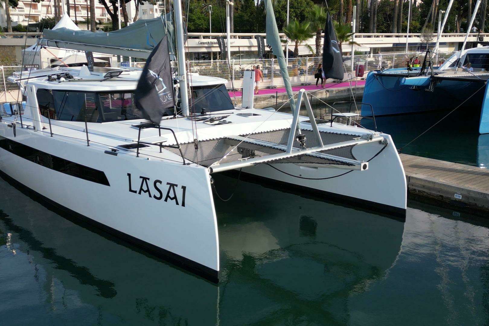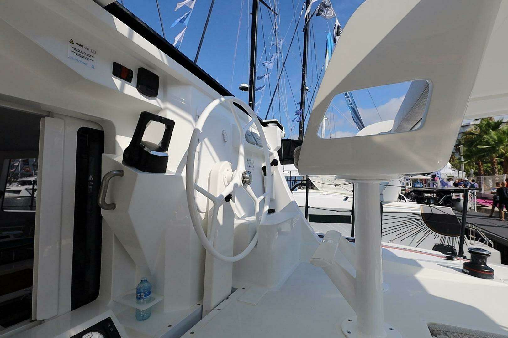 Balance 442 Lasai DEMO BOAT - New ArrivalLasai is a Balance 442 performance-cruising catamaran designed by Phillip Berman and Anton du Toit and built by Balance Catamarans in Cape Town, South Africa. Launched in late 2023 and showcased as DEMO boat at the International Multihull Show in La Grande-Motte 2024, she represents the Balance ethos: a light, carbon-reinforced, daggerboard catamaran that blends true sailing performance with comfort and easily managed sail handling.Specifications Designer: Phillip Berman & Anton du Toit Builder: Balance Catamarans, Cape Town, South Africa Model: Balance 442 Length overall: 13.50 m (444) Beam: 7.60 m (2411) Draft: 1.15 m / 39 (boards up) 2.15 m / 71 (boards down) Light displacement: approx. 10,750 kg Sail area (main + self-tacking jib): ~112 m / 1,205 sq ft Mast height above waterline: ~655 Fuel capacity: 2 400 L (2 106 gal) Fresh water capacity: 2 350 L (2 92 gal) Black water tanks: 2 42 L (2 11 gal) Engines: Twin Yanmar diesel, saildrives, with a bit more than 600 working hoursHighlights Carbon-reinforced composite construction with foam core for strength and weight savings Twin daggerboards for upwind performance and shoal-draft versatility Fractional sloop rig with self-tacking jib for easy single/short-handed handling Bright interior with U-shaped galley, generous storage, and approx. 68 (203 cm) headroom Proven offshore design: light, efficient, and seakindly with excellent bridgedeck clearanceThe agile multi-tasker is SAIL magazines Best Boat winner for 2023.Shes the ideal performance cruiser for island hoppers yet fully capable of trans-oceanic adventure travel. With her carbon reinforced foam core hulls and powerful sail plan the Balance 442 is a fast and able voyager. With her powerful 1, 205-square foot-sail plan the Balance 442 ghosts along in 5 knots of wind while others are burning diesel. But when its blowing, furl in her headsails, reef her down, and fly. She is built to withstand the worst weather.Configuration Owners version (3 cabins) with daggerboards, hull colour: white.Rig & Sails Ullman fully-battened square-top mainsail, ADSL tri-radial grey laminate, with Sunbrella stack pack. Ullman furling jib, ADSL tri-radial grey laminate with Sunbrella UV cover. Ullman screecher (CZ60 silver fabric) with Facnor hardware Spinnaker hardware fitted to mast and deck Asym Spinnaker Canvas sunshade for front tramp Harken winches: 1 40.2 STA manual on port foredeck (spinnaker & Code-0 halyard). 2 40.2 STA manual aft (lifting dinghy, daggerboards, spinnaker/Code-0). Fishbone boom upgrade.Propulsion & Running Gear Engine upgrade: 2 Yanmar 3JH40CR (40 hp) with SD60 saildrives (upgrade from 30 hp). Propellers: 2 Bruntons Varifold 3-blade 18" 15" folding props. Epoxy barrier coat + 2 coats black self-polishing antifouling.Energy, Power & Outlets 48 V / 20 kWh lithium-ion system (upgrade from gel), with 220 V supply to galley / cooker top / microwave / water heaters. Induction cooktop: Smeg 220 V, 60 cm, 4-plate (available only with Li-ion upgrade). Microwave: Whirlpool 40 L convection (available only with Li-ion upgrade). Solar: 2 units of 400 W SunPower panels on cockpit roof with individual Victron MPPT regulators (package). Additional pair on cockpit roof with individual regulator (in total 4 400 W = 1.6 kW). Additional 220 V outlets: 11 (Euro, 2-pin + dual USB-A).Air-con & battery note (selected): 10,000 BTU air-con to owners cabin and upgrade to 3 24 V / 5 kWh lithium-ion batteries (as per order sheet language).Navigation & Electronics (Garmin system) GPSMAP 12" MFD at upper helm + additional 12" MFD at lower helm. Fantom 18 radar. Autopilot: Garmin linear drive with control head (upper) + additional control head and 1 data screen (lower). Instruments: 2 Garmin GHC 20 (wind/depth/speed/multi) at upper helm. AIS: Garmin AIS 800 (send/receive). VHF: Garmin 215i at chart table. Charts: Garmin Europe chart loaded.Deck, Cockpit & Exterior Telescopic table bases for cockpit and saloon + filler cushions for both tables. Cockpit sunshade awnings, grey mesh, incl. built-in awnings (stbd sunbed & aft cockpit middle). Transom shower (aluminium finish, pop-up, hot/cold) on starboard. Salt-water deck-wash at transom & bow with fresh-water cross-over. SUP storage racks under coachroof. Forepeak shelving & hardpoints for organisers/hanging rails. Fishing rod holders: 2 black aluminium with drains. Electric Kenyon IntelliKEN (120 V) grill in cockpit (no lid). Cockpit fridge under lower helm seat Size-41 deck hatches in forward-facing saloon windows (2). Maxwell AA560 windlass switch & chain counter at helm. Carbon dock-line chafe plates 10 Carbonautic 900 mm (36") GFC sports wheelInterior, Galley & Utilities Washer/dryer Watermaker Ventura 200T Marine Starlink Fuel-transfer pump with on-board fuel-polishing function. Extra saloon fan (galley).Layout Changes & Custom Extras Port aft cabin converted to an office with double pull-out bed. Size-10 hatch over port aft cabin. Custom Balance drying rack behind galley sink. Solstice mesh on exterior of saloon windows. Custom integrated helm seat upgrade (no 3rd pole). Close-off under nav table with 2 doors + shelving.Tender: Highfield CL340 w/ 20hp YamahaFull air-con installation to all cabinsSoft Goods / Finishes (selected choices) Interior flooring: Sylvan Cedar. Saloon settee fabric: Romo Veranda Hopsack. Cockpit seating fabric: Romo Yara / Indium. Stack pack cover colour: Sunbrella Spa.Gorgeous Interior DesignWith her owner-version configuration, the Balance 442 easily accommodates six people. And Balances innovative salon table converts into a queen-size bed so you can always host another couple. It is also a place to hang out, read a book, or sleep when your partner is on watch. Her master shower aft is luxurious. The 442 sports 610 of headroom, boasts a large U-shaped galley, and offers more real wood, hand-made cabinetry, than any catamaran of her size and class.Award-Winning VersaHelmThe 442 delivers the mo