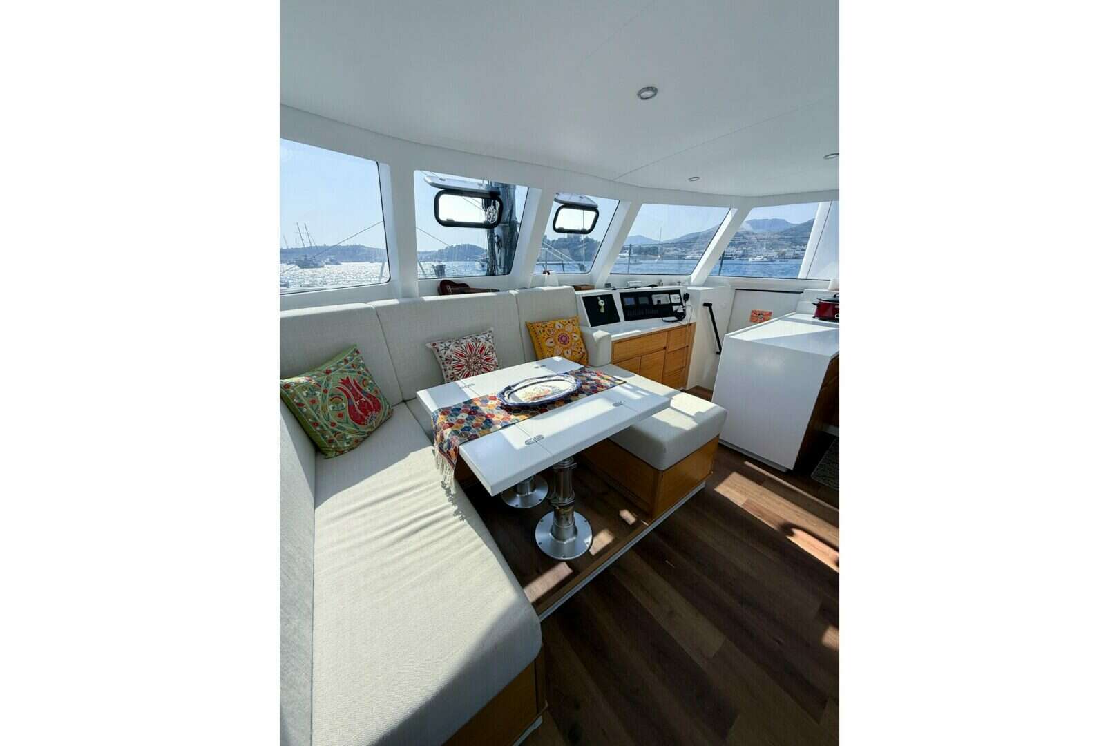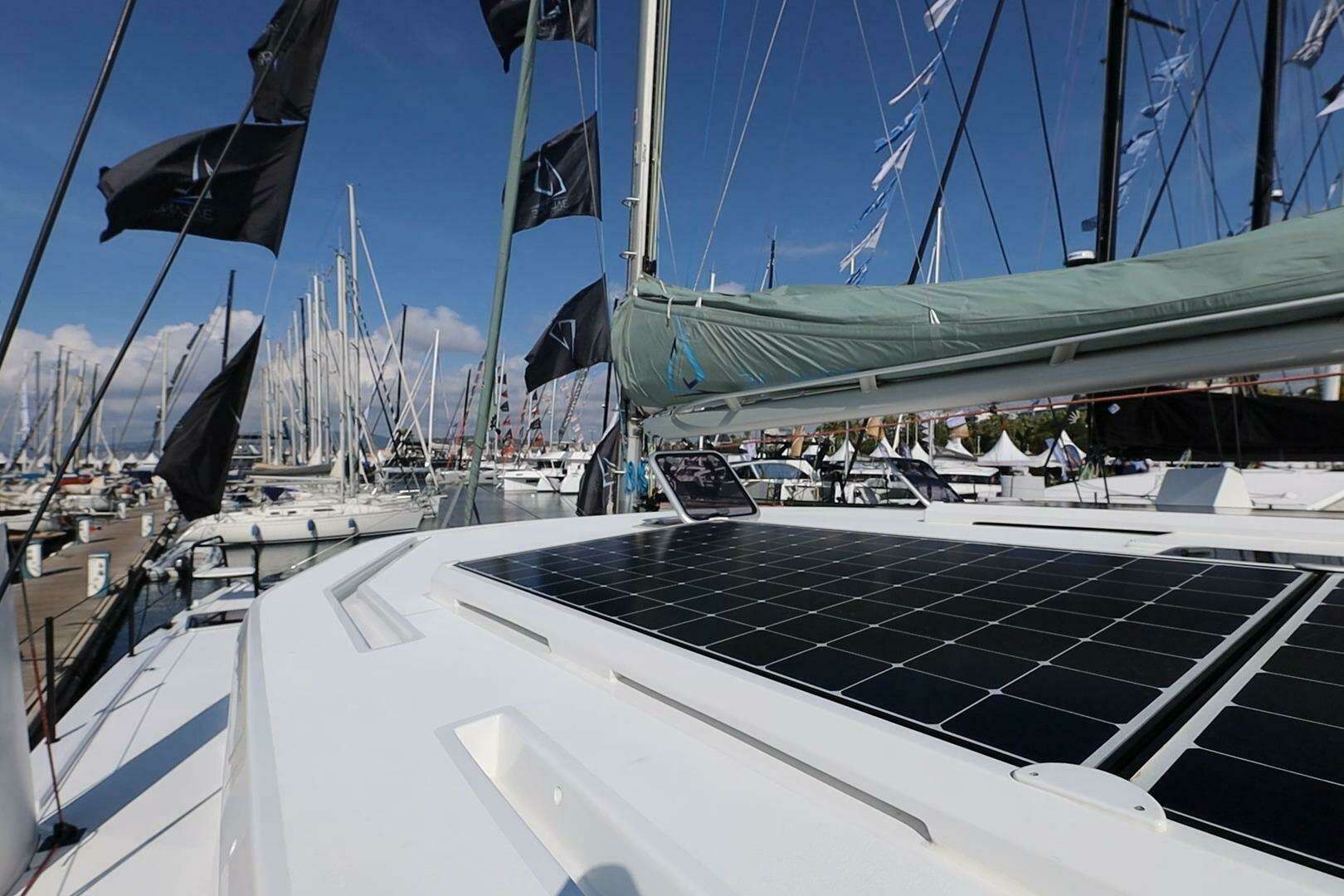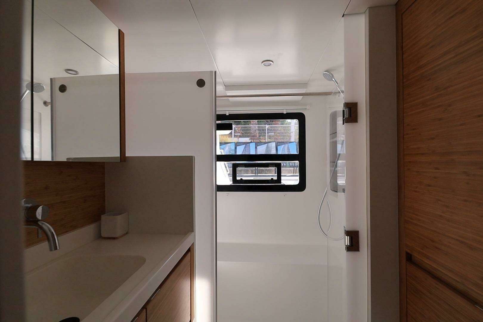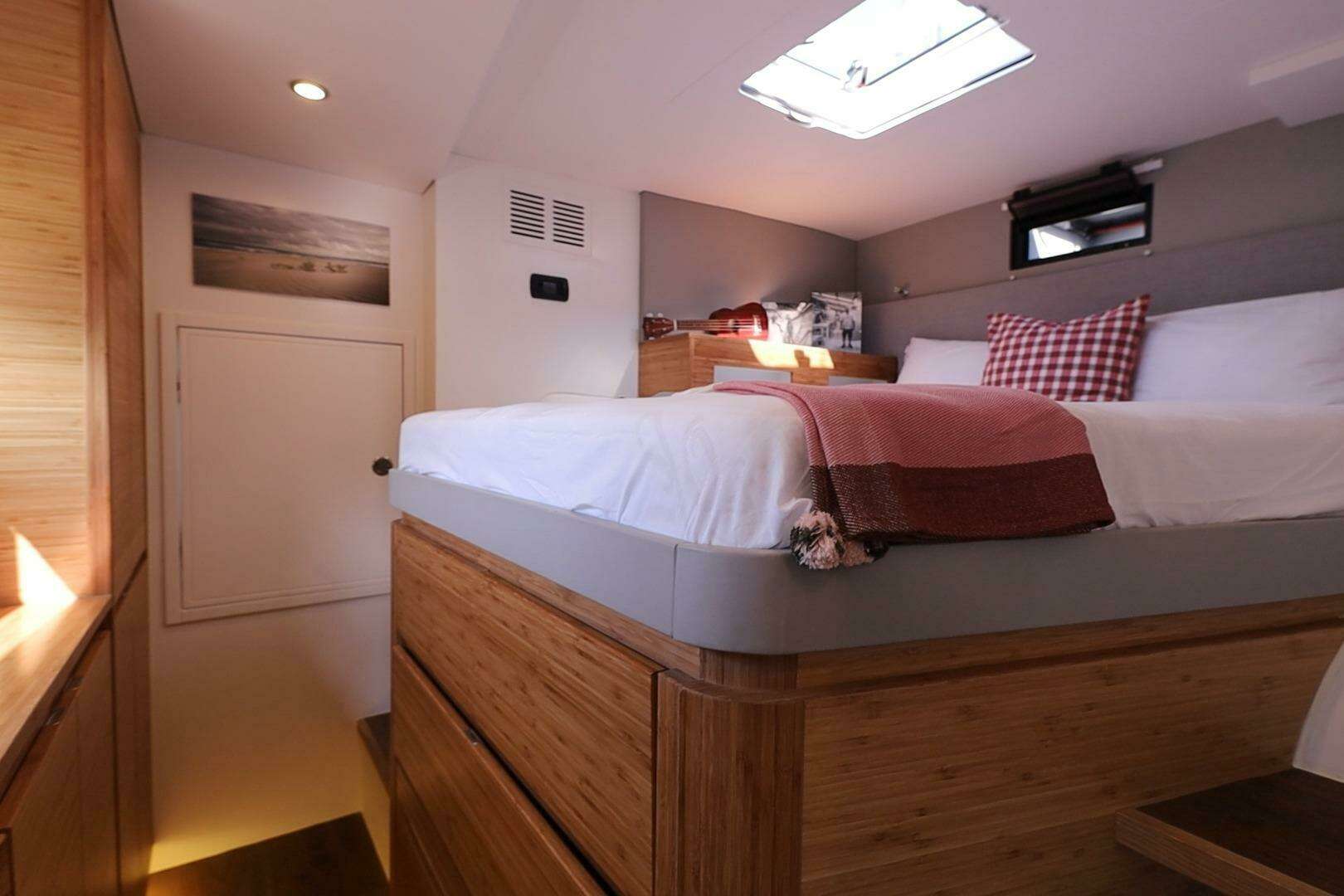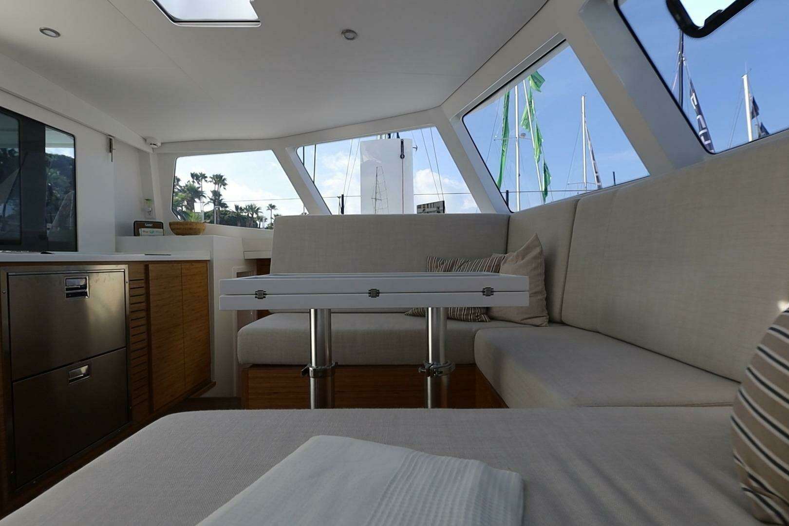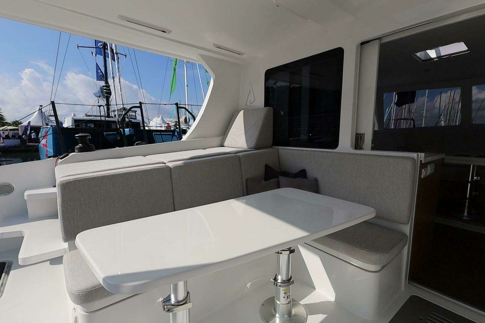 Balance 442 Lasai DEMO BOAT - New ArrivalLasai is a Balance 442 performance-cruising catamaran designed by Phillip Berman and Anton du Toit and built by Balance Catamarans in Cape Town, South Africa. Launched in late 2023 and showcased as DEMO boat at the International Multihull Show in La Grande-Motte 2024, she represents the Balance ethos: a light, carbon-reinforced, daggerboard catamaran that blends true sailing performance with comfort and easily managed sail handling.Specifications Designer: Phillip Berman & Anton du Toit Builder: Balance Catamarans, Cape Town, South Africa Model: Balance 442 Length overall: 13.50 m (444) Beam: 7.60 m (2411) Draft: 1.15 m / 39 (boards up) 2.15 m / 71 (boards down) Light displacement: approx. 10,750 kg Sail area (main + self-tacking jib): ~112 m / 1,205 sq ft Mast height above waterline: ~655 Fuel capacity: 2 400 L (2 106 gal) Fresh water capacity: 2 350 L (2 92 gal) Black water tanks: 2 42 L (2 11 gal) Engines: Twin Yanmar diesel, saildrives, with a bit more than 600 working hoursHighlights Carbon-reinforced composite construction with foam core for strength and weight savings Twin daggerboards for upwind performance and shoal-draft versatility Fractional sloop rig with self-tacking jib for easy single/short-handed handling Bright interior with U-shaped galley, generous storage, and approx. 68 (203 cm) headroom Proven offshore design: light, efficient, and seakindly with excellent bridgedeck clearanceThe agile multi-tasker is SAIL magazines Best Boat winner for 2023.Shes the ideal performance cruiser for island hoppers yet fully capable of trans-oceanic adventure travel. With her carbon reinforced foam core hulls and powerful sail plan the Balance 442 is a fast and able voyager. With her powerful 1, 205-square foot-sail plan the Balance 442 ghosts along in 5 knots of wind while others are burning diesel. But when its blowing, furl in her headsails, reef her down, and fly. She is built to withstand the worst weather.Configuration Owners version (3 cabins) with daggerboards, hull colour: white.Rig & Sails Ullman fully-battened square-top mainsail, ADSL tri-radial grey laminate, with Sunbrella stack pack. Ullman furling jib, ADSL tri-radial grey laminate with Sunbrella UV cover. Ullman screecher (CZ60 silver fabric) with Facnor hardware Spinnaker hardware fitted to mast and deck Asym Spinnaker Canvas sunshade for front tramp Harken winches: 1 40.2 STA manual on port foredeck (spinnaker & Code-0 halyard). 2 40.2 STA manual aft (lifting dinghy, daggerboards, spinnaker/Code-0). Fishbone boom upgrade.Propulsion & Running Gear Engine upgrade: 2 Yanmar 3JH40CR (40 hp) with SD60 saildrives (upgrade from 30 hp). Propellers: 2 Bruntons Varifold 3-blade 18" 15" folding props. Epoxy barrier coat + 2 coats black self-polishing antifouling.Energy, Power & Outlets 48 V / 20 kWh lithium-ion system (upgrade from gel), with 220 V supply to galley / cooker top / microwave / water heaters. Induction cooktop: Smeg 220 V, 60 cm, 4-plate (available only with Li-ion upgrade). Microwave: Whirlpool 40 L convection (available only with Li-ion upgrade). Solar: 2 units of 400 W SunPower panels on cockpit roof with individual Victron MPPT regulators (package). Additional pair on cockpit roof with individual regulator (in total 4 400 W = 1.6 kW). Additional 220 V outlets: 11 (Euro, 2-pin + dual USB-A).Air-con & battery note (selected): 10,000 BTU air-con to owners cabin and upgrade to 3 24 V / 5 kWh lithium-ion batteries (as per order sheet language).Navigation & Electronics (Garmin system) GPSMAP 12" MFD at upper helm + additional 12" MFD at lower helm. Fantom 18 radar. Autopilot: Garmin linear drive with control head (upper) + additional control head and 1 data screen (lower). Instruments: 2 Garmin GHC 20 (wind/depth/speed/multi) at upper helm. AIS: Garmin AIS 800 (send/receive). VHF: Garmin 215i at chart table. Charts: Garmin Europe chart loaded.Deck, Cockpit & Exterior Telescopic table bases for cockpit and saloon + filler cushions for both tables. Cockpit sunshade awnings, grey mesh, incl. built-in awnings (stbd sunbed & aft cockpit middle). Transom shower (aluminium finish, pop-up, hot/cold) on starboard. Salt-water deck-wash at transom & bow with fresh-water cross-over. SUP storage racks under coachroof. Forepeak shelving & hardpoints for organisers/hanging rails. Fishing rod holders: 2 black aluminium with drains. Electric Kenyon IntelliKEN (120 V) grill in cockpit (no lid). Cockpit fridge under lower helm seat Size-41 deck hatches in forward-facing saloon windows (2). Maxwell AA560 windlass switch & chain counter at helm. Carbon dock-line chafe plates 10 Carbonautic 900 mm (36") GFC sports wheelInterior, Galley & Utilities Washer/dryer Watermaker Ventura 200T Marine Starlink Fuel-transfer pump with on-board fuel-polishing function. Extra saloon fan (galley).Layout Changes & Custom Extras Port aft cabin converted to an office with double pull-out bed. Size-10 hatch over port aft cabin. Custom Balance drying rack behind galley sink. Solstice mesh on exterior of saloon windows. Custom integrated helm seat upgrade (no 3rd pole). Close-off under nav table with 2 doors + shelving.Tender: Highfield CL340 w/ 20hp YamahaFull air-con installation to all cabinsSoft Goods / Finishes (selected choices) Interior flooring: Sylvan Cedar. Saloon settee fabric: Romo Veranda Hopsack. Cockpit seating fabric: Romo Yara / Indium. Stack pack cover colour: Sunbrella Spa.Gorgeous Interior DesignWith her owner-version configuration, the Balance 442 easily accommodates six people. And Balances innovative salon table converts into a queen-size bed so you can always host another couple. It is also a place to hang out, read a book, or sleep when your partner is on watch. Her master shower aft is luxurious. The 442 sports 610 of headroom, boasts a large U-shaped galley, and offers more real wood, hand-made cabinetry, than any catamaran of her size and class.Award-Winning VersaHelmThe 442 delivers the mo