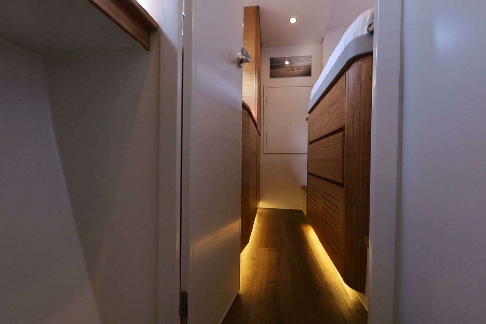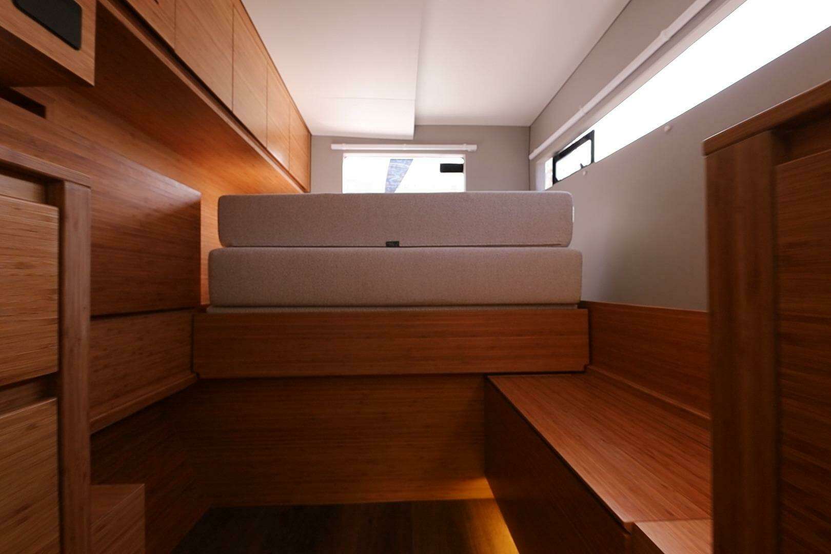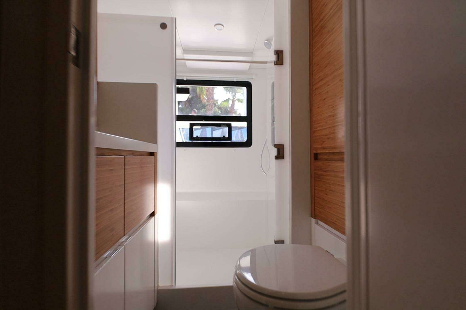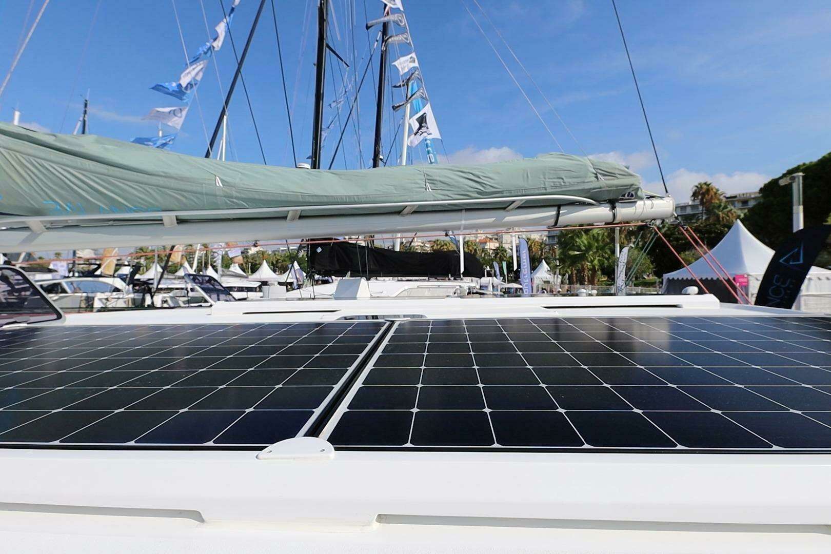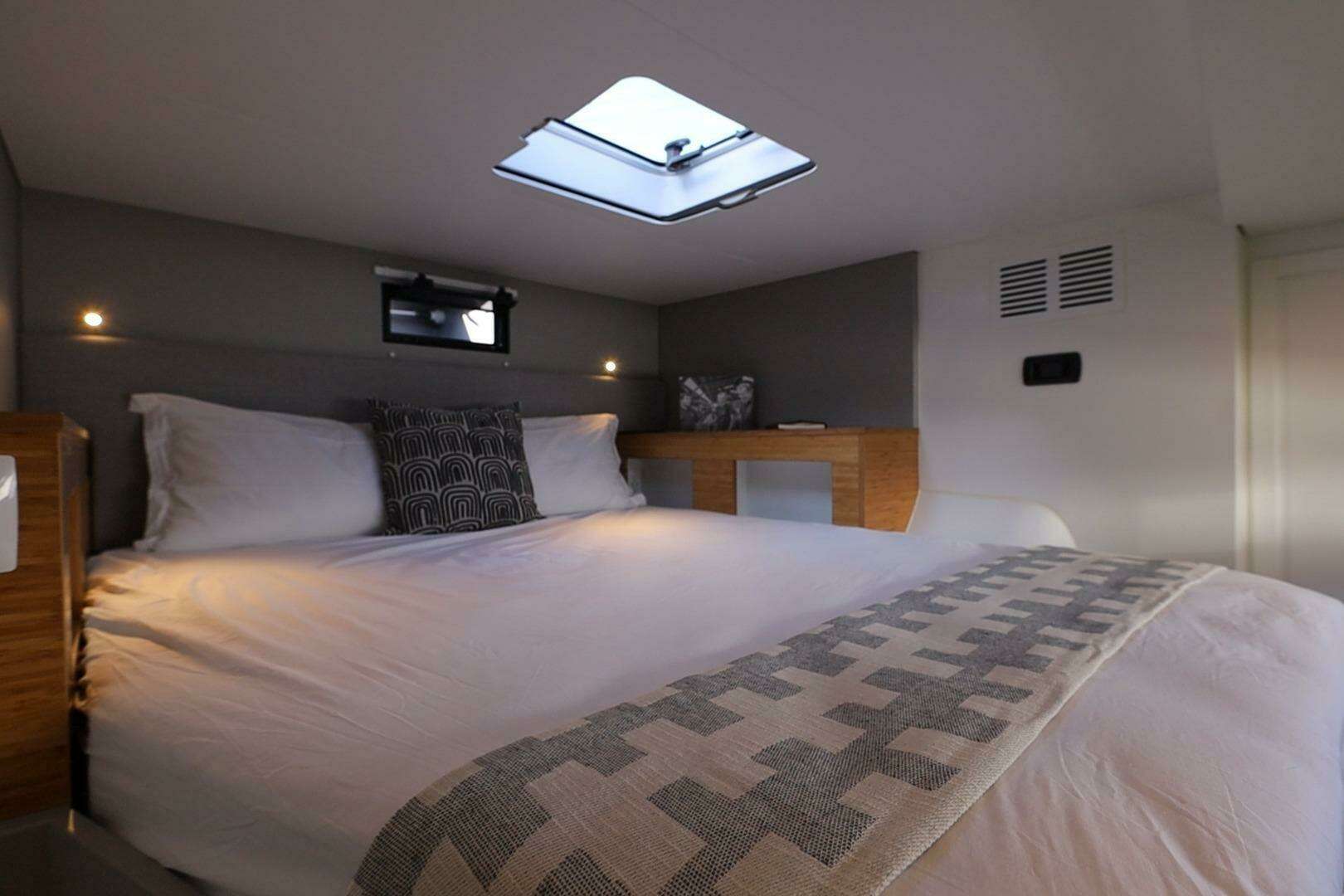 Balance 442 Lasai DEMO BOAT - New ArrivalLasai is a Balance 442 performance-cruising catamaran designed by Phillip Berman and Anton du Toit and built by Balance Catamarans in Cape Town, South Africa. Launched in late 2023 and showcased as DEMO boat at the International Multihull Show in La Grande-Motte 2024, she represents the Balance ethos: a light, carbon-reinforced, daggerboard catamaran that blends true sailing performance with comfort and easily managed sail handling.Specifications Designer: Phillip Berman & Anton du Toit Builder: Balance Catamarans, Cape Town, South Africa Model: Balance 442 Length overall: 13.50 m (444) Beam: 7.60 m (2411) Draft: 1.15 m / 39 (boards up) 2.15 m / 71 (boards down) Light displacement: approx. 10,750 kg Sail area (main + self-tacking jib): ~112 m / 1,205 sq ft Mast height above waterline: ~655 Fuel capacity: 2 400 L (2 106 gal) Fresh water capacity: 2 350 L (2 92 gal) Black water tanks: 2 42 L (2 11 gal) Engines: Twin Yanmar diesel, saildrives, with a bit more than 600 working hoursHighlights Carbon-reinforced composite construction with foam core for strength and weight savings Twin daggerboards for upwind performance and shoal-draft versatility Fractional sloop rig with self-tacking jib for easy single/short-handed handling Bright interior with U-shaped galley, generous storage, and approx. 68 (203 cm) headroom Proven offshore design: light, efficient, and seakindly with excellent bridgedeck clearanceThe agile multi-tasker is SAIL magazines Best Boat winner for 2023.Shes the ideal performance cruiser for island hoppers yet fully capable of trans-oceanic adventure travel. With her carbon reinforced foam core hulls and powerful sail plan the Balance 442 is a fast and able voyager. With her powerful 1, 205-square foot-sail plan the Balance 442 ghosts along in 5 knots of wind while others are burning diesel. But when its blowing, furl in her headsails, reef her down, and fly. She is built to withstand the worst weather.Configuration Owners version (3 cabins) with daggerboards, hull colour: white.Rig & Sails Ullman fully-battened square-top mainsail, ADSL tri-radial grey laminate, with Sunbrella stack pack. Ullman furling jib, ADSL tri-radial grey laminate with Sunbrella UV cover. Ullman screecher (CZ60 silver fabric) with Facnor hardware Spinnaker hardware fitted to mast and deck Asym Spinnaker Canvas sunshade for front tramp Harken winches: 1 40.2 STA manual on port foredeck (spinnaker & Code-0 halyard). 2 40.2 STA manual aft (lifting dinghy, daggerboards, spinnaker/Code-0). Fishbone boom upgrade.Propulsion & Running Gear Engine upgrade: 2 Yanmar 3JH40CR (40 hp) with SD60 saildrives (upgrade from 30 hp). Propellers: 2 Bruntons Varifold 3-blade 18" 15" folding props. Epoxy barrier coat + 2 coats black self-polishing antifouling.Energy, Power & Outlets 48 V / 20 kWh lithium-ion system (upgrade from gel), with 220 V supply to galley / cooker top / microwave / water heaters. Induction cooktop: Smeg 220 V, 60 cm, 4-plate (available only with Li-ion upgrade). Microwave: Whirlpool 40 L convection (available only with Li-ion upgrade). Solar: 2 units of 400 W SunPower panels on cockpit roof with individual Victron MPPT regulators (package). Additional pair on cockpit roof with individual regulator (in total 4 400 W = 1.6 kW). Additional 220 V outlets: 11 (Euro, 2-pin + dual USB-A).Air-con & battery note (selected): 10,000 BTU air-con to owners cabin and upgrade to 3 24 V / 5 kWh lithium-ion batteries (as per order sheet language).Navigation & Electronics (Garmin system) GPSMAP 12" MFD at upper helm + additional 12" MFD at lower helm. Fantom 18 radar. Autopilot: Garmin linear drive with control head (upper) + additional control head and 1 data screen (lower). Instruments: 2 Garmin GHC 20 (wind/depth/speed/multi) at upper helm. AIS: Garmin AIS 800 (send/receive). VHF: Garmin 215i at chart table. Charts: Garmin Europe chart loaded.Deck, Cockpit & Exterior Telescopic table bases for cockpit and saloon + filler cushions for both tables. Cockpit sunshade awnings, grey mesh, incl. built-in awnings (stbd sunbed & aft cockpit middle). Transom shower (aluminium finish, pop-up, hot/cold) on starboard. Salt-water deck-wash at transom & bow with fresh-water cross-over. SUP storage racks under coachroof. Forepeak shelving & hardpoints for organisers/hanging rails. Fishing rod holders: 2 black aluminium with drains. Electric Kenyon IntelliKEN (120 V) grill in cockpit (no lid). Cockpit fridge under lower helm seat Size-41 deck hatches in forward-facing saloon windows (2). Maxwell AA560 windlass switch & chain counter at helm. Carbon dock-line chafe plates 10 Carbonautic 900 mm (36") GFC sports wheelInterior, Galley & Utilities Washer/dryer Watermaker Ventura 200T Marine Starlink Fuel-transfer pump with on-board fuel-polishing function. Extra saloon fan (galley).Layout Changes & Custom Extras Port aft cabin converted to an office with double pull-out bed. Size-10 hatch over port aft cabin. Custom Balance drying rack behind galley sink. Solstice mesh on exterior of saloon windows. Custom integrated helm seat upgrade (no 3rd pole). Close-off under nav table with 2 doors + shelving.Tender: Highfield CL340 w/ 20hp YamahaFull air-con installation to all cabinsSoft Goods / Finishes (selected choices) Interior flooring: Sylvan Cedar. Saloon settee fabric: Romo Veranda Hopsack. Cockpit seating fabric: Romo Yara / Indium. Stack pack cover colour: Sunbrella Spa.Gorgeous Interior DesignWith her owner-version configuration, the Balance 442 easily accommodates six people. And Balances innovative salon table converts into a queen-size bed so you can always host another couple. It is also a place to hang out, read a book, or sleep when your partner is on watch. Her master shower aft is luxurious. The 442 sports 610 of headroom, boasts a large U-shaped galley, and offers more real wood, hand-made cabinetry, than any catamaran of her size and class.Award-Winning VersaHelmThe 442 delivers the mo