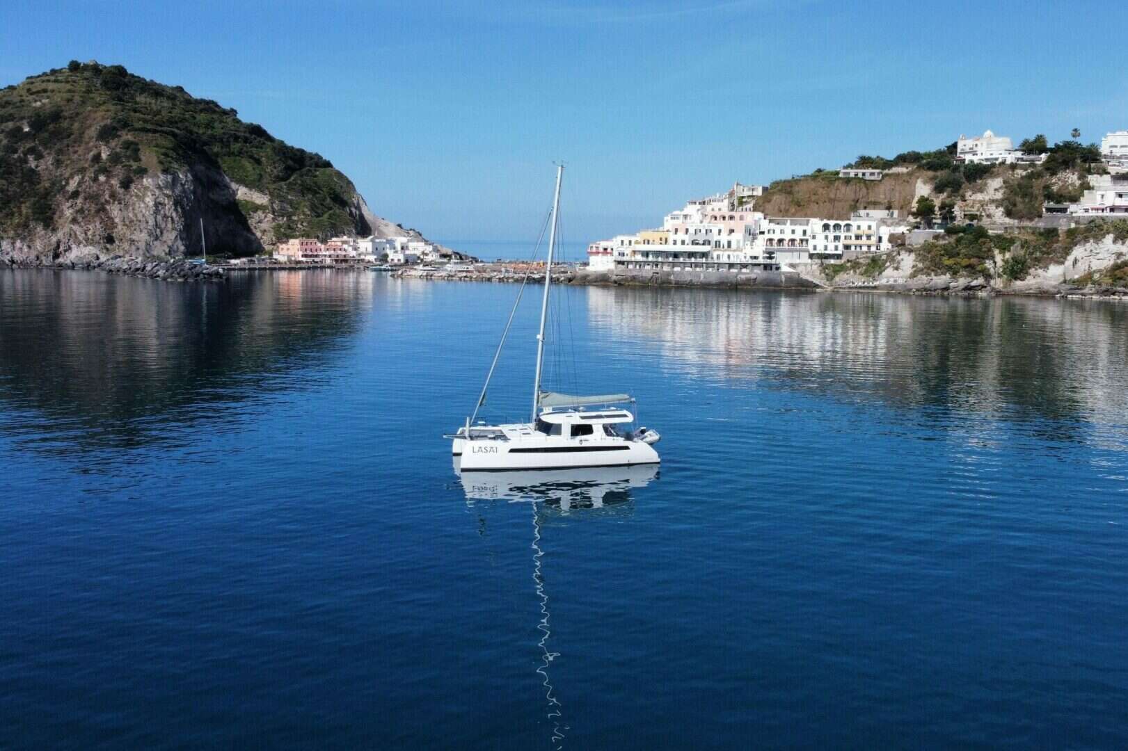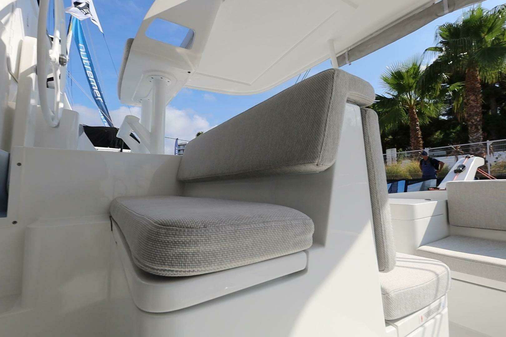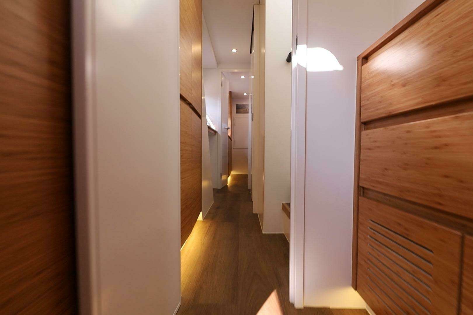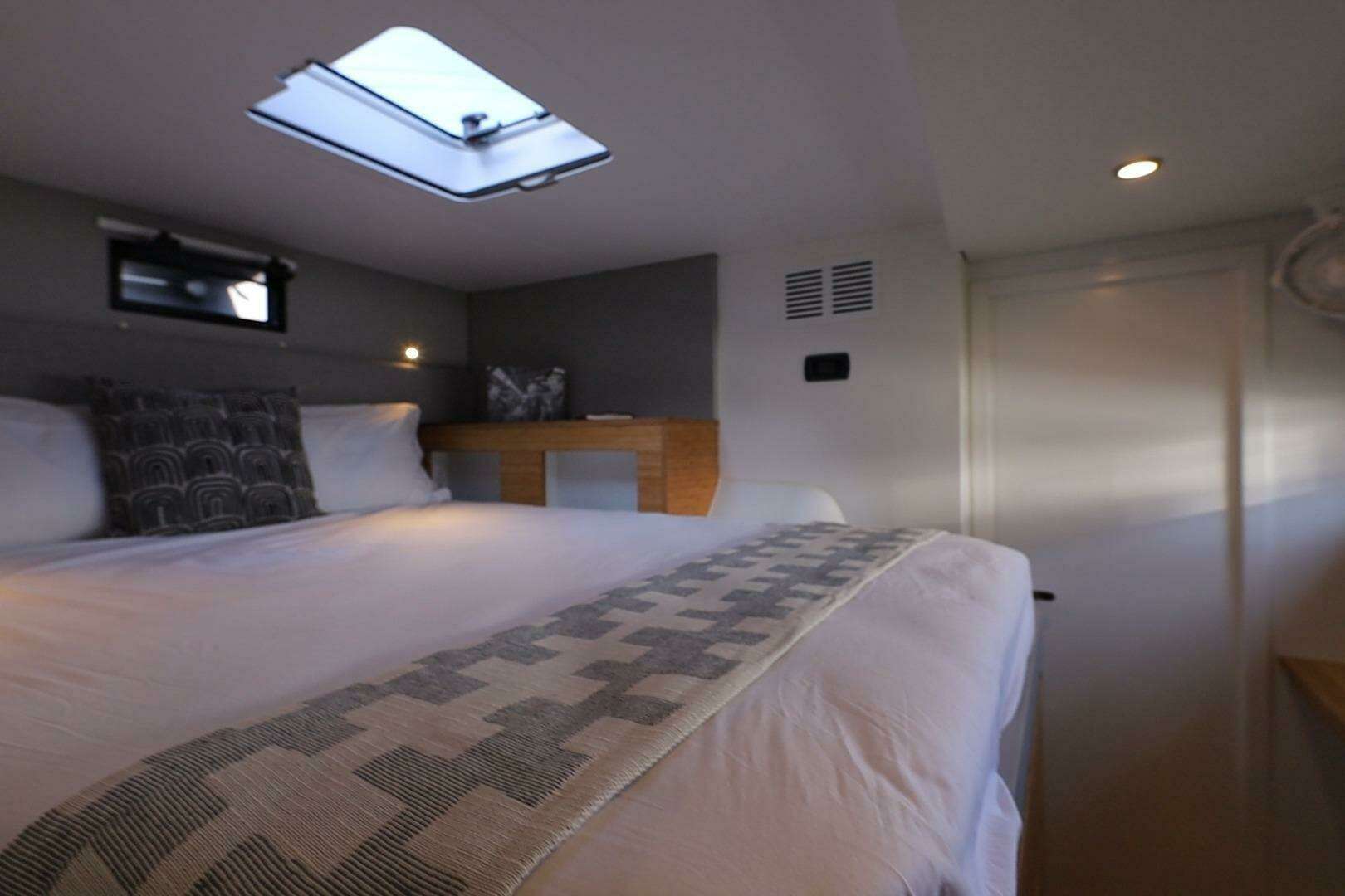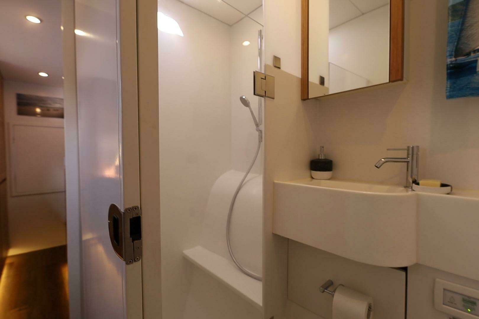 Balance 442 Lasai DEMO BOAT - New ArrivalLasai is a Balance 442 performance-cruising catamaran designed by Phillip Berman and Anton du Toit and built by Balance Catamarans in Cape Town, South Africa. Launched in late 2023 and showcased as DEMO boat at the International Multihull Show in La Grande-Motte 2024, she represents the Balance ethos: a light, carbon-reinforced, daggerboard catamaran that blends true sailing performance with comfort and easily managed sail handling.Specifications Designer: Phillip Berman & Anton du Toit Builder: Balance Catamarans, Cape Town, South Africa Model: Balance 442 Length overall: 13.50 m (444) Beam: 7.60 m (2411) Draft: 1.15 m / 39 (boards up) 2.15 m / 71 (boards down) Light displacement: approx. 10,750 kg Sail area (main + self-tacking jib): ~112 m / 1,205 sq ft Mast height above waterline: ~655 Fuel capacity: 2 400 L (2 106 gal) Fresh water capacity: 2 350 L (2 92 gal) Black water tanks: 2 42 L (2 11 gal) Engines: Twin Yanmar diesel, saildrives, with a bit more than 600 working hoursHighlights Carbon-reinforced composite construction with foam core for strength and weight savings Twin daggerboards for upwind performance and shoal-draft versatility Fractional sloop rig with self-tacking jib for easy single/short-handed handling Bright interior with U-shaped galley, generous storage, and approx. 68 (203 cm) headroom Proven offshore design: light, efficient, and seakindly with excellent bridgedeck clearanceThe agile multi-tasker is SAIL magazines Best Boat winner for 2023.Shes the ideal performance cruiser for island hoppers yet fully capable of trans-oceanic adventure travel. With her carbon reinforced foam core hulls and powerful sail plan the Balance 442 is a fast and able voyager. With her powerful 1, 205-square foot-sail plan the Balance 442 ghosts along in 5 knots of wind while others are burning diesel. But when its blowing, furl in her headsails, reef her down, and fly. She is built to withstand the worst weather.Configuration Owners version (3 cabins) with daggerboards, hull colour: white.Rig & Sails Ullman fully-battened square-top mainsail, ADSL tri-radial grey laminate, with Sunbrella stack pack. Ullman furling jib, ADSL tri-radial grey laminate with Sunbrella UV cover. Ullman screecher (CZ60 silver fabric) with Facnor hardware Spinnaker hardware fitted to mast and deck Asym Spinnaker Canvas sunshade for front tramp Harken winches: 1 40.2 STA manual on port foredeck (spinnaker & Code-0 halyard). 2 40.2 STA manual aft (lifting dinghy, daggerboards, spinnaker/Code-0). Fishbone boom upgrade.Propulsion & Running Gear Engine upgrade: 2 Yanmar 3JH40CR (40 hp) with SD60 saildrives (upgrade from 30 hp). Propellers: 2 Bruntons Varifold 3-blade 18" 15" folding props. Epoxy barrier coat + 2 coats black self-polishing antifouling.Energy, Power & Outlets 48 V / 20 kWh lithium-ion system (upgrade from gel), with 220 V supply to galley / cooker top / microwave / water heaters. Induction cooktop: Smeg 220 V, 60 cm, 4-plate (available only with Li-ion upgrade). Microwave: Whirlpool 40 L convection (available only with Li-ion upgrade). Solar: 2 units of 400 W SunPower panels on cockpit roof with individual Victron MPPT regulators (package). Additional pair on cockpit roof with individual regulator (in total 4 400 W = 1.6 kW). Additional 220 V outlets: 11 (Euro, 2-pin + dual USB-A).Air-con & battery note (selected): 10,000 BTU air-con to owners cabin and upgrade to 3 24 V / 5 kWh lithium-ion batteries (as per order sheet language).Navigation & Electronics (Garmin system) GPSMAP 12" MFD at upper helm + additional 12" MFD at lower helm. Fantom 18 radar. Autopilot: Garmin linear drive with control head (upper) + additional control head and 1 data screen (lower). Instruments: 2 Garmin GHC 20 (wind/depth/speed/multi) at upper helm. AIS: Garmin AIS 800 (send/receive). VHF: Garmin 215i at chart table. Charts: Garmin Europe chart loaded.Deck, Cockpit & Exterior Telescopic table bases for cockpit and saloon + filler cushions for both tables. Cockpit sunshade awnings, grey mesh, incl. built-in awnings (stbd sunbed & aft cockpit middle). Transom shower (aluminium finish, pop-up, hot/cold) on starboard. Salt-water deck-wash at transom & bow with fresh-water cross-over. SUP storage racks under coachroof. Forepeak shelving & hardpoints for organisers/hanging rails. Fishing rod holders: 2 black aluminium with drains. Electric Kenyon IntelliKEN (120 V) grill in cockpit (no lid). Cockpit fridge under lower helm seat Size-41 deck hatches in forward-facing saloon windows (2). Maxwell AA560 windlass switch & chain counter at helm. Carbon dock-line chafe plates 10 Carbonautic 900 mm (36") GFC sports wheelInterior, Galley & Utilities Washer/dryer Watermaker Ventura 200T Marine Starlink Fuel-transfer pump with on-board fuel-polishing function. Extra saloon fan (galley).Layout Changes & Custom Extras Port aft cabin converted to an office with double pull-out bed. Size-10 hatch over port aft cabin. Custom Balance drying rack behind galley sink. Solstice mesh on exterior of saloon windows. Custom integrated helm seat upgrade (no 3rd pole). Close-off under nav table with 2 doors + shelving.Tender: Highfield CL340 w/ 20hp YamahaFull air-con installation to all cabinsSoft Goods / Finishes (selected choices) Interior flooring: Sylvan Cedar. Saloon settee fabric: Romo Veranda Hopsack. Cockpit seating fabric: Romo Yara / Indium. Stack pack cover colour: Sunbrella Spa.Gorgeous Interior DesignWith her owner-version configuration, the Balance 442 easily accommodates six people. And Balances innovative salon table converts into a queen-size bed so you can always host another couple. It is also a place to hang out, read a book, or sleep when your partner is on watch. Her master shower aft is luxurious. The 442 sports 610 of headroom, boasts a large U-shaped galley, and offers more real wood, hand-made cabinetry, than any catamaran of her size and class.Award-Winning VersaHelmThe 442 delivers the mo