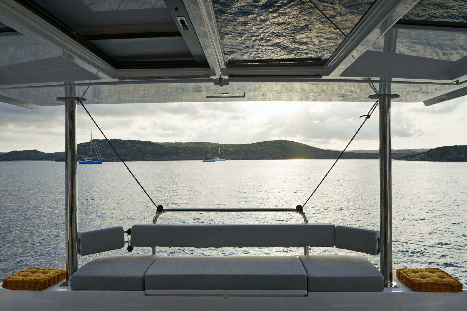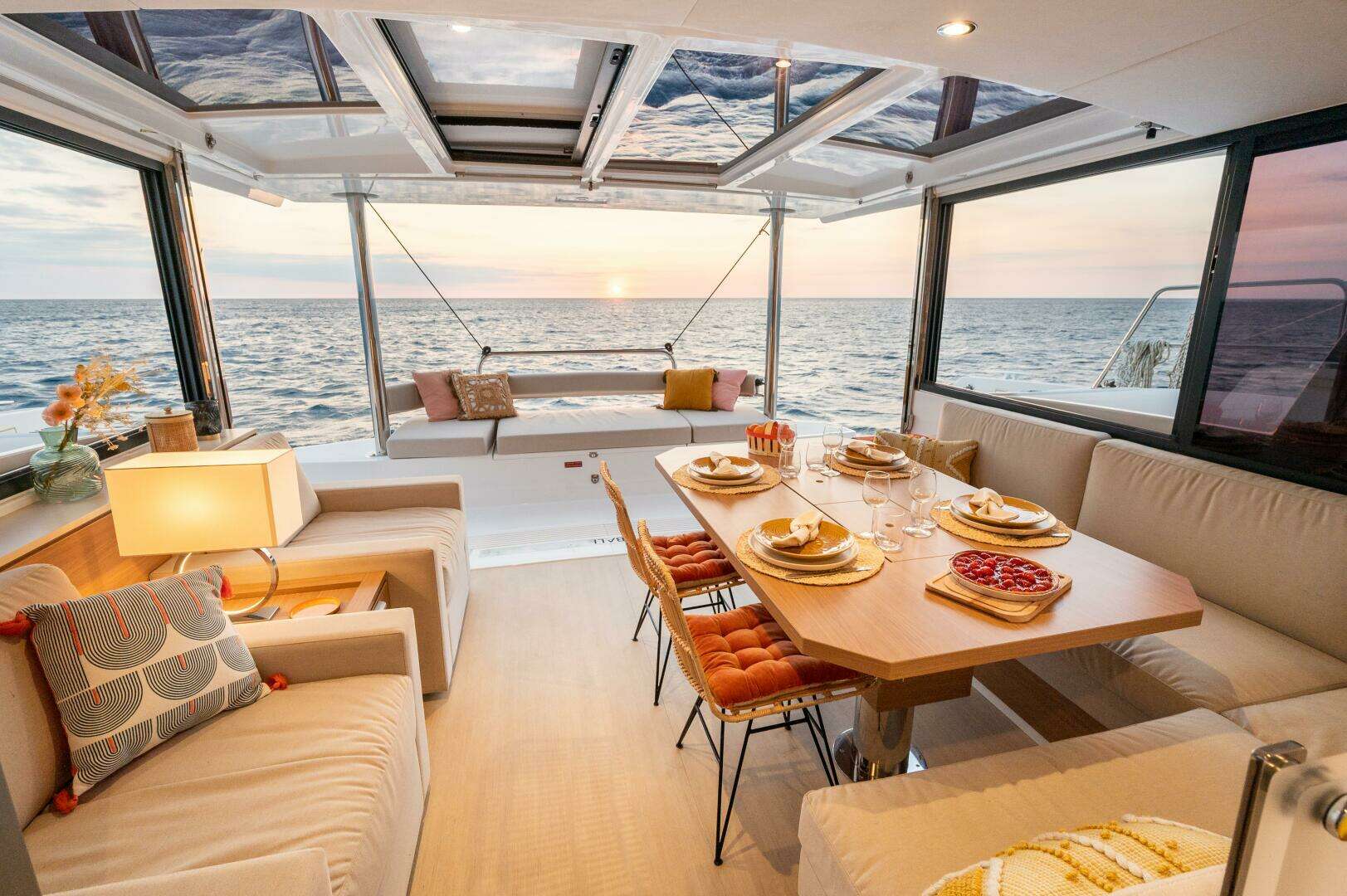 - Forward cockpit and lounge area for sunrise coffees or sunset cocktails, shielded from the wind