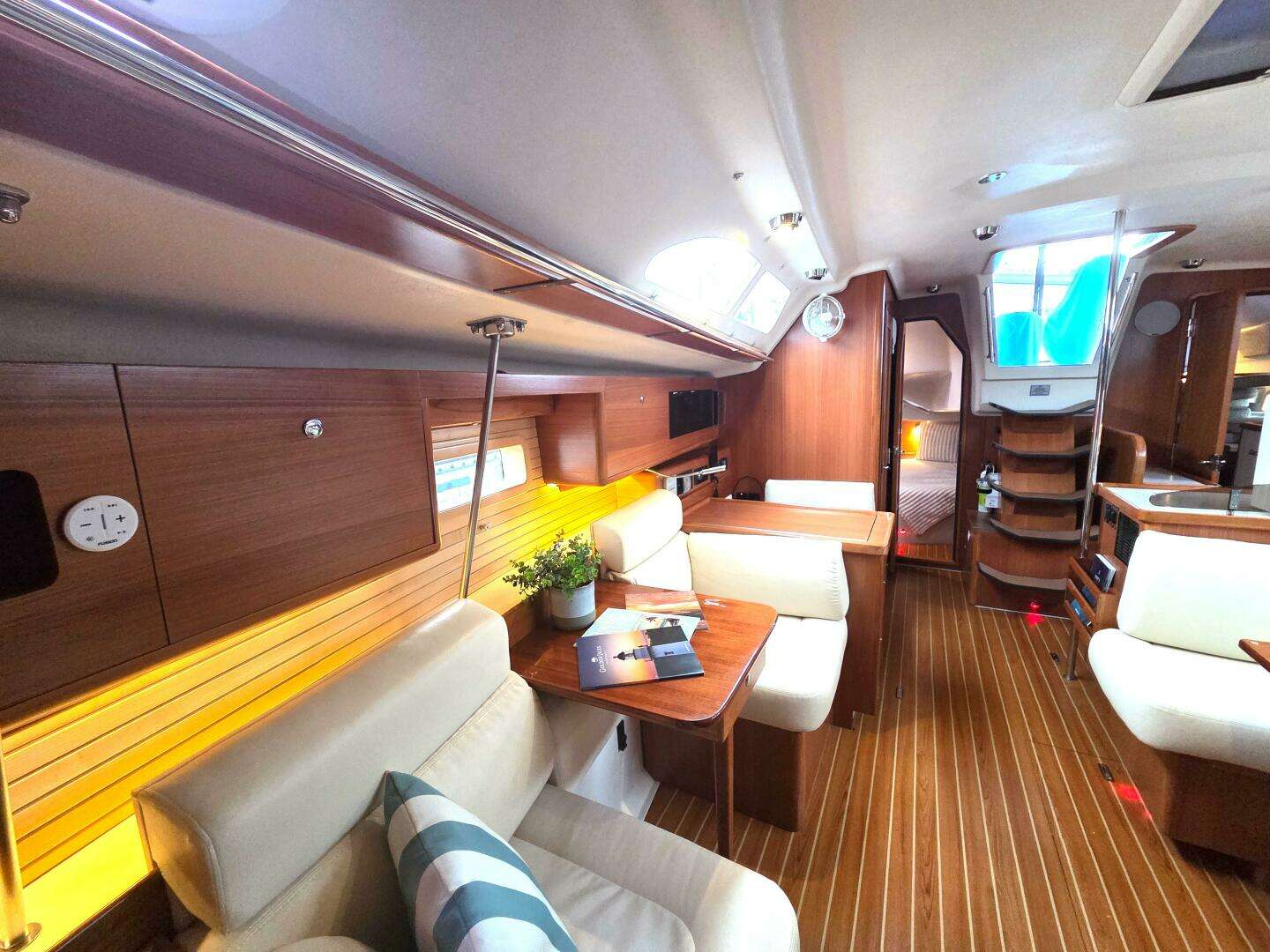 - Sailing and Handling: Upgraded 3Di North Sails, folding prop, electric winches, lines to cockpit, roller furling headsail, spinnaker, in-mast furling main, enhanced autopilot with additional handheld remote control, windlass with cockpit control/remote and a bow thruster enhance handling.