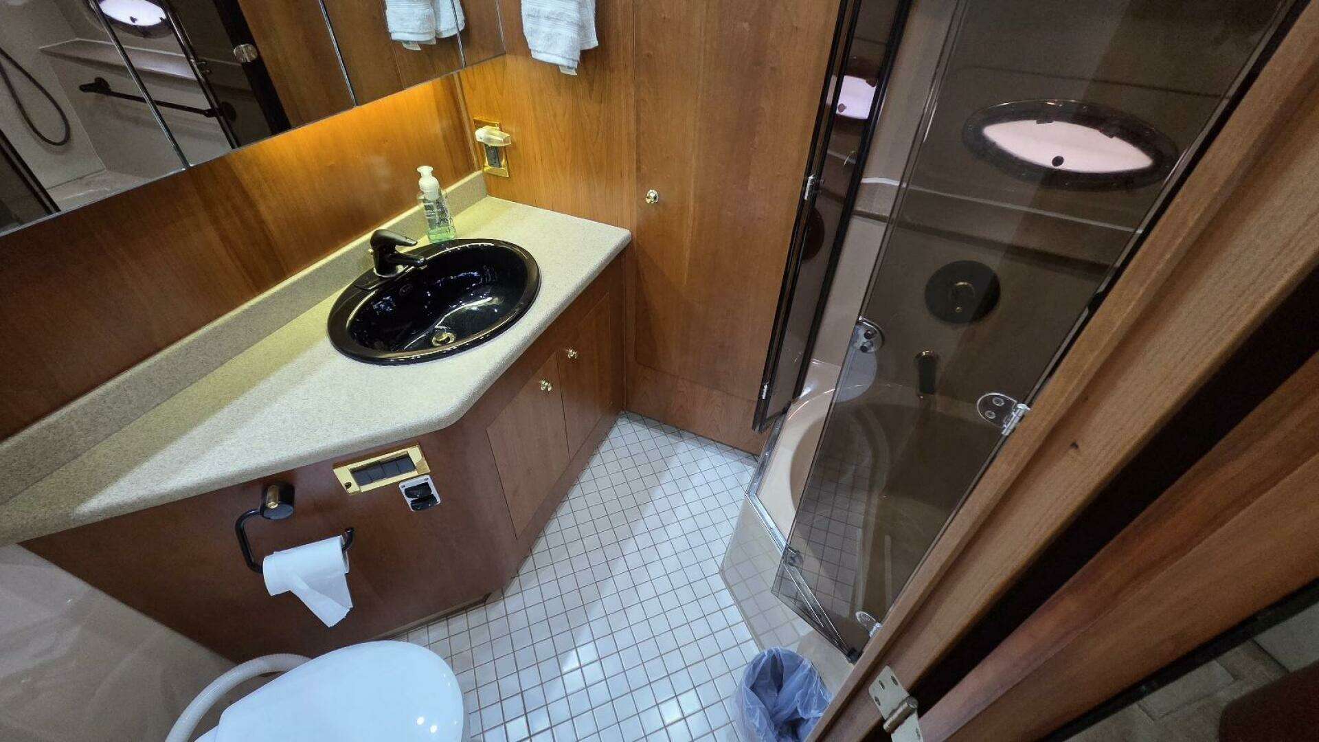 The layout includes two spacious heads, each with separate shower areas, and one head features a bathtub, a rare and welcome feature in this class of yacht.