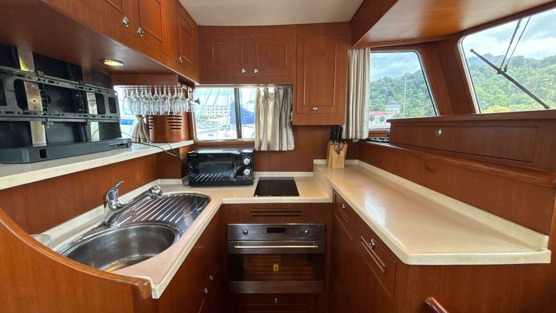 The flybridge is both functional and social, with commanding views and shaded seating. Below, Serenea’s saloon welcomes you with warm timber finishes, 2m headroom, and large windows. The well-equipped galley includes a Dometic 110L fridge, SMEG oven, Sharp microwave, and new twin-burner electric cooktop (2023).