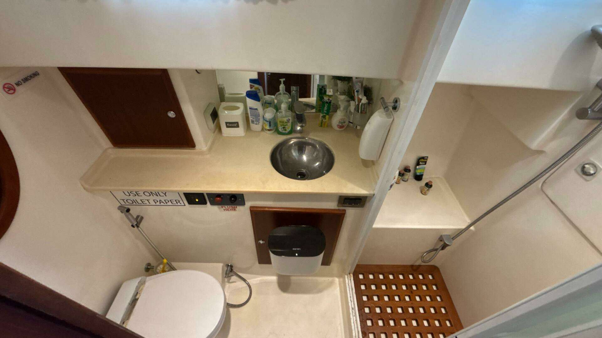Accommodation comprises a queen berth in the master cabin, twin berths in the guest cabin, and a convertible saloon berth. The spacious head features a Tecma electric toilet and full shower. Climate is controlled year-round with a Cruisair 24,000 BTU reverse-cycle air-conditioner.