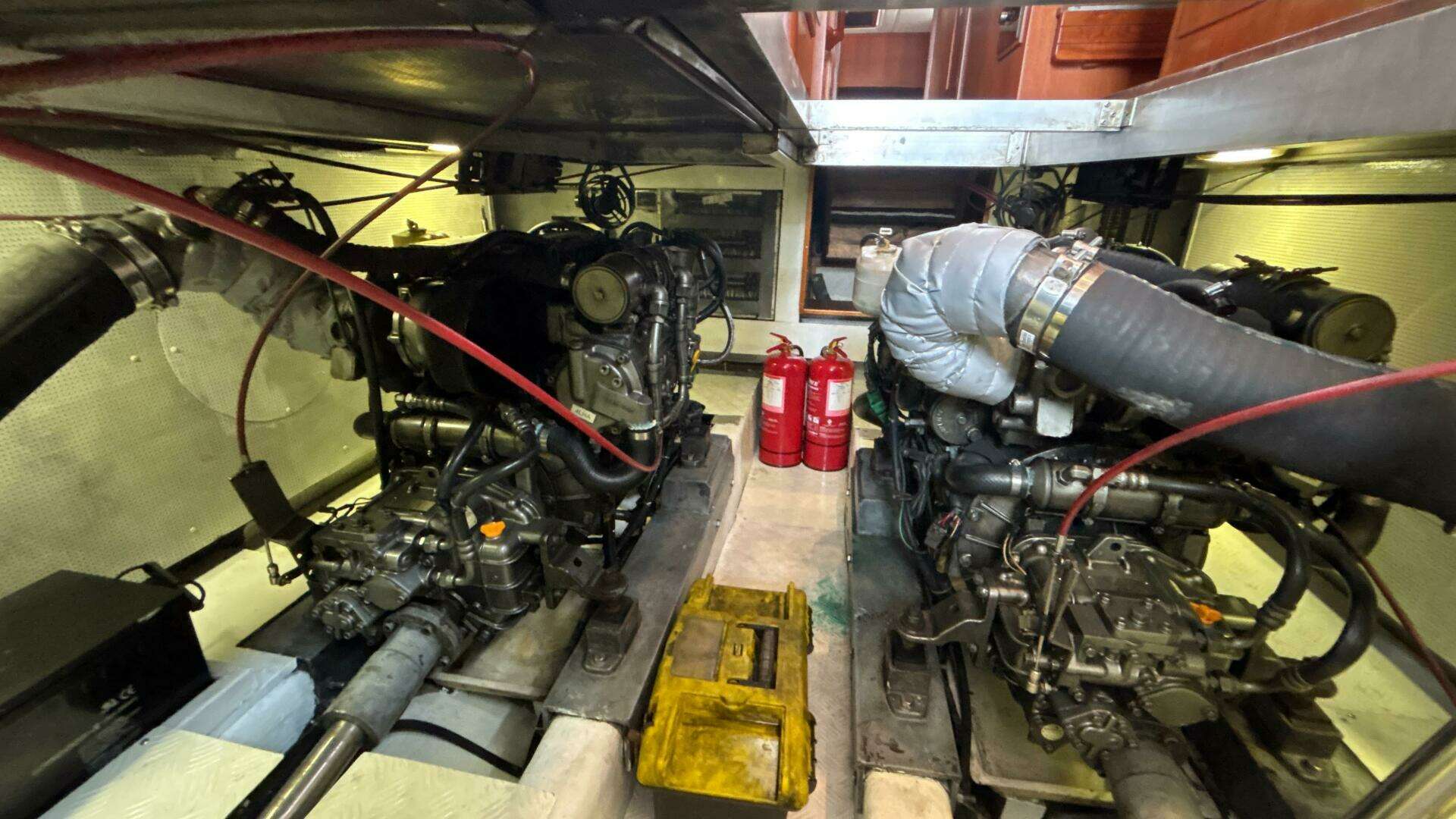 Measuring 44’6” (13.6m) with a 3.96m beam and shallow 1.02m draft, she provides excellent stability underway while remaining capable of accessing protected anchorages. Powered by twin Yanmar 200HP diesels (3,410 and 3,460 hrs, serviced Feb 2025), she cruises economically at 9 knots consuming just 33 L/h, with a top speed of 14 knots when needed. Docking is made easy with dual-station Vetus 75Kg bow thrusters.