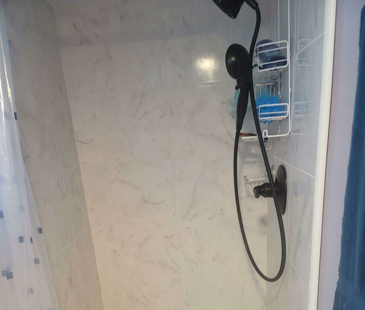 Bathroom: Electric Raritan toilet (holds constant water in bowl) and 12"x12" tiled shower