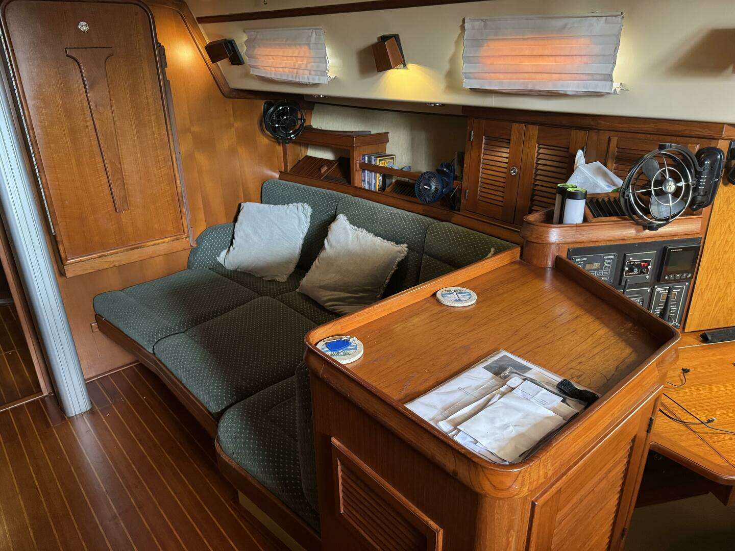 - Two comfortable captain's chairs to port. The captain’s chairs are separated by a fold-up table that can connect the chairs into a full settee.