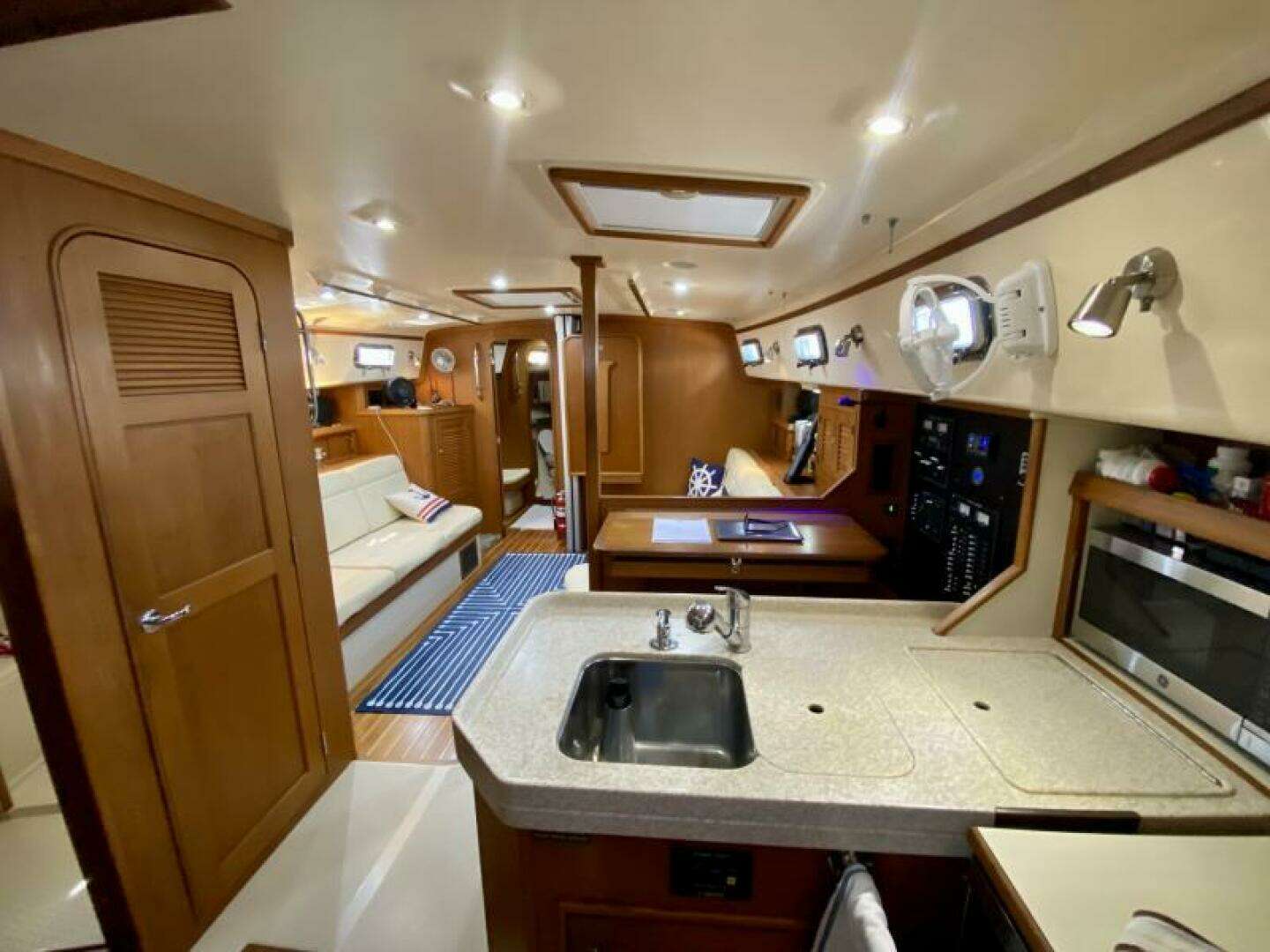 Second Wind’s interior is warm and inviting. Thirteen opening ports and screens w/ eight hatches with OceanAir screens & shades provide abundant light and air flow. You'll admire the beautiful furniture quality satin gloss varnish applied to the select teak hardwood veneers on the bulkheads and all cabinetries. As you descend the companionway ladder, you will see the open salon with full length settees on both sides covered in beautiful Ultraleather. The starboard settee extends toward the centerline to make a comfortable double berth and both settees can double as sea berths. A cedar lined hanging locker is outboard with a shelf above. The dining table is Island Packet's signature fold-up bulkhead-mounted table. When deployed it will accommodate a large group and then conveniently stores away when not in use. All switches have been changed to accommodate LED lights. All overhead lights are LED. All fire extinguishers have been updated and are in compliance with coast guard requirements.
