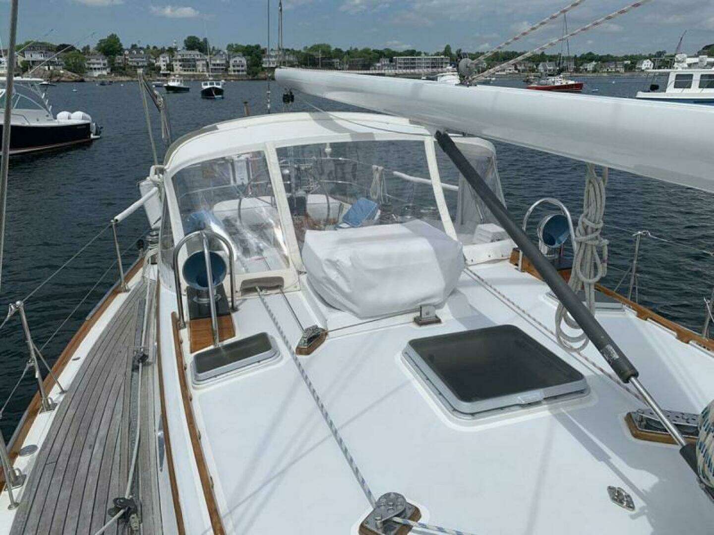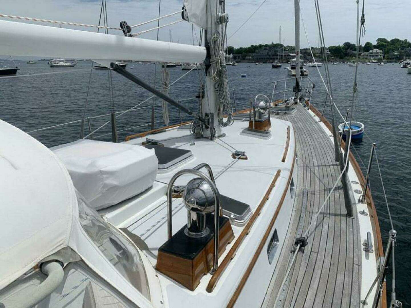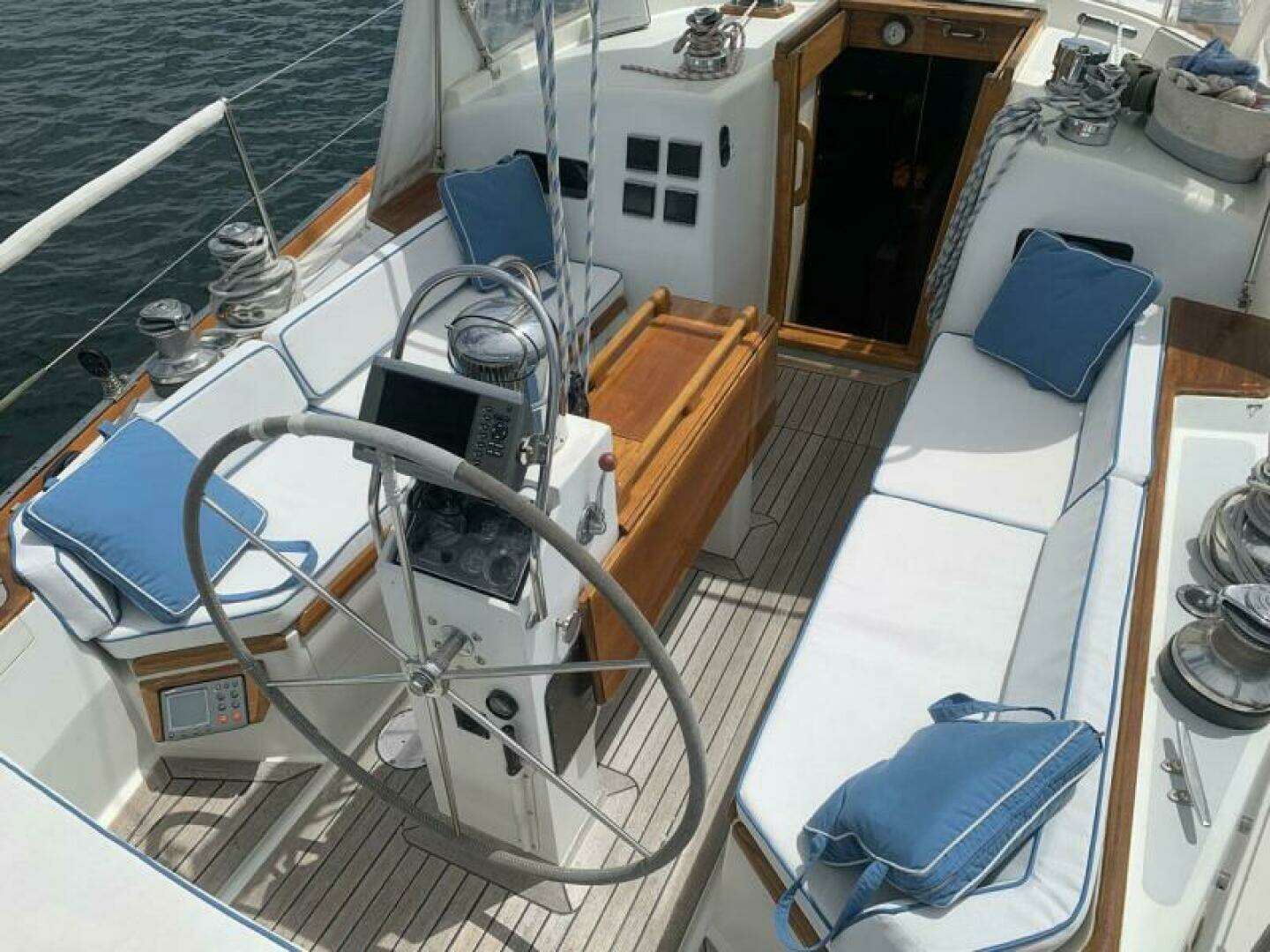 - Varnished teak toe rails, grab rails, drip rails, dorade boxes, cockpit table and cockpit trim (maintenance coats, spring, 2020)