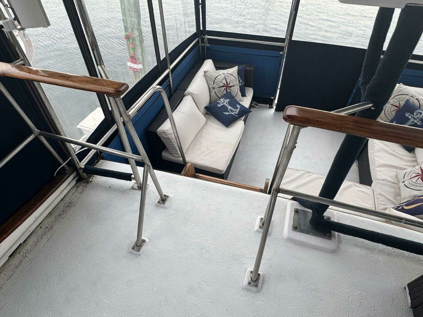 The trunk cabin has been equipped with a custom hardtop, two sofas port and starboard and one forward, along with full isinglass enclosure to create a unique entertainment and seating area that is a continuation of the flybridge area, one level down. There is nonskid decking throughout this area also.
