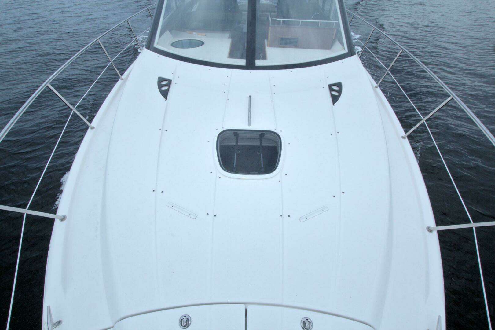 The 441 Sedan features an open, light-filled salon with 360° visibility, a raised galley and dinette, and a large flybridge with air conditioning and hardtop enclosure. Below, a two-stateroom, two-head layout includes a private forward master suite and a spacious full-beam VIP guest stateroom midship.