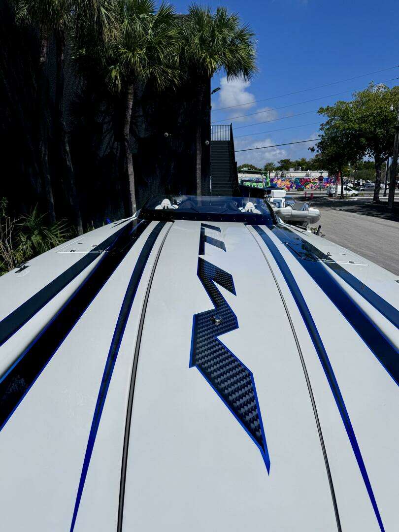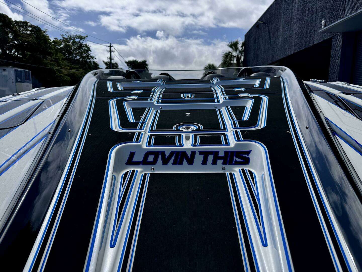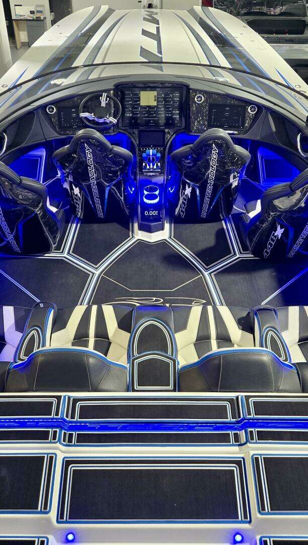Built with a carbon fiber layup hull and deck, colored bottom gelcoat, and Stage 2 custom paint, this boat commands attention. The 8-seat cockpit features Cool Touch vinyl, forged carbon dash inserts, electric adjustable seats, SeaDek PVA flooring, and a full rear tear-drop sun pad with rear wind deflector for added comfort at speed.