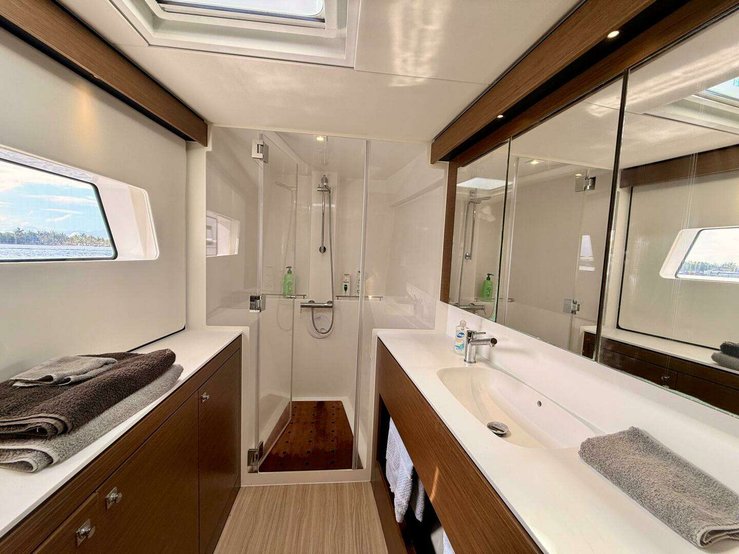 - Owner’s Hull: Queen bed, large separate shower, marine toilet, and ample storage