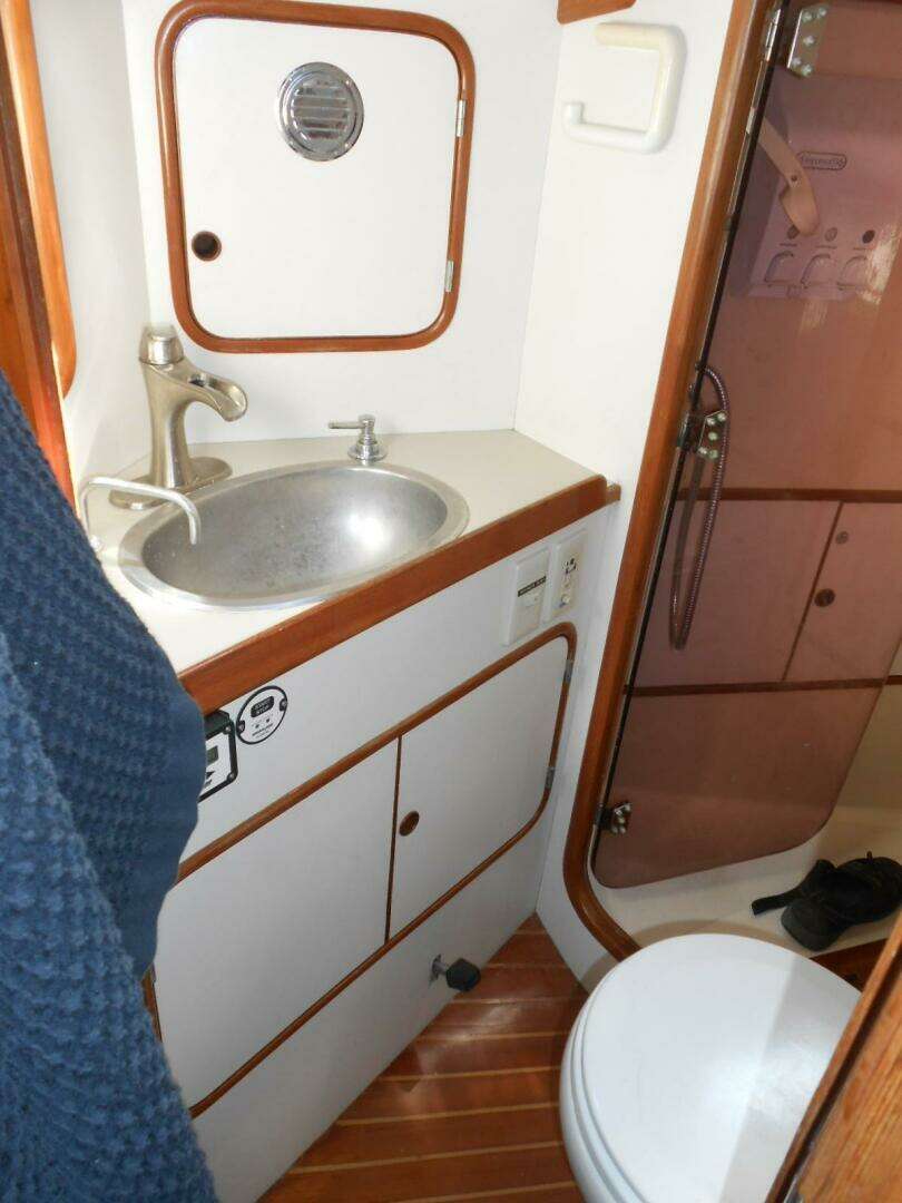 Entering from the center cockpit, there is an open main salon area with the galley to port and the navigation station to starboard. The Main Salon Features a U-shaped dinette to port and a settee to starboard. Forward of the salon is the guest stateroom which features a V-Berth, ample storage and an enclosed head with vanity. The Galley is aft of the salon on port, and a forward-facing chart table is opposite on starboard. All the way aft is the master stateroom. There is an ensuite head on port with vanity and a separate enclosed shower. Numerous opening hatches and port lights plus the exquisite joinery keeps her light and airy throughout.