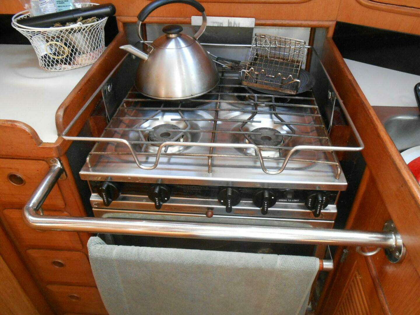 The U-shaped galley is on the port side aft of the main salon. It features a four burner Broadwater stainless steel propane stove with oven, separate fridge and freezer compartments with independent Cool Blue 12V cold plate refrigeration (2024), KitchenAid microwave oven, double stainless-steel sink with pressure hot and cold water, Formica counter tops and ample storage in lockers, cabinets and drawers. New faucets in 2024.