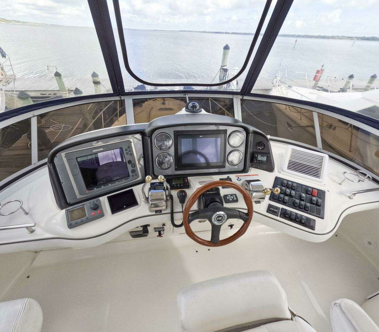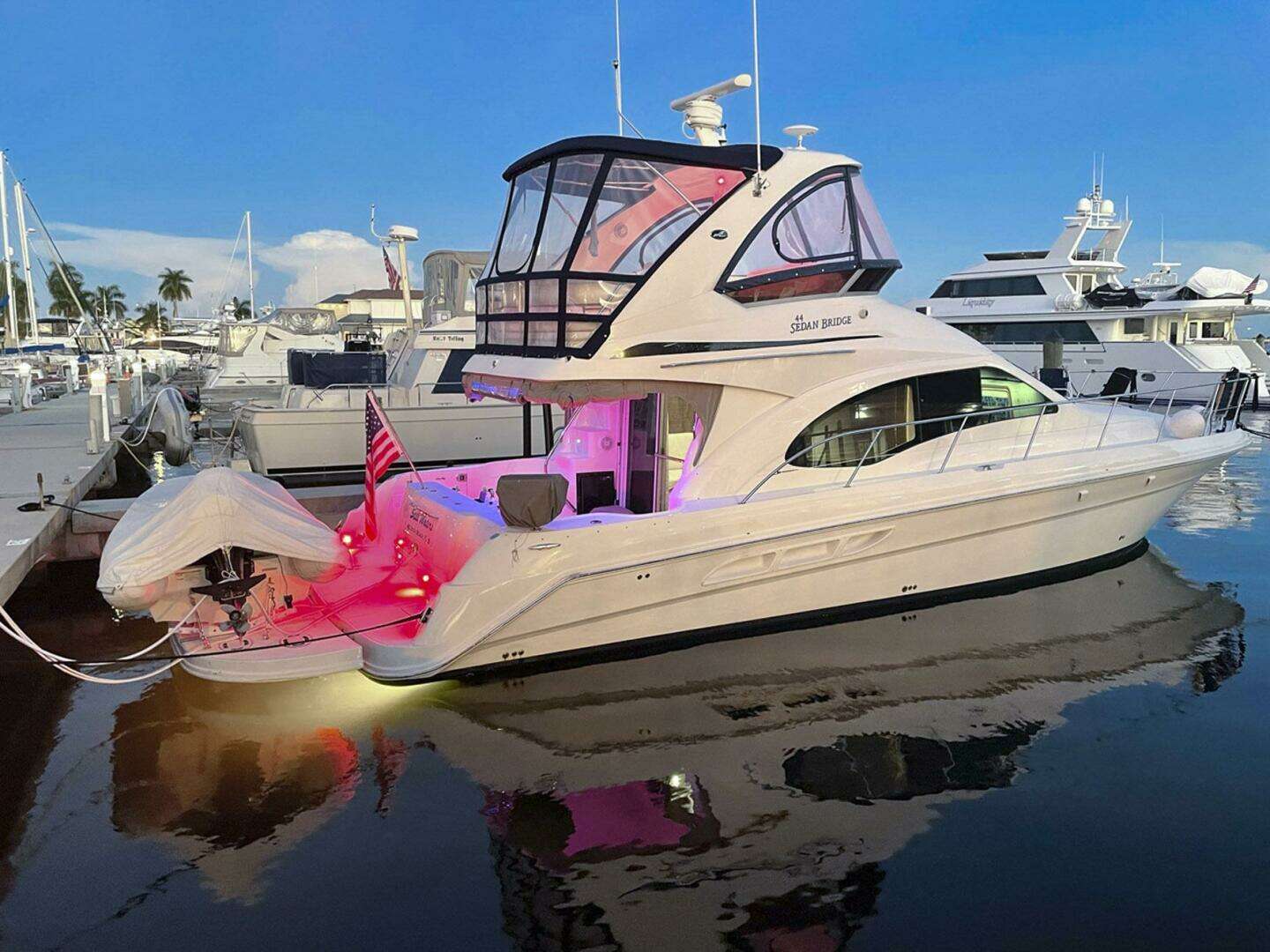 Still Waters is a 44 Sedan Bridge that combines effective use of space with luxurious accommodations. Sea Ray is well known for its Sedan-Style designs, and the 44 will not disappoint, Wood floors, Oversized Windows, and plush Ultraleather Sofas are just a few of the luxuries found in the spacious cabin. A raised dining area provides a panoramic view, and Deep-Pile carpeting and beautiful cabinetry highlight the decor. Below, a guest cabin to port has twin single beds, while the forward master stateroom features a Queen-Sized island berth. Both head compartments are fitted with Vacu Flush and separate showers. A sliding glass door opens to the cockpit with a walk through transom, hydraulic swim platform, bench, seating, and molded flybridge stairs. Offering good visibility fore and aft, the extended flybridge includes a large U-Shaped aft seat with removable table. Engine Cooler and Service Done. Turn Key and Ready to Go.