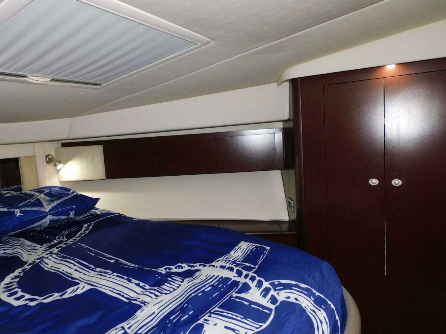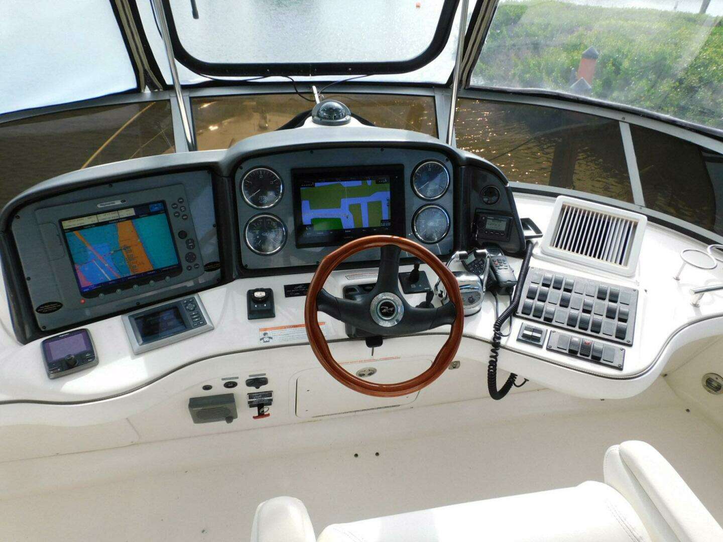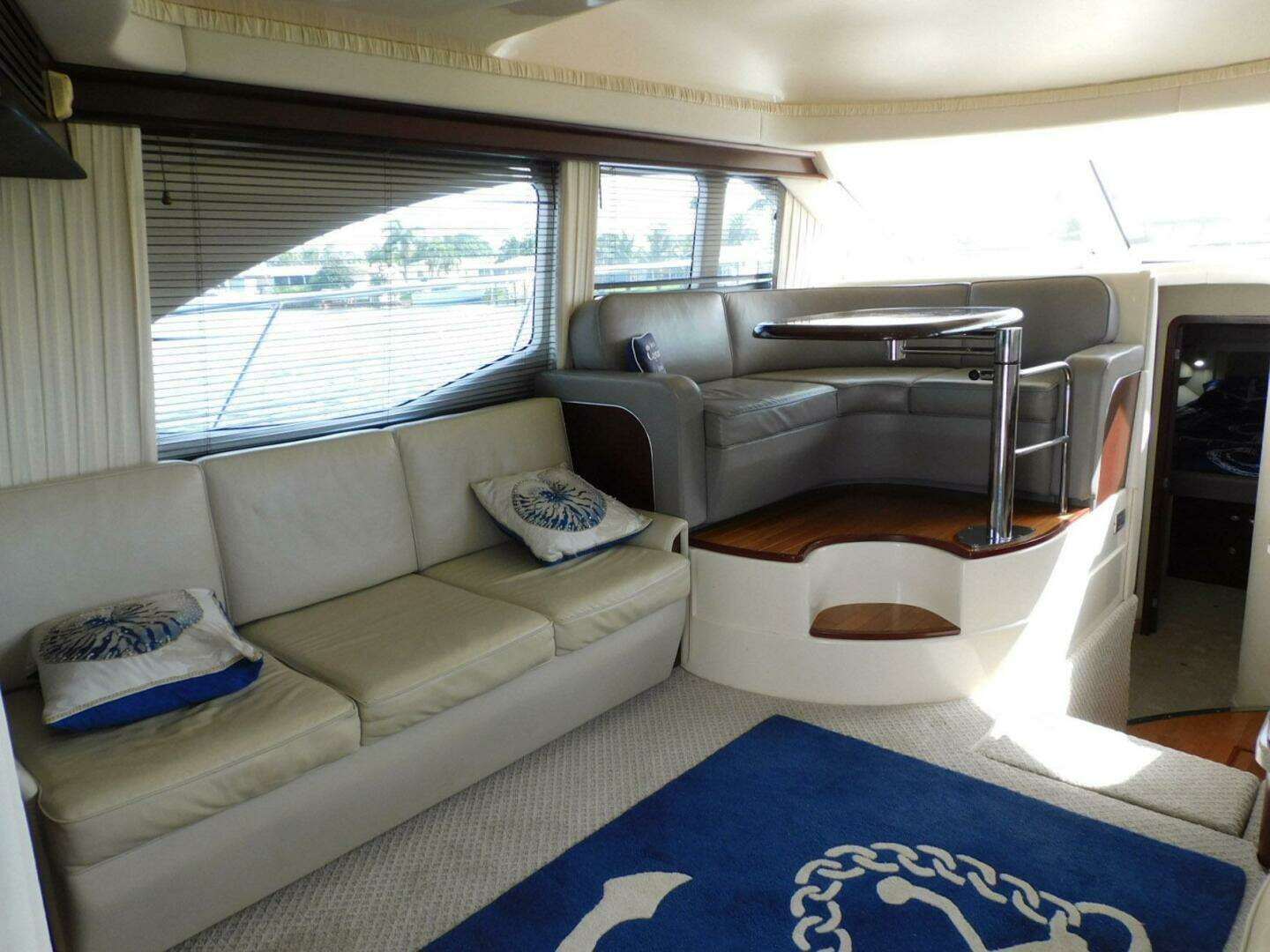 A sliding glass door opens to the cockpit, which features a walk-through transom, bench seating, and molded flybridge stairs. Offering good visibility fore and aft, the extended flybridge includes a large U-Shaped aft seat with a removable table.