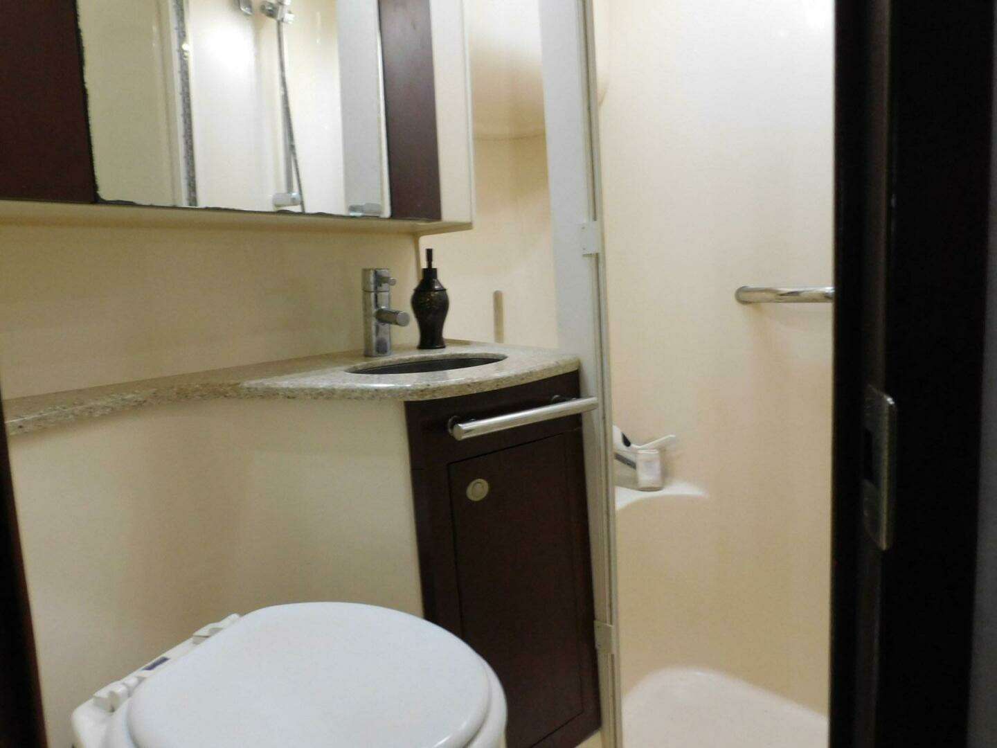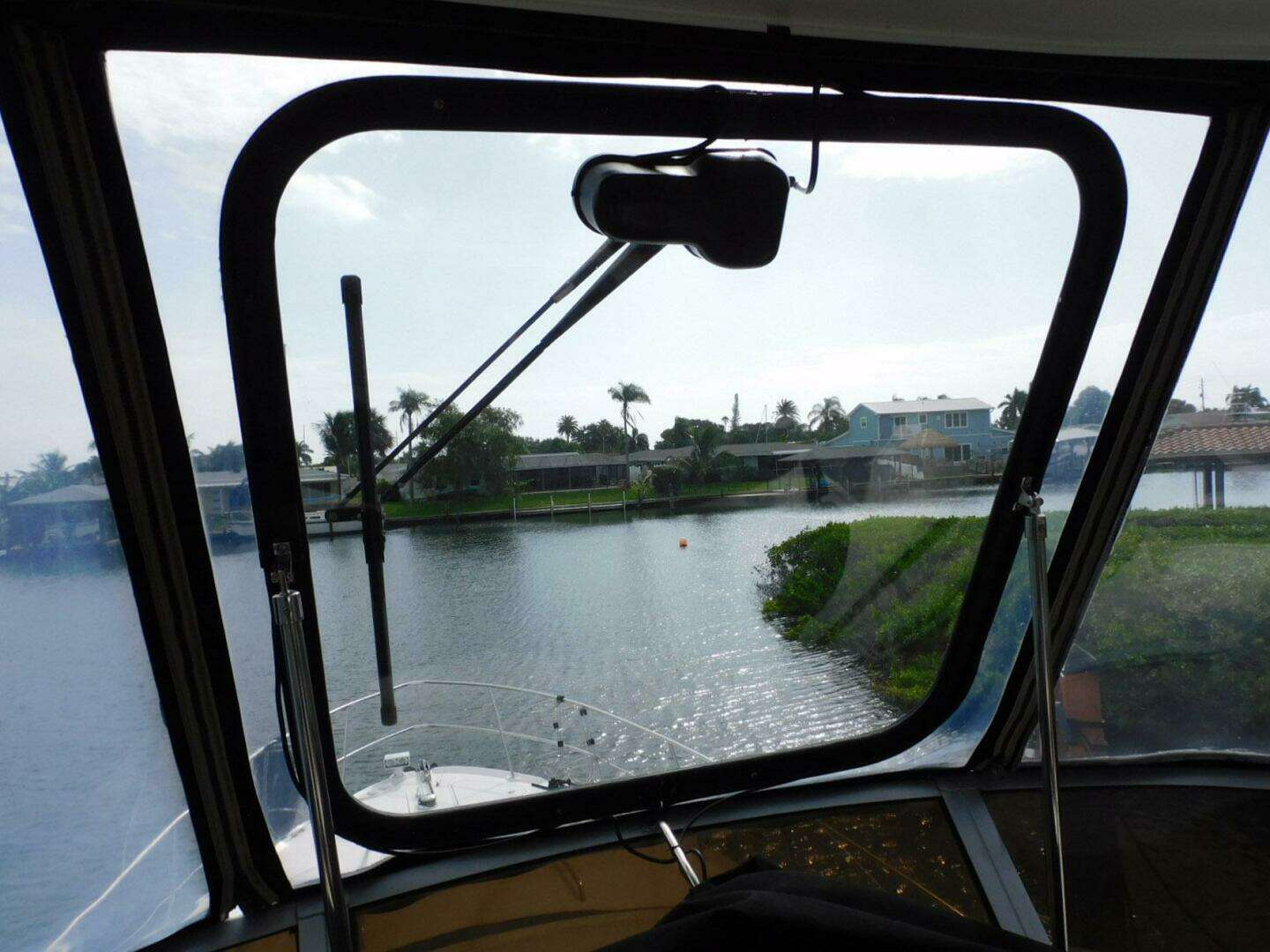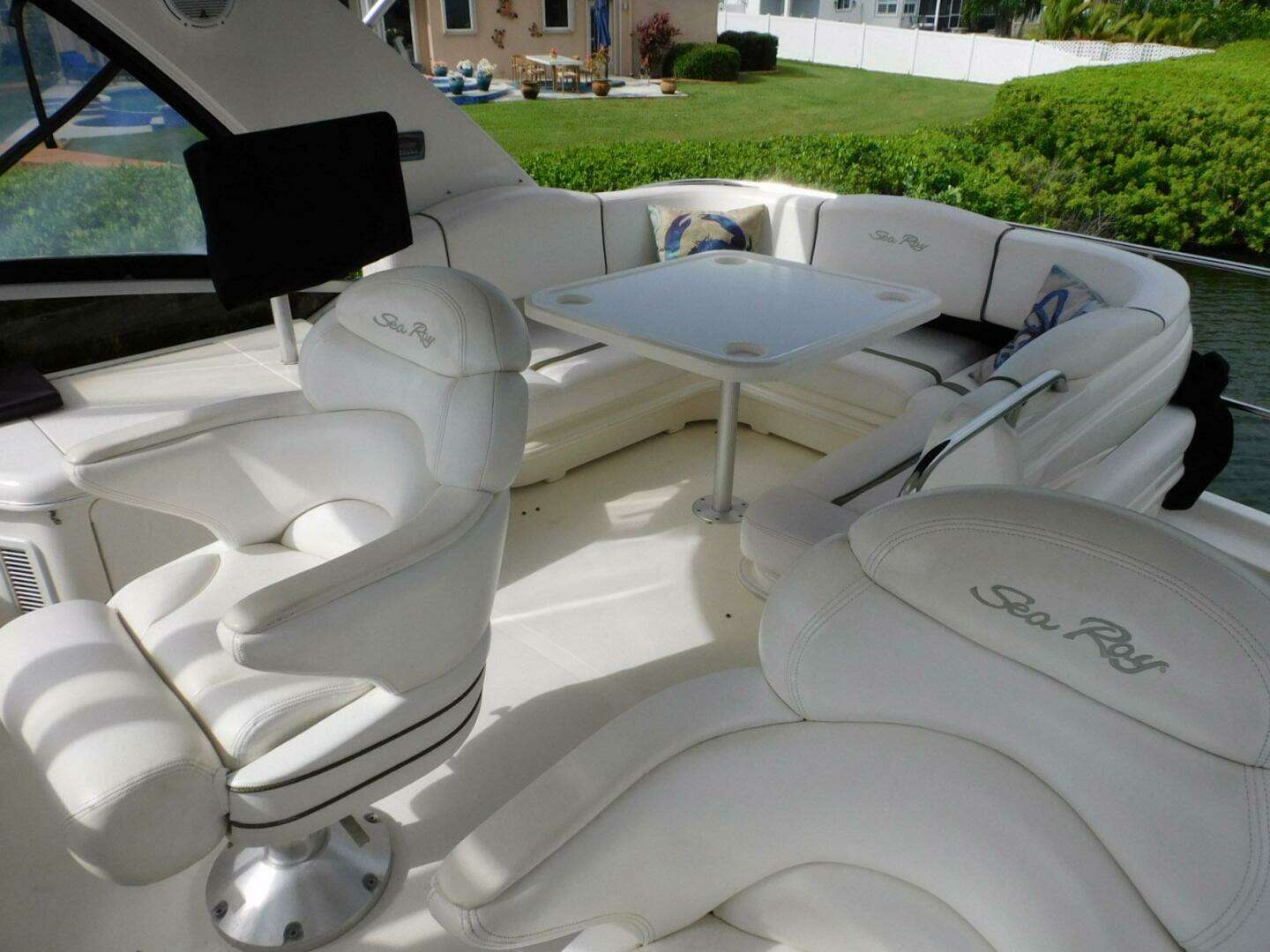 A sliding glass door opens to the cockpit, which features a walk-through transom, bench seating, and molded flybridge stairs. Offering good visibility fore and aft, the extended flybridge includes a large U-Shaped aft seat with a removable table.