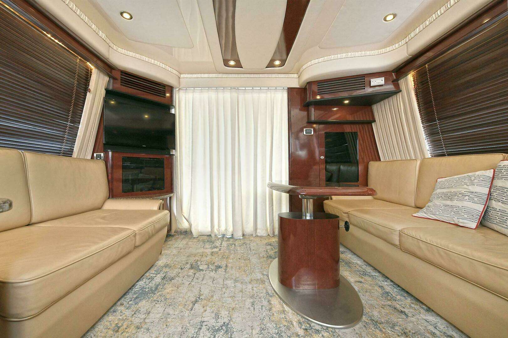 Once your cruising day is over, come down from the bridge via molded steps to a spacious cockpit or go inside her luxurious cabin that features a raised dinette with swing out table, or sink into one of her sumptuous couches and you relax to one of her entertainment systems.