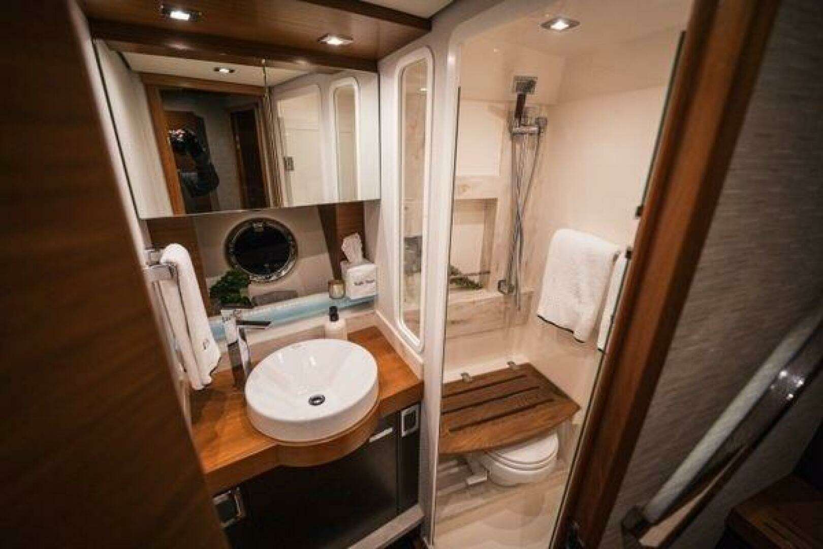 She’s had over $100,000 in upgrades including teak deck hydraulic swim platform, aft deck retractable sunshade, transom grill, aft deck refrigerator, satellite TV, 3000 watt inverter with independent battery bank and new custom plush mattresses in master and guest.