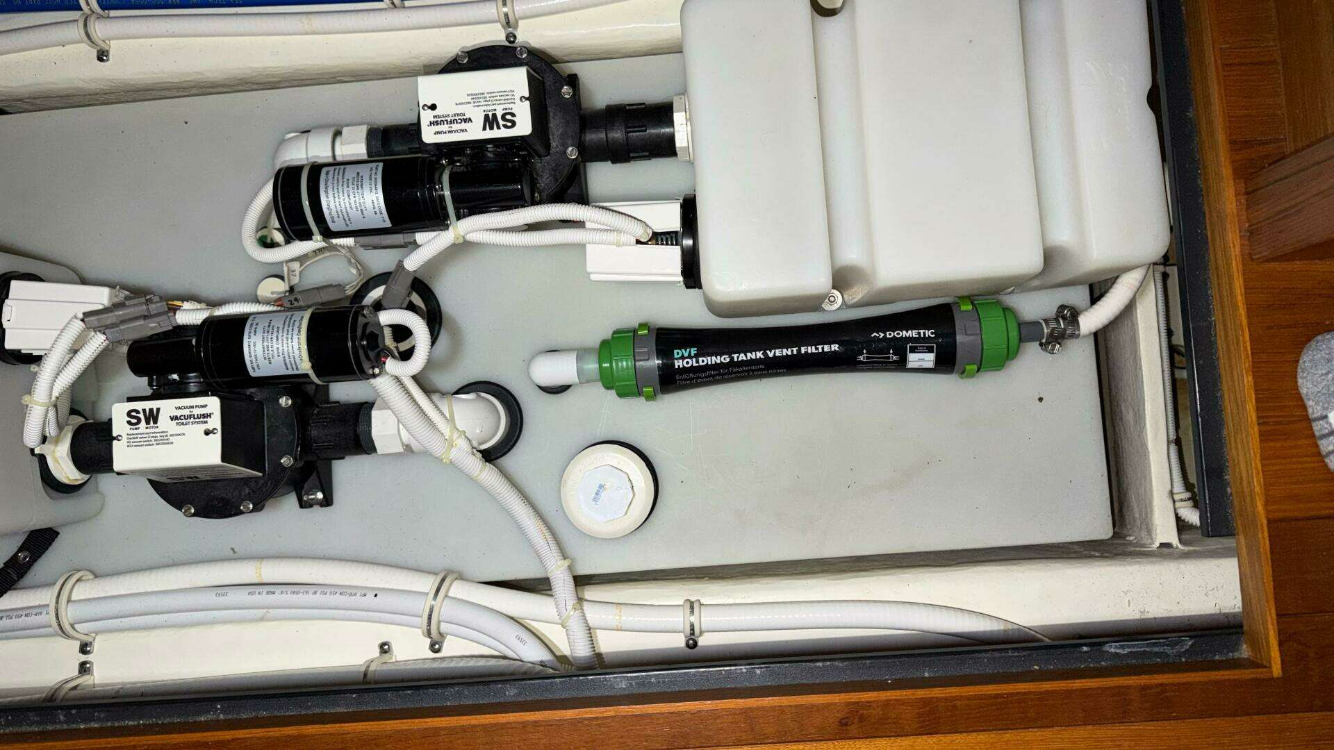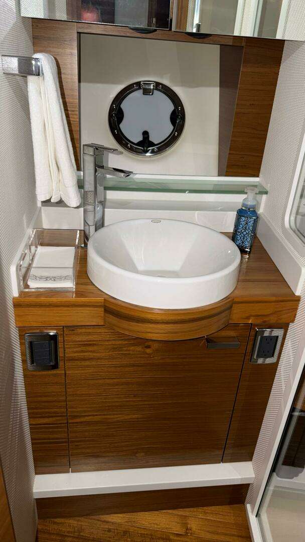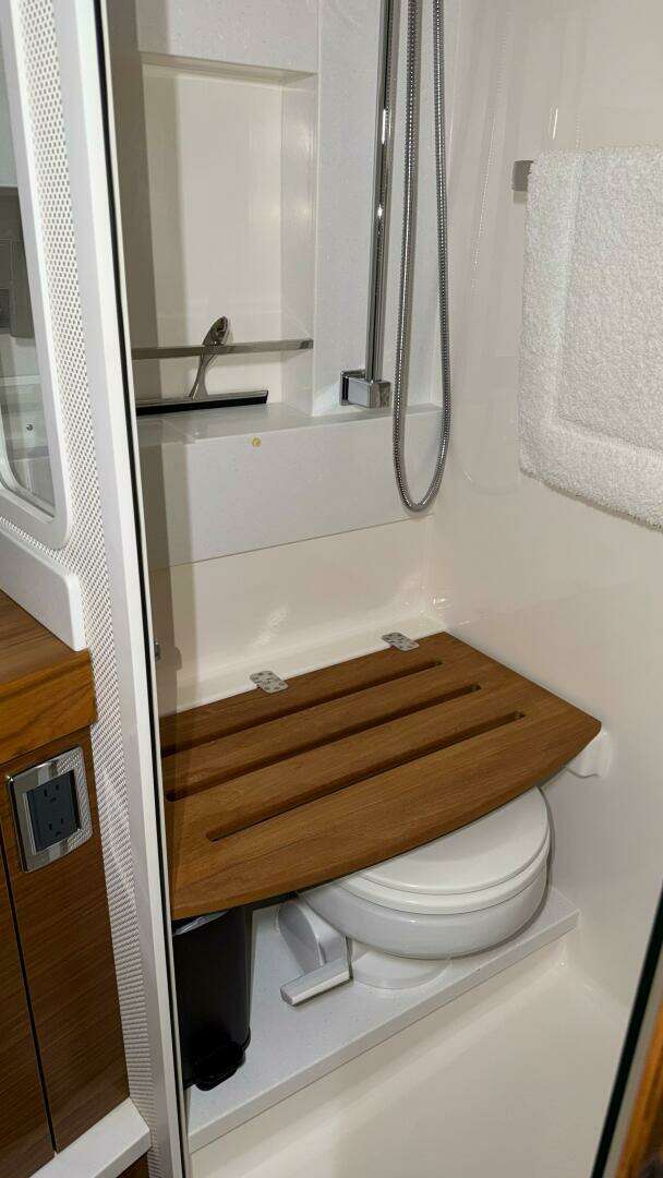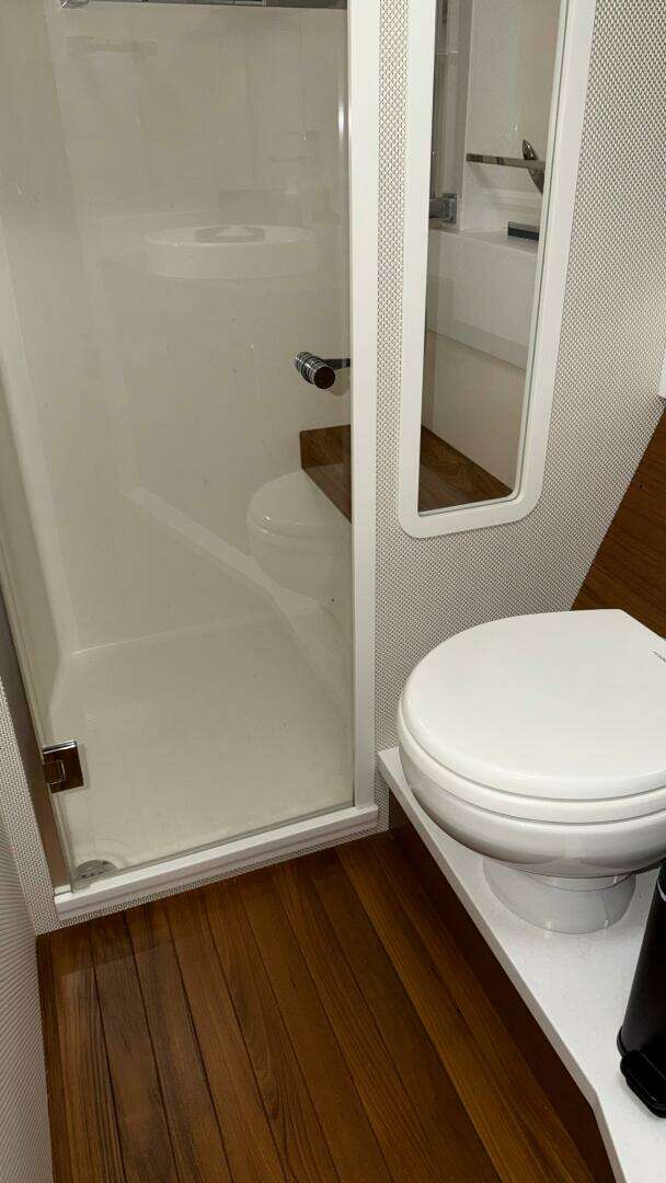 - One spacious head with VacuFlush toilet, separate shower, sink, and vanity