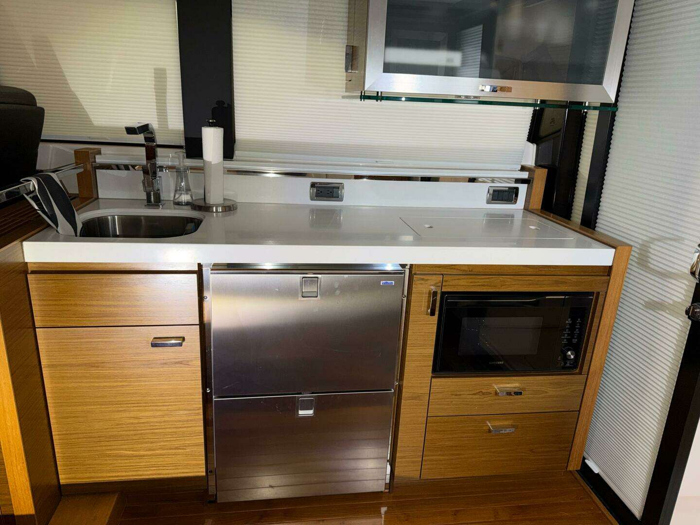 - Aft galley with solid-surface countertops, stainless sink, refrigerator, freezer, cooktop, and microwave