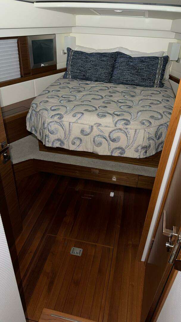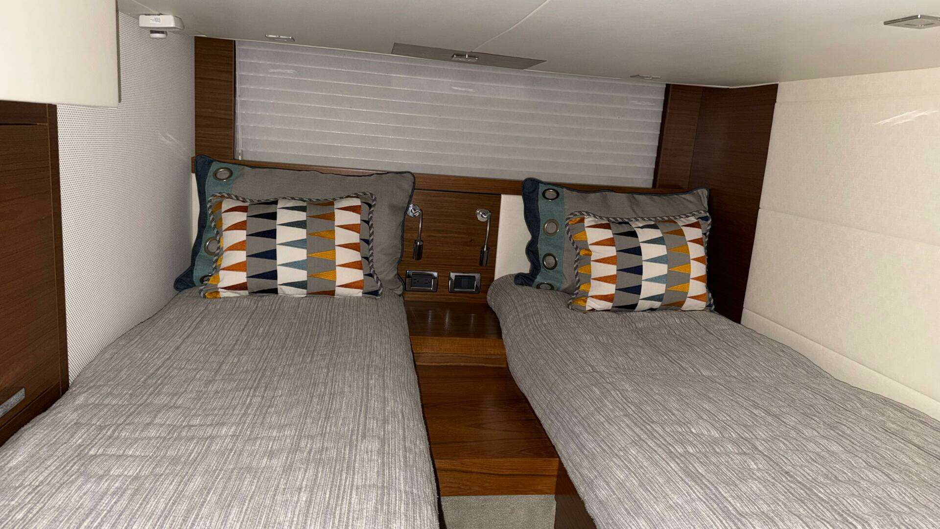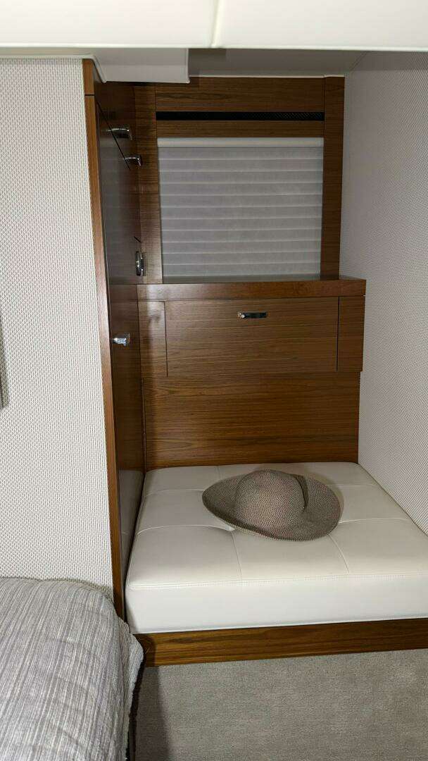 The 44 Coupe features a bright, open salon with large windows and a power-actuated sunroof. The aft galley opens directly to the cockpit through a sliding glass door, making it easy to serve guests inside or out. Below, there are two staterooms and one head with a separate shower, ideal for weekend trips or extended cruising. The forward master stateroom offers an island berth and ample storage, while the guest cabin provides twin berths that can convert to a double.