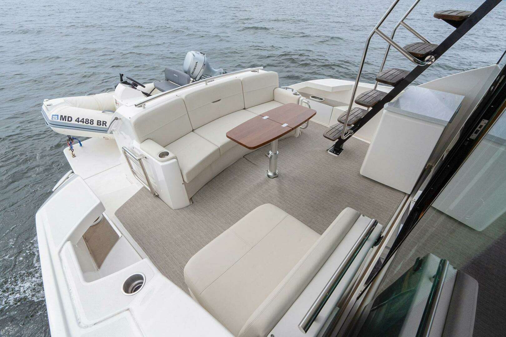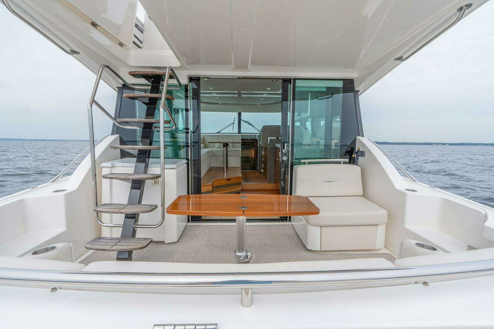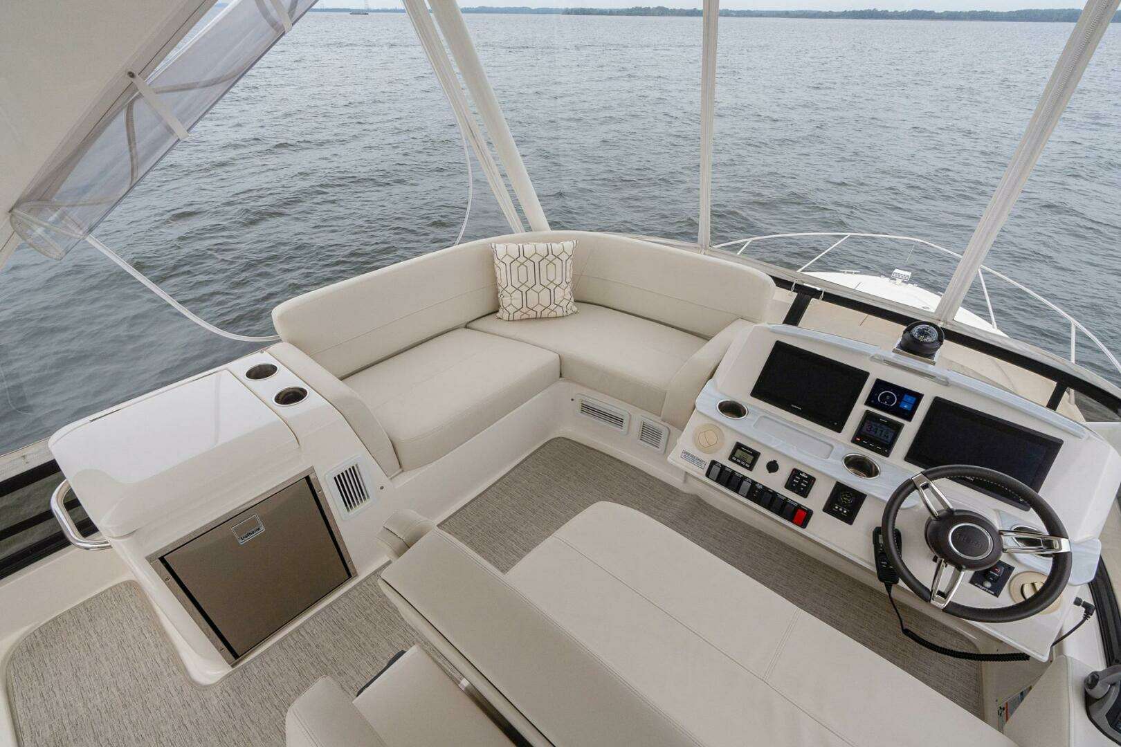 The flybridge is a true highlight – offering a commanding view at the helm with ample seating and a wet bar for hosting in style. The cockpit flows seamlessly into the salon with a sliding glass door, creating an indoor-outdoor social space ideal for sunset cruises or weekend getaways.