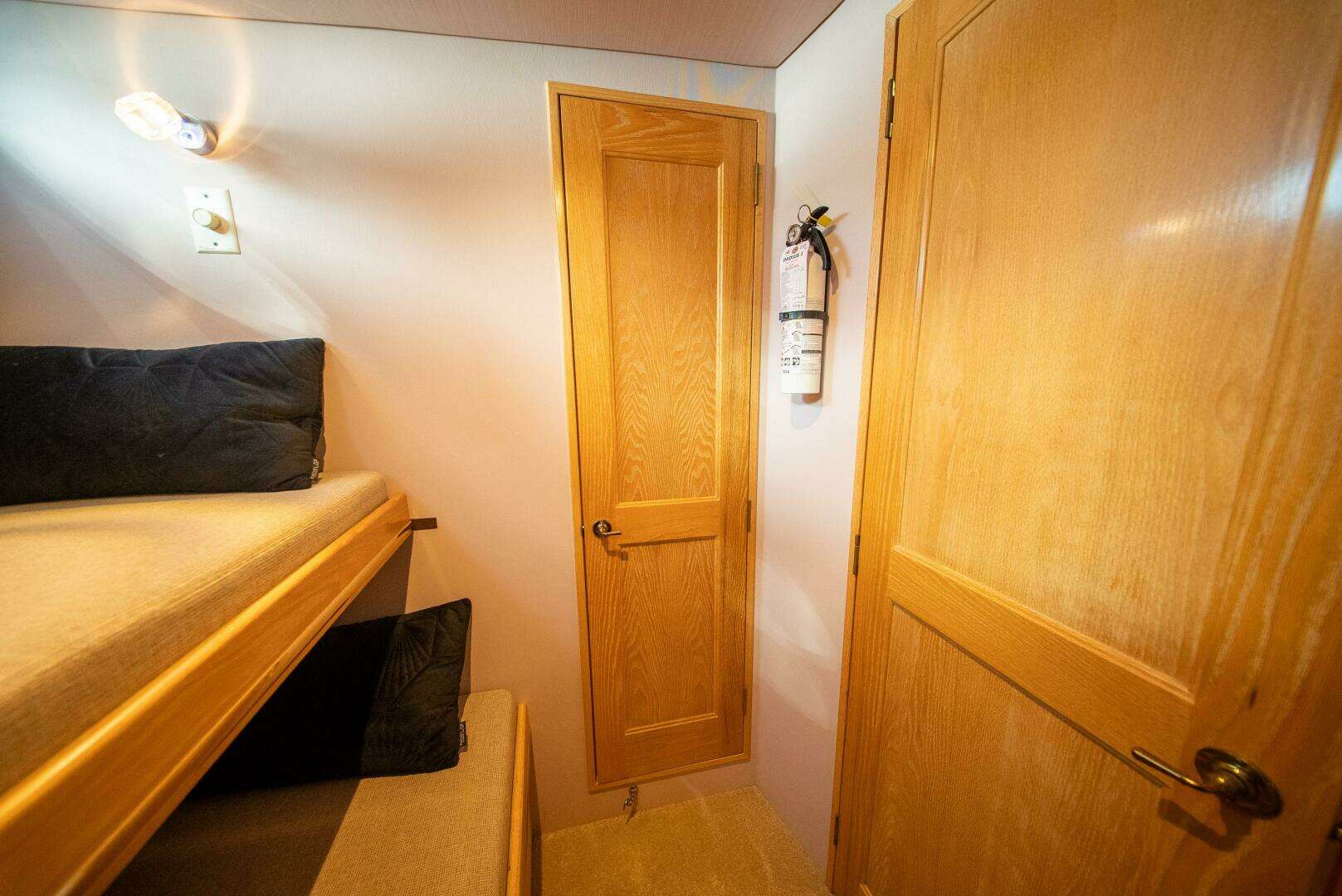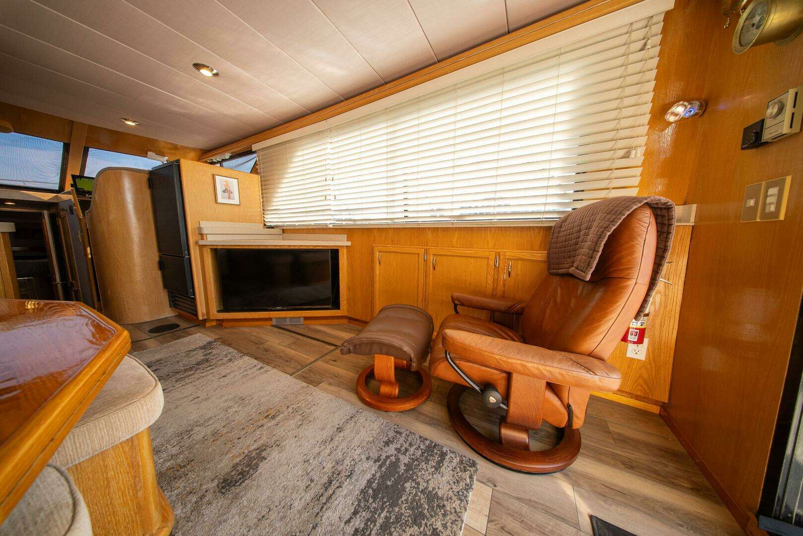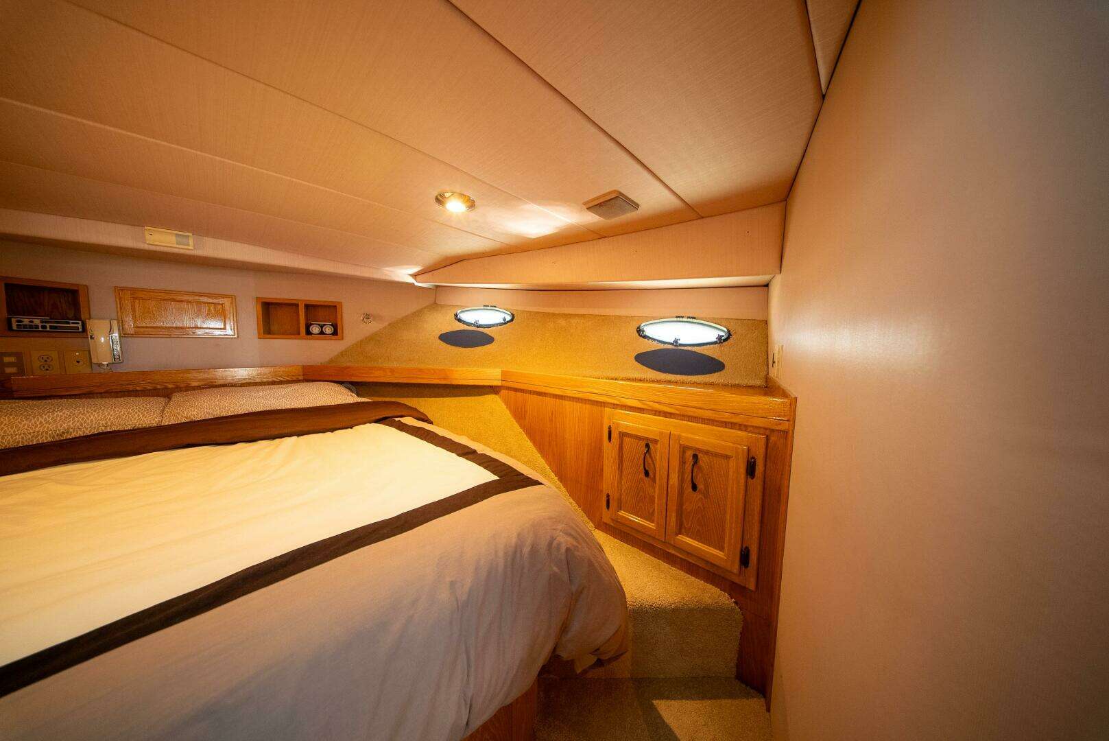 A decision was made to conduct a refit of the salon, galley, heads, staterooms and flybridge. The refit included a new refrigerator, plumbing in galley and heads , Corian countertops in the galley and salon and heads, new matching oak cabinet doors installed, new vinyl and cloth upholstery in the salon, lower helm, staterooms and flybridge , new flooring throughout and new Grohe plumbing fixtures were installed. Much of the paneling was replaced, as were new electronics at both helms, a new charger/inverter, new GSM batteries, new 2000 gph bilge pumps, new Groco Paragon Jr bronze fresh water pump ($3000), new sanitation hoses and a new stronger plastic black water 50 gallon holding tank, and a new Warn electric hoist for the davit.