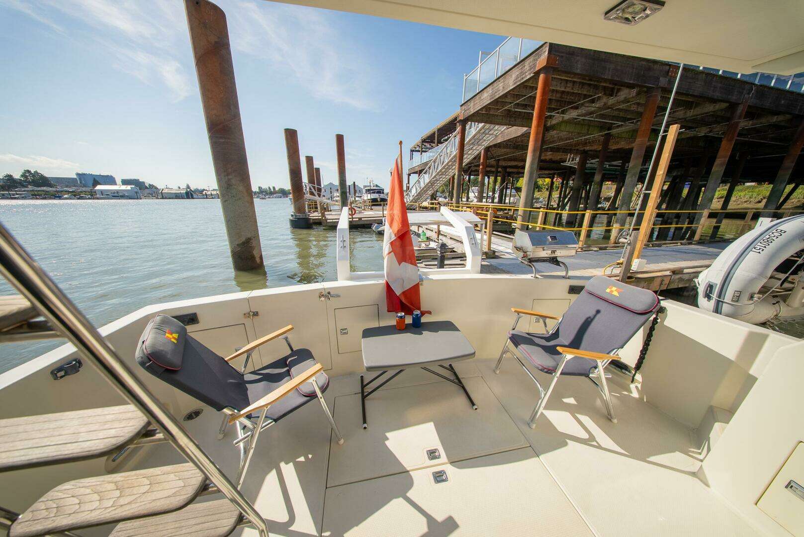 The cockpit is easy to access from the swim platform through the transom door, or by side boarding to the raised steps. The cockpit is large enough to handle a couple chairs and small table perfect for a couple. It is also small enough to not use up too much of your accommodations, a nice balance. From the cockpit there is a stainless steel ladder with teak steps for Flybridge access, and the large sliding glass door to the cabin. The flybridge extends to create a partial hard top, which provides good rain protection to the cabin entry.