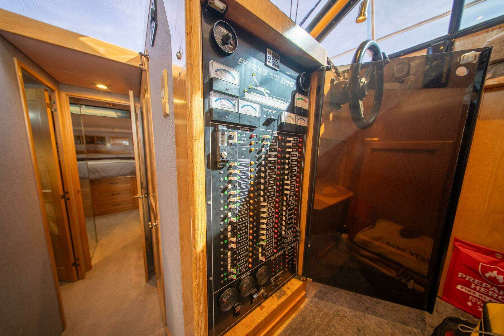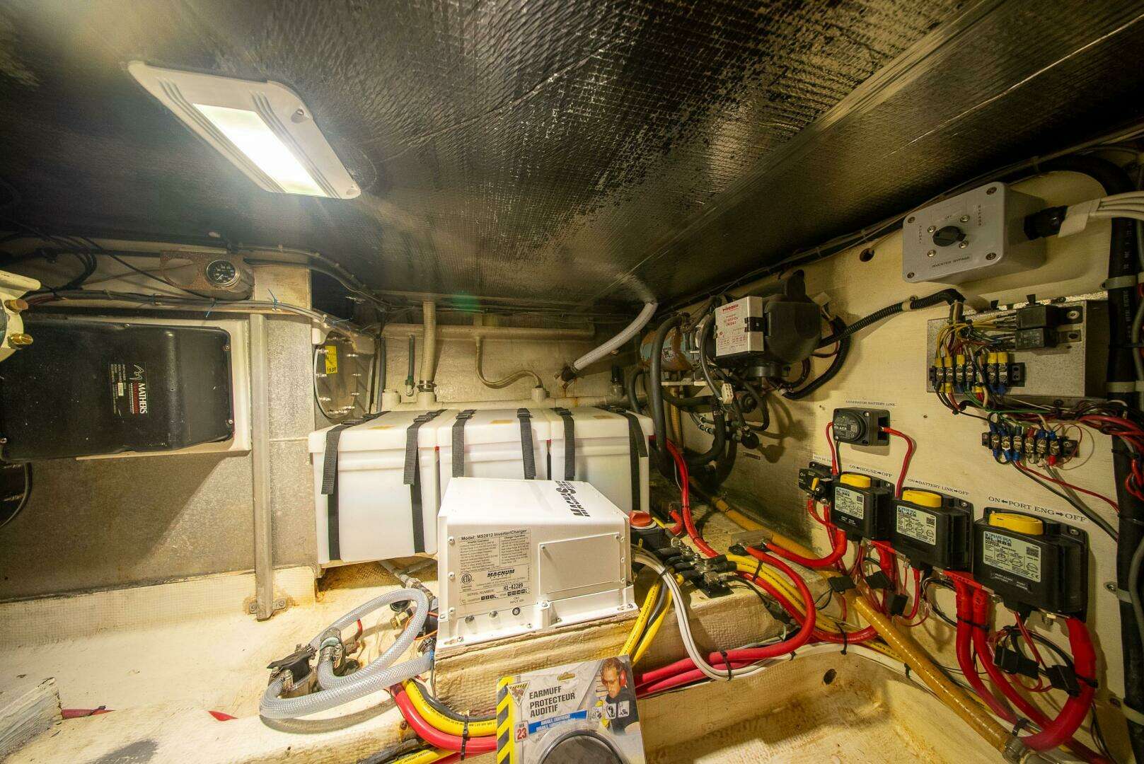The electrical system has seen a major renewal. ABYC certified Marine electrical technicians at considerable costs upgraded the electrical system including AC & DC cabling and a new charger/inverter to comply to current ABYC standards. And all of the machinery has been gone through in detail, including the repairs of minor issues, new filters, hoses, belts, oils, and impellers. Transmission coolers were cleaned of debris. Areas of rust on the engines have been brass wire brushed, followed by a base coat of rust preventing paint, and finally two coats of Caterpillar Wimbledon White engine paint.