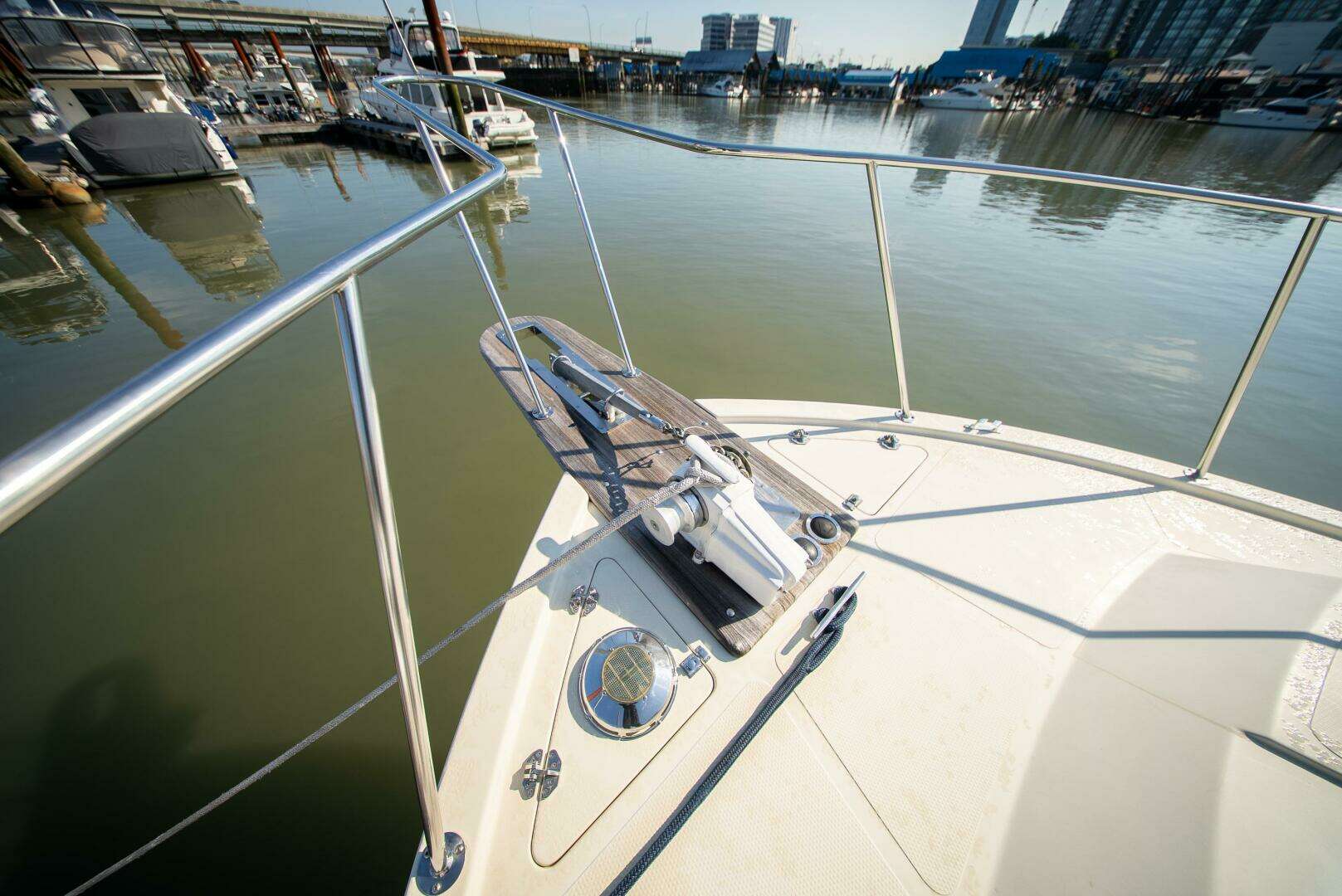 The overall exterior deck layout works well with a main level cockpit close to the water, a open unobstructed foredeck, and a very comfortable flybridge. There are good sized side decks, handrails, nonskid decking, and steps allowing for easy transition from the cockpit to the bow, plenty of room to work around the windlass and other key areas. The gelcoat shines and really presents this boat well.