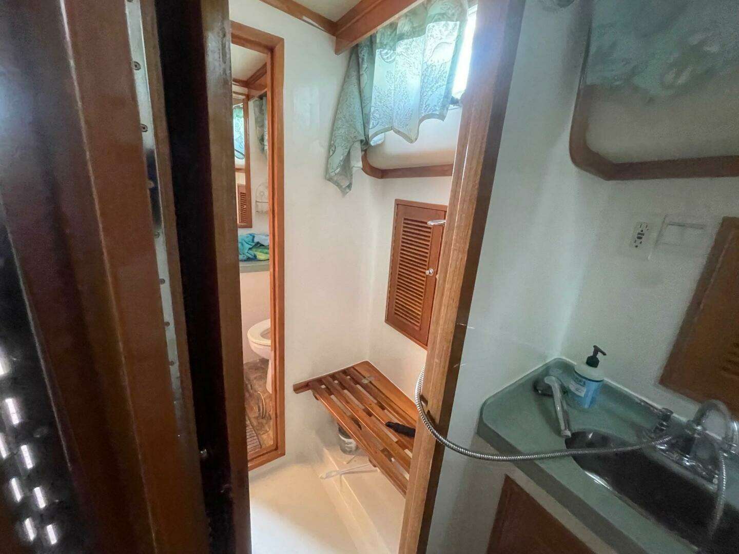 The head and shower combo on NECESSITY is well thought out. Guest head in easily accessible to the salon and guest cabin (located on the port side on the vessel) and is separated from the ensuite accessed master head and vanity by a shared shower. Fresh vinyl flooring with Corian countertops in each head area is complimented by brightwork and storage all around. The electric flush heads provide a nice, streamlined look with ease of use as well. The shower area is well defined and also has beautifully maintained brightwork throughout. Large shower stall for comfort is equipped with and adjustable and handheld shower nozzle for convienence.