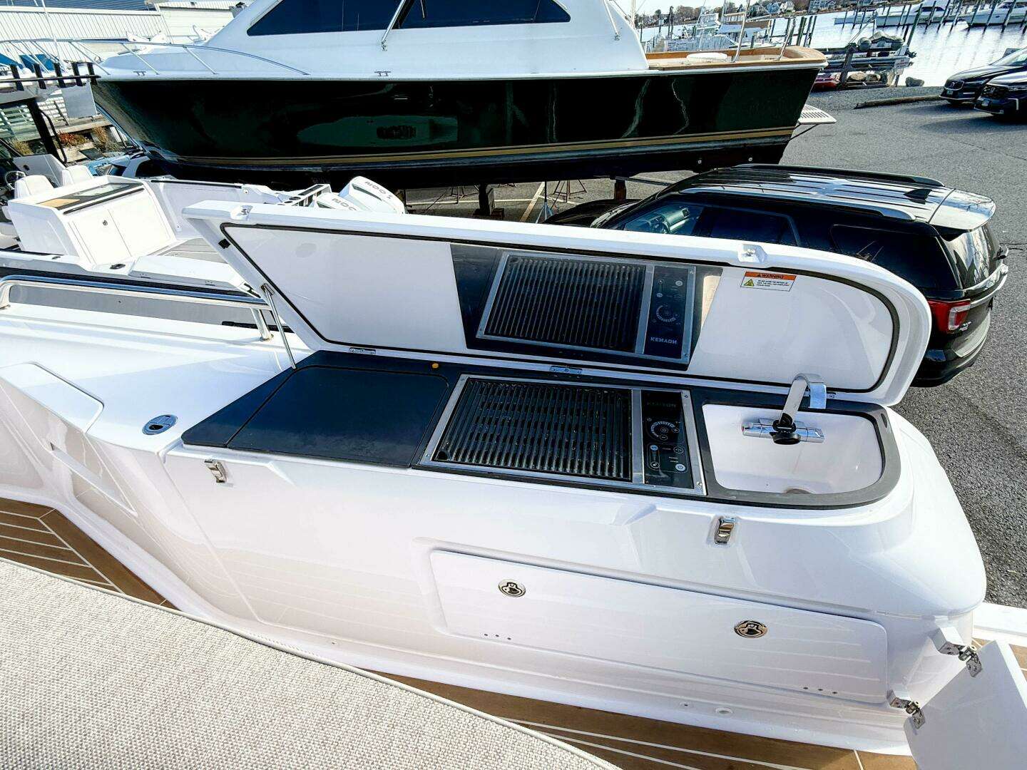 - Wetbar in starboard fenderbox includes: sink, 120v electric BBQ grill and refrigerator