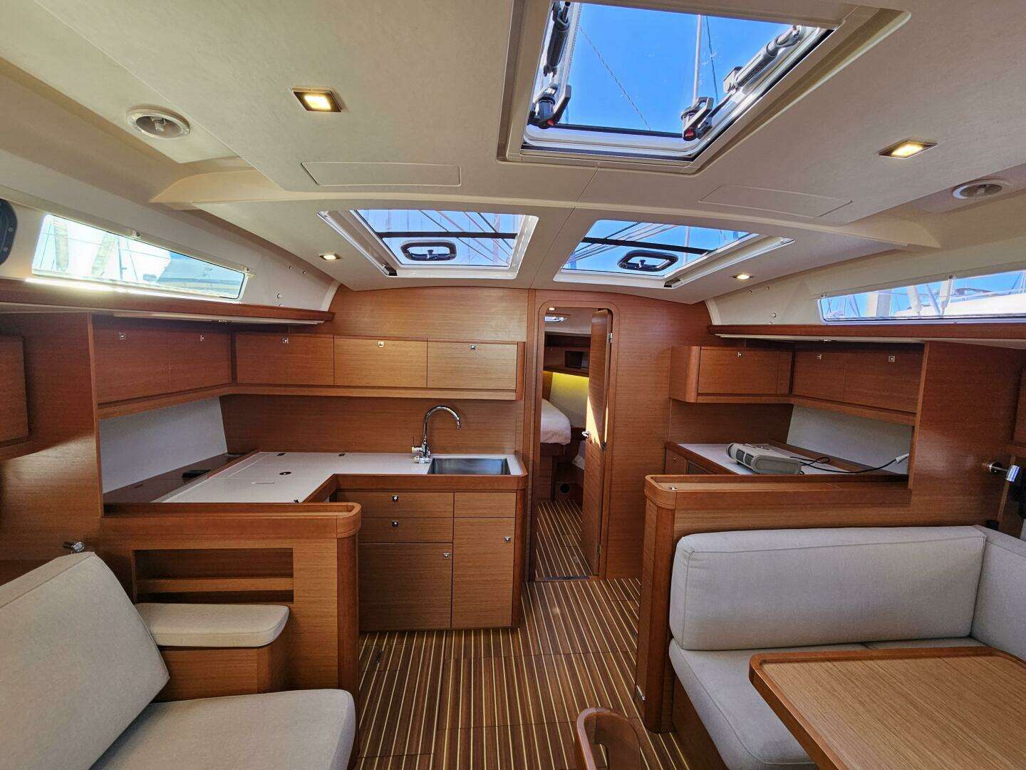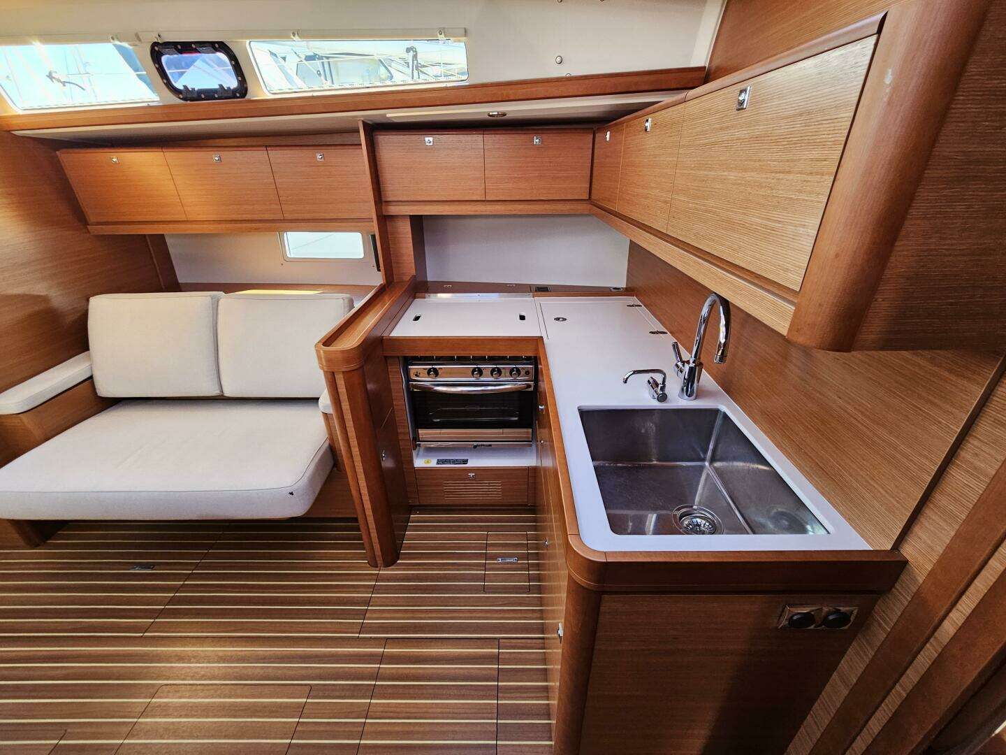 - Saloon banquette: L-shaped banquette on starboard.