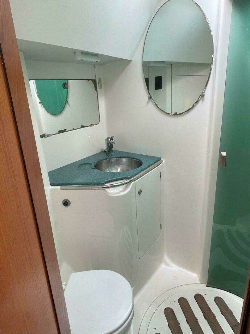 Forward is the owner's cabin with a large centerline berth and en-suite head. The berth in the owner's cabin lifts easily with the assistance of gas struts, revealing a large storage area. The storage area is also accessible via a drawer at the foot of the berth and doors on either side. To port is a desk, stool, mirror, and cabinets. Deep shelves are mounted outboard on both sides of the berth. To starboard is the door to the head and an additional storage area.