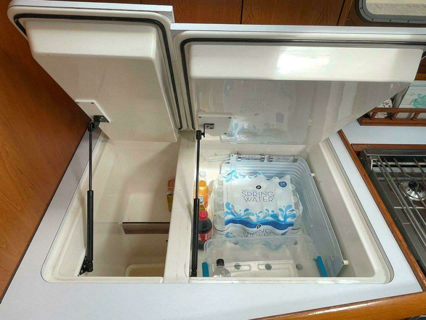 The linear galley is adjacent to the salon on the port side. It has a large front and top-loading refrigerator, double stainless steel sink with faucet, stove/oven, and plenty of storage.