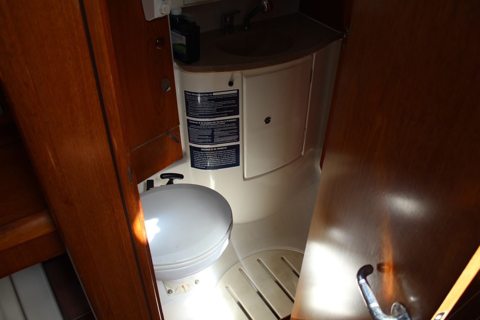 Main Salon is spacious and comfortable with U shaped dinette and settee forward of the L shaped Galley to Starboard and and forward facing Nav Station to Port. Galley includes:12v refrigerator with top and front loading doors; 12v freezer; Eno 4 burner LPG gimballed stove with oven and broiler; Hot water heater