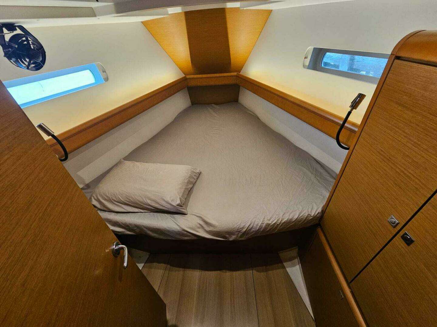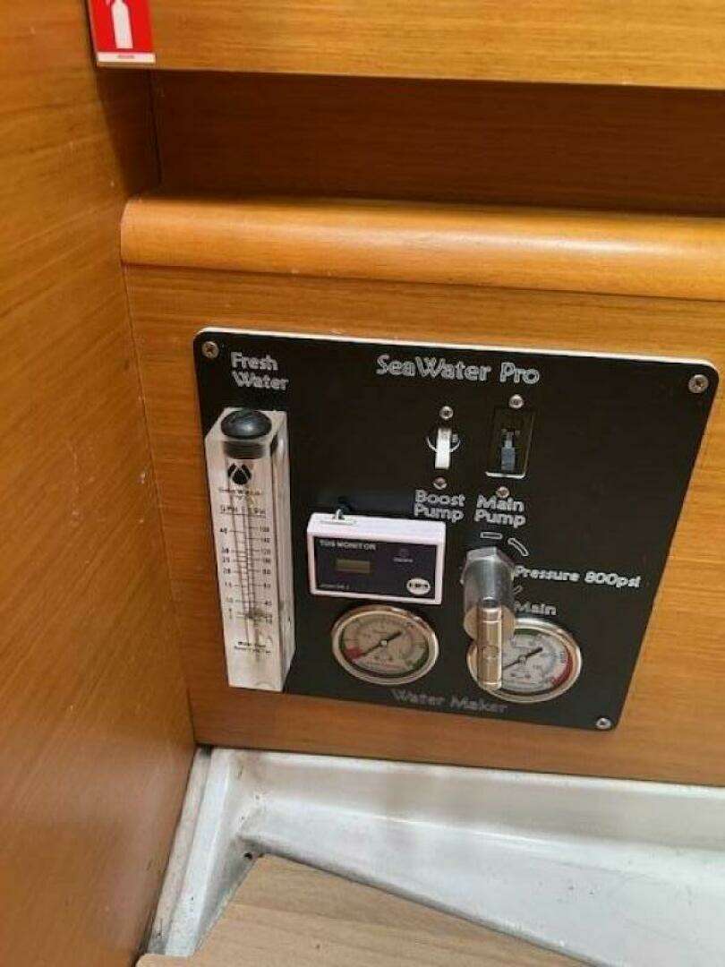 In addition to the two private cabins, the salon table converts to a double berth. For additional comfort, URKAB was ordered with an extra water tank, air conditioning, fans in the salon and all berths, shades and screens for all hatches and ports. The electrical system upgrades include an upgraded 200-amp Balmer alternator, 700 watts of flexible solar panels, a LiFePO4 battery bank, and a 60-amp solar battery charger. Equipped with a portable Dometic freezer and a Starlink satellite antenna.