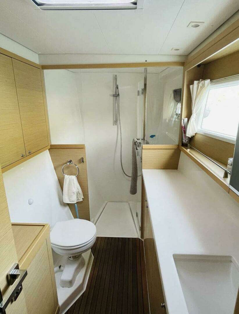 - Port hull forward cabin with double berth (2.05 m / 6’8” x 1.42 m / 4’8” at widest point)
