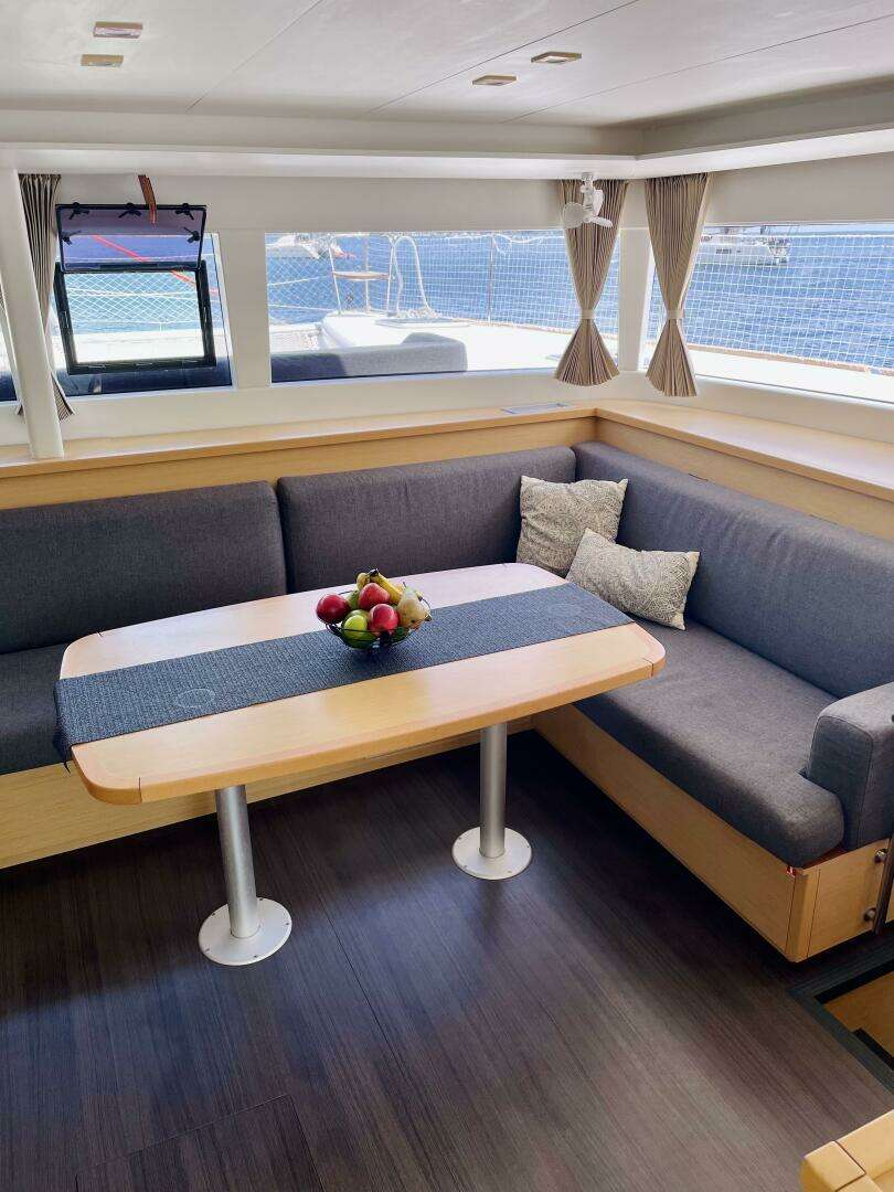 - Varnished coffee table that can be swapped with the large varnished dining table and converted to an additional double berth