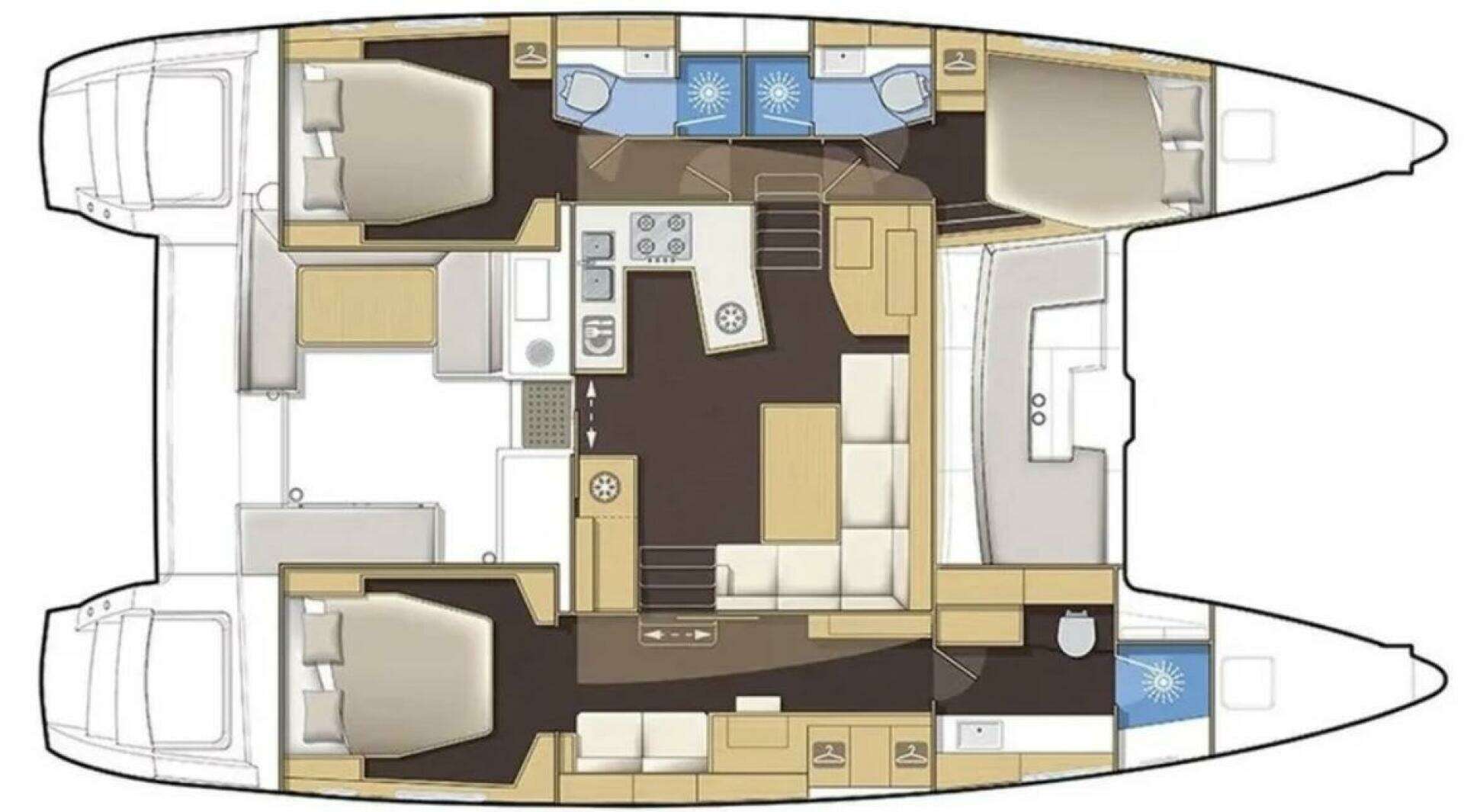 - Owners version (starboard hull) with queen-size semi-island berth (2.04 m / 6’7” x 1.60 m / 5’2” at widest point)