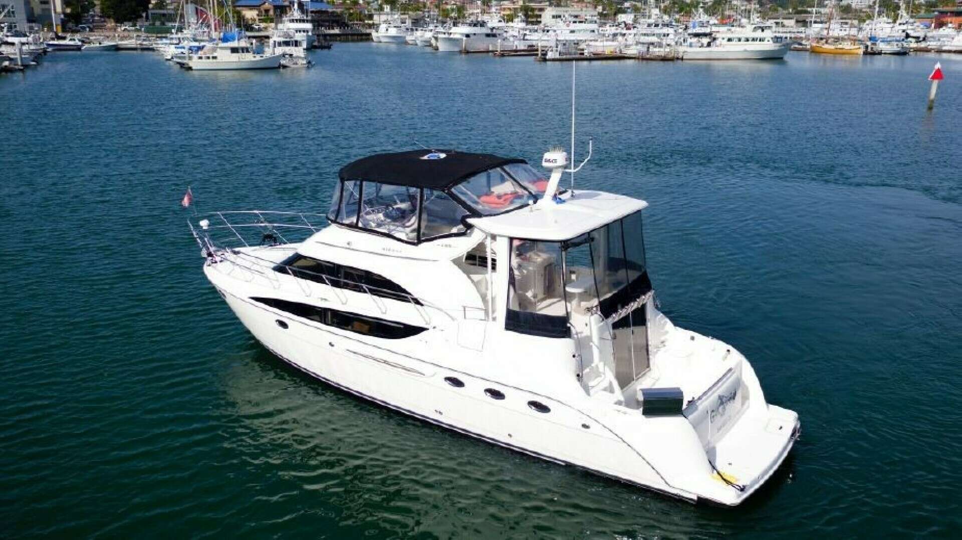The Meridian 459 is a Cockpit Motoryacht. Built on a low-deadrise hull with a wide beam, the Meridian's expansive two-stateroom interior is her most notable feature. Tiered windows provide near 360-degree visibility in the salon, and the built-in entertainment center aft includes a flat screen TV. T