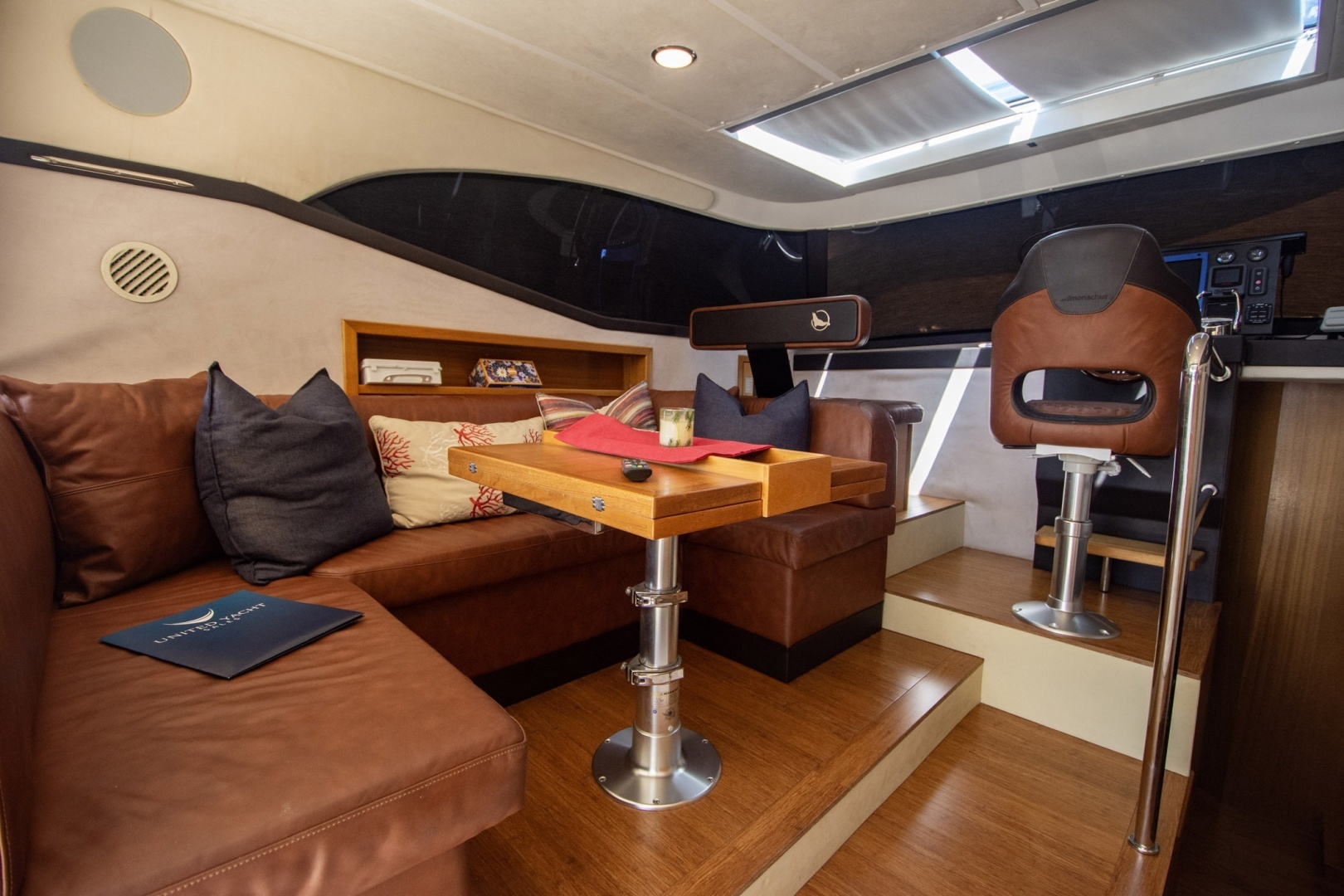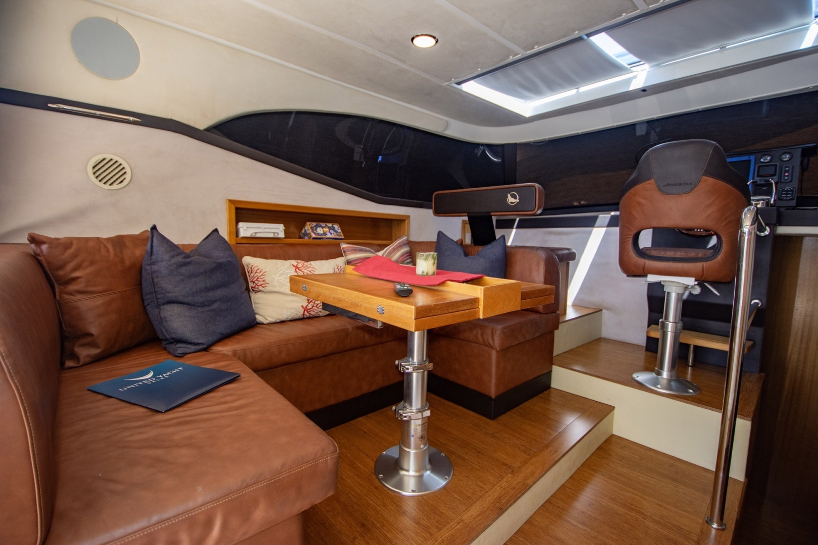 Materials: Finished in Full Teak Trim with hand-stitched Alcantara Leather seating throughout the salon.