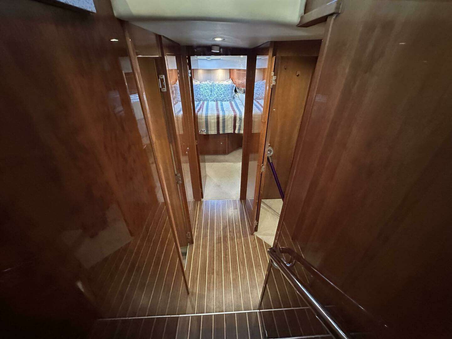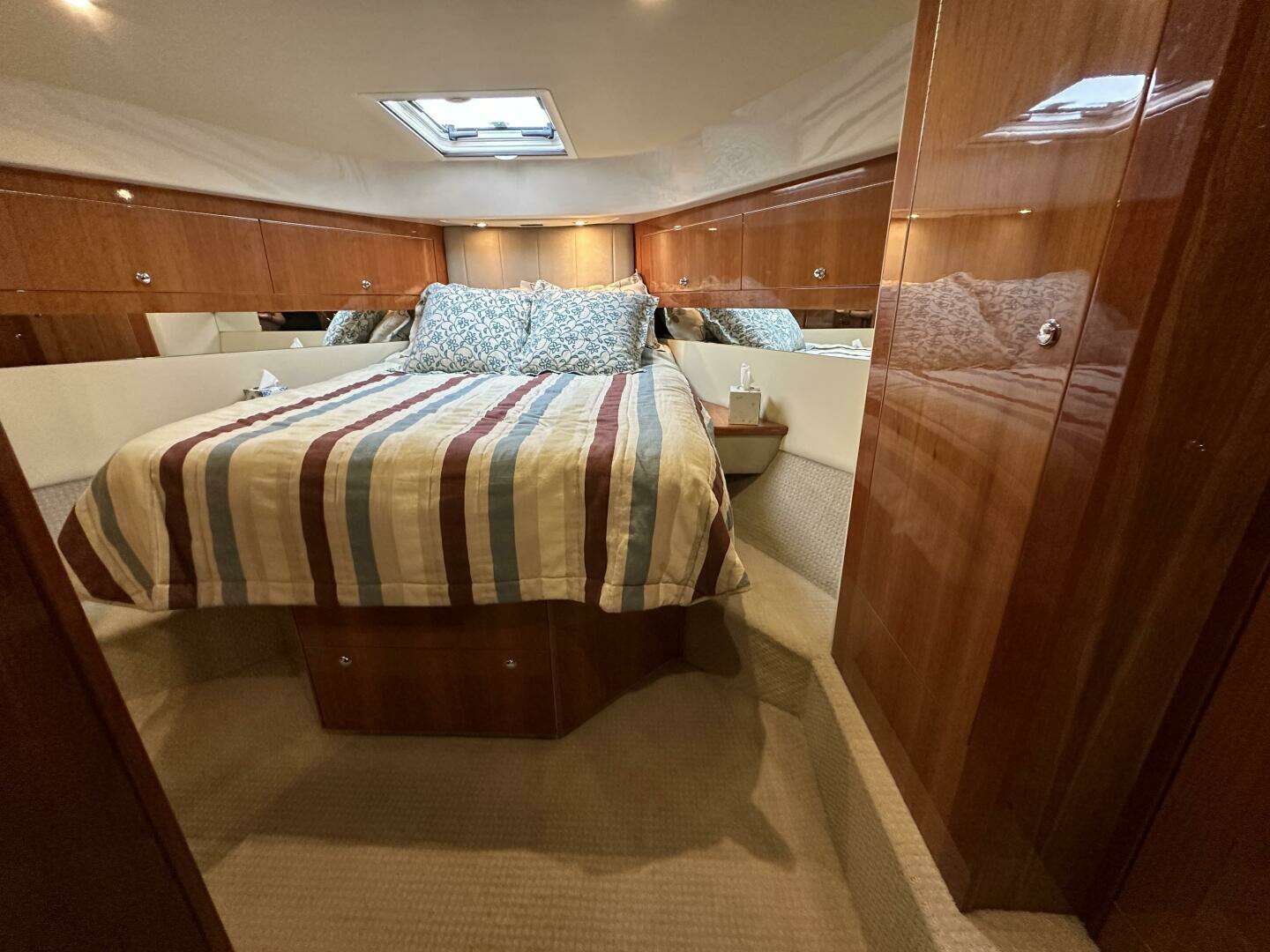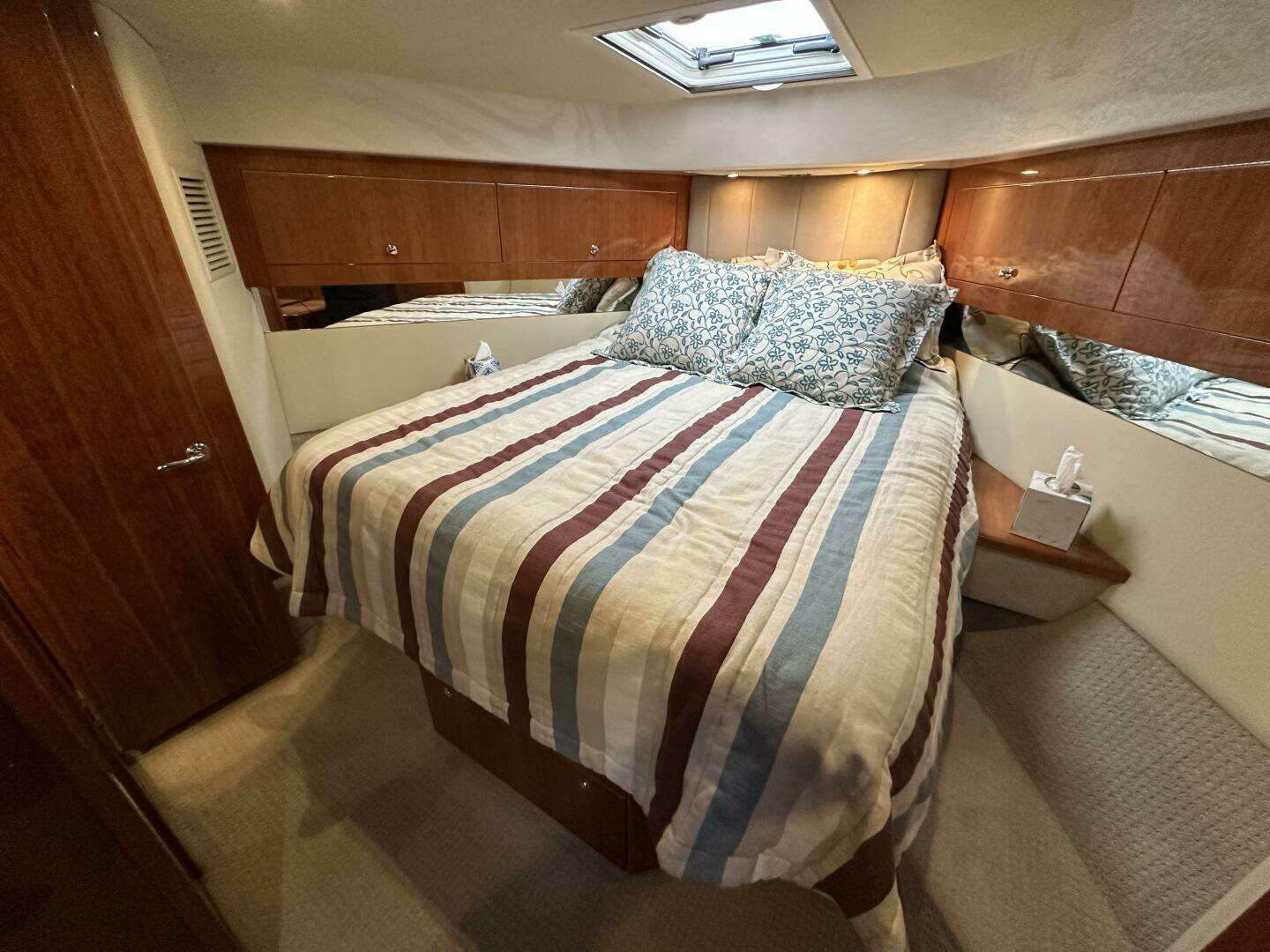 Spring Fever was custom built with a two staterooms & two full ensuite heads. The owners had the factory eliminate the standard upper/lower bunk room to starboard which provided a unique, much more spacious owners cabin forward complete with an additional storage closet & a vanity/desk.