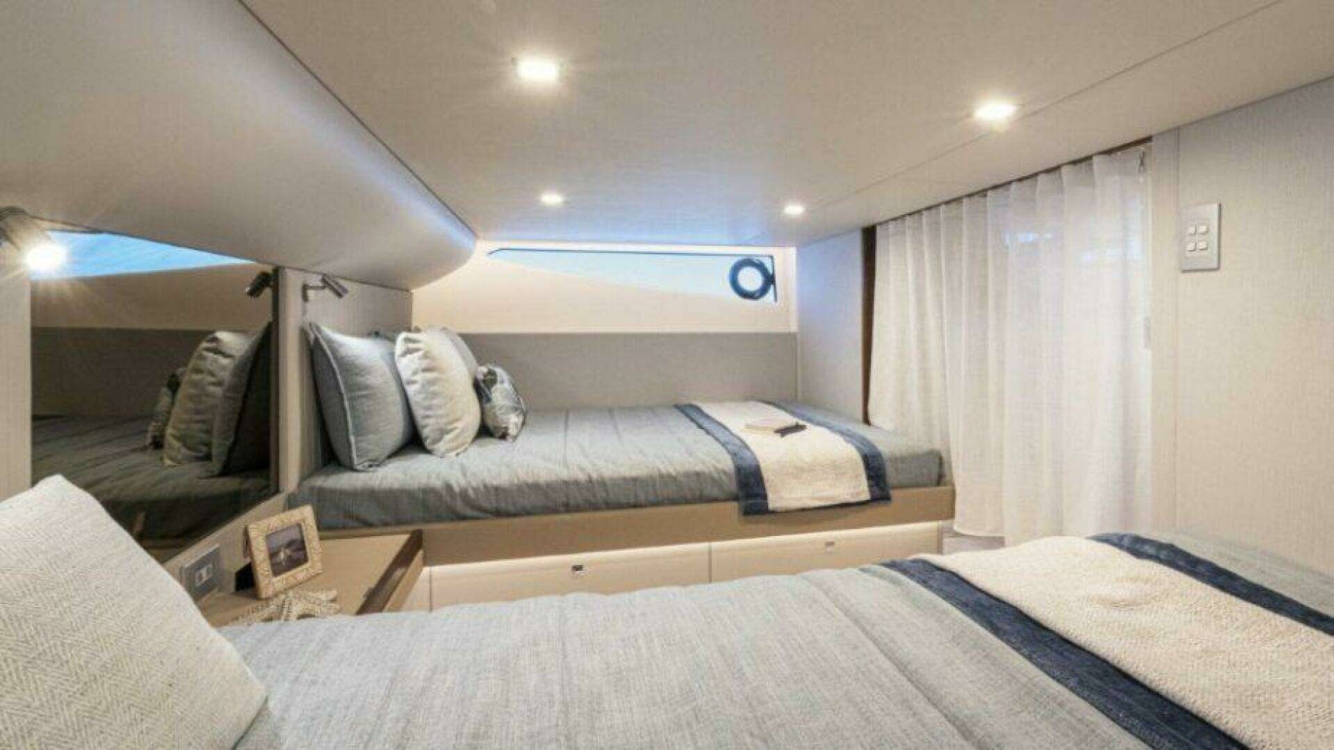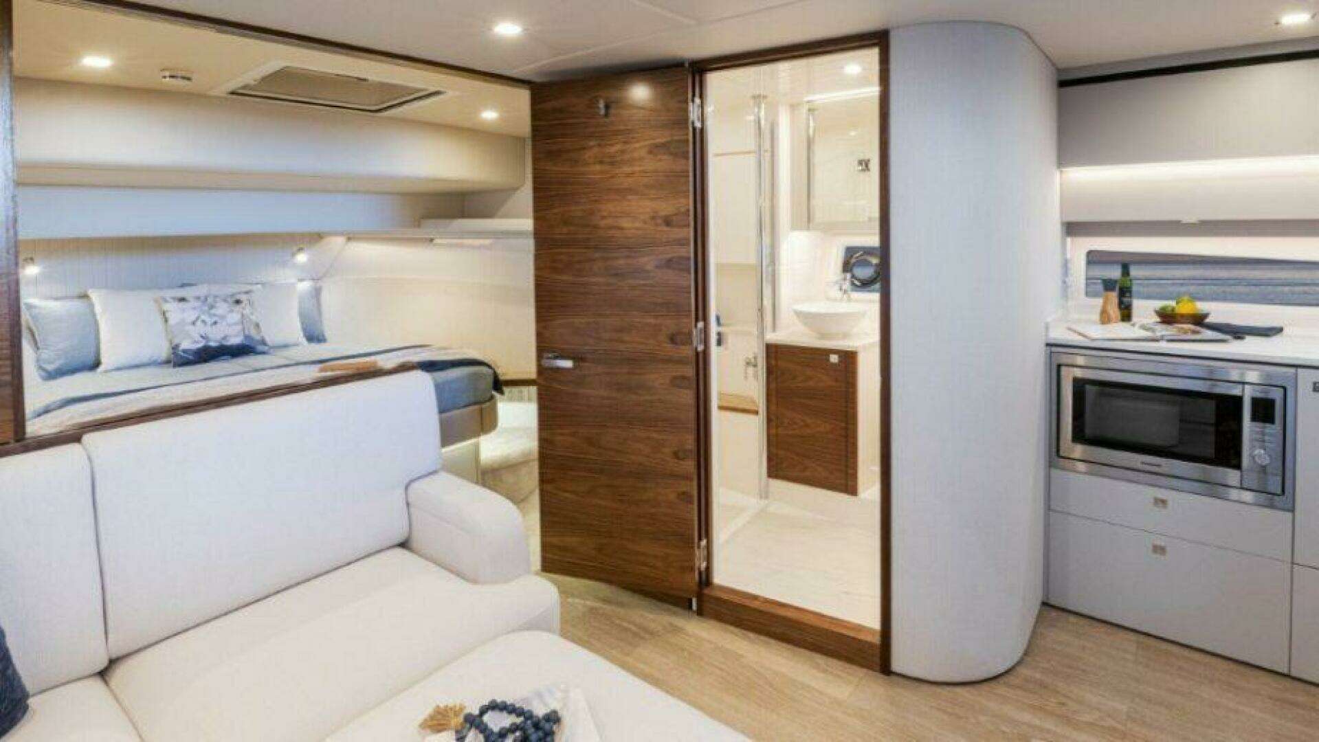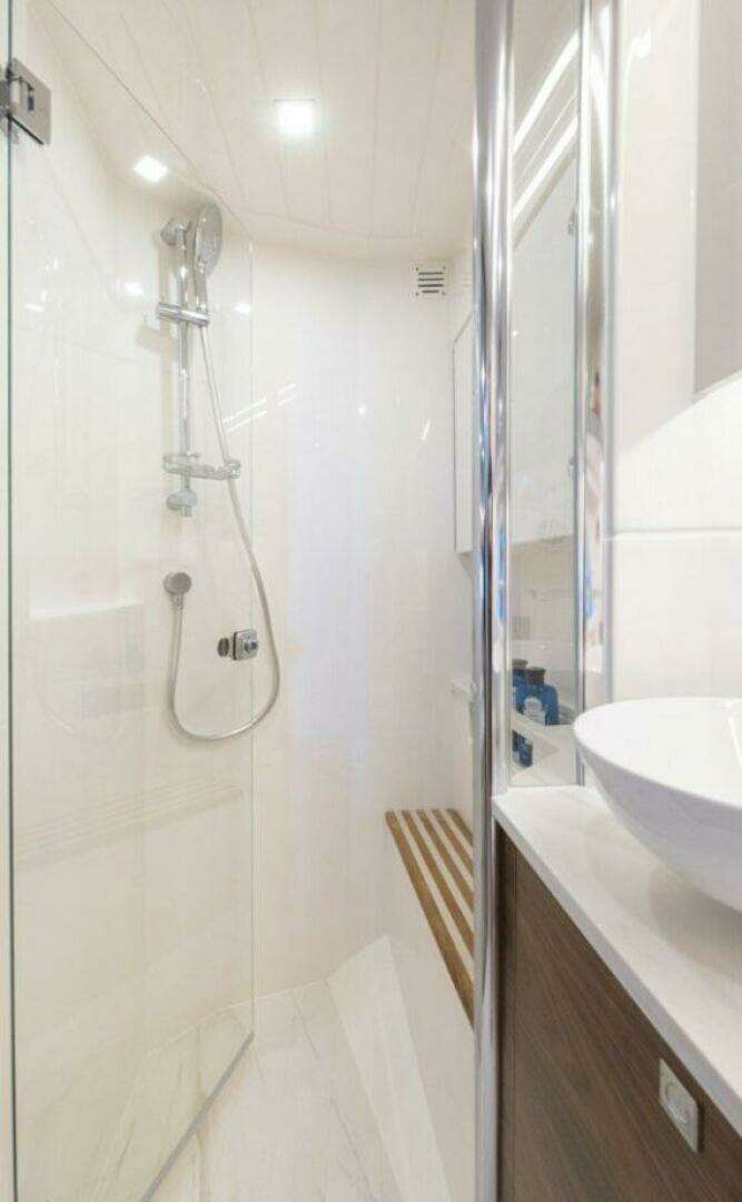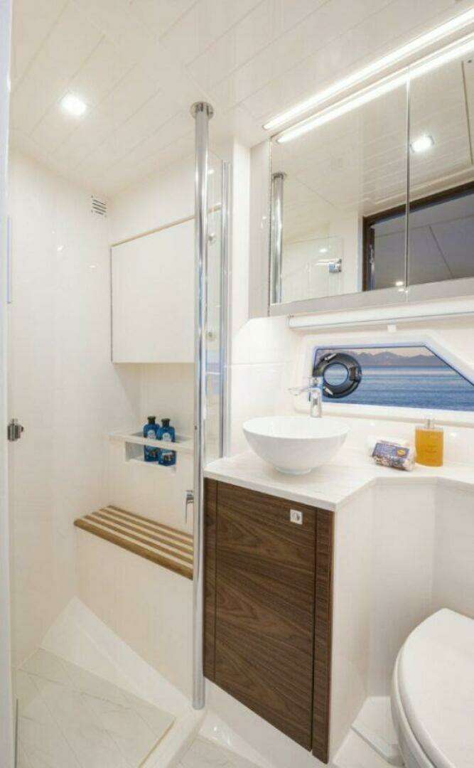Welcome to a beautiful living space filled with natural light from both the atrium of the companionway and the tinted hull windows. Here you’ll find a well-appointed main galley, a sumptuous L-shaped lounge with matching ottoman, wall-mounted LED Smart TV and handcrafted drinks cabinet. The spacious air-conditioned bathroom features a contemporary, elegant design with a separate full sized-shower and premium porcelain basin.