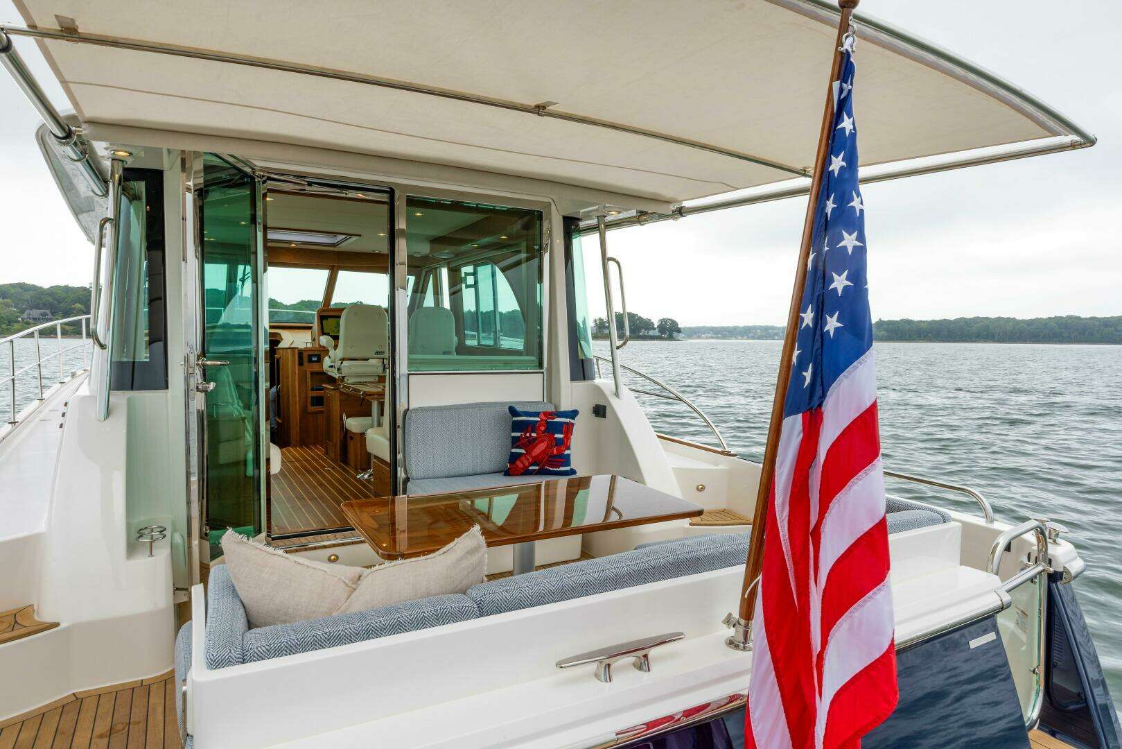 - Swing door at helm to starboard side deck.